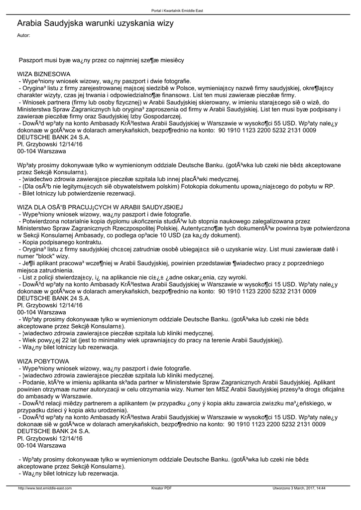 Portal i Kwartalnik Emiddle East Arabia Saudyjska warunki uzyskania wizy Autor: Paszport musi byæ wa¿ny przez co najmniej sze¶æ miesiêcy WIZA BIZNESOWA - Wype³niony wniosek wizowy, wa¿ny paszport i dwie fotografie. - Orygina³ listu z firmy zarejestrowanej maj±cej siedzibê w Polsce, wymieniaj±cy nazwê firmy saudyjskiej, okre¶laj±cy charakter wizyty, czas jej trwania i odpowiedzialno¶æ finansow±. List ten musi zawieraæ pieczêæ firmy. - Wniosek partnera (firmy lub osoby fizycznej) w Arabii Saudyjskiej skierowany, w imieniu staraj±cego siê o wizê, do Ministerstwa Spraw Zagranicznych lub orygina³ zaproszenia od firmy w Arabii Saudyjskiej. List ten musi byæ podpisany i zawieraæ pieczêæ firmy oraz Saudyjskiej Izby Gospodarczej. - Dowód wp³aty na konto Ambasady Królestwa Arabii Saudyjskiej w Warszawie w wysoko¶ci 55 USD. Wp³aty nale¿y dokonaæ w gotówce w dolarach amerykañskich, bezpo¶rednio na konto: 90 1910 1123 2200 5232 2131 0009 DEUTSCHE BANK 24 S.A. Pl. Grzybowski 12/14/16 00-104 Warszawa Wp³aty prosimy dokonywaæ tylko w wymienionym oddziale Deutsche Banku. (gotówka lub czeki nie bêd± akceptowane przez Sekcjê Konsularn±). - ¦wiadectwo zdrowia zawieraj±ce pieczêæ szpitala lub innej placówki medycznej. - (Dla osób nie legitymuj±cych siê obywatelstwem polskim) Fotokopia dokumentu upowa¿niaj±cego do pobytu w RP. - Bilet lotniczy lub potwierdzenie rezerwacji. WIZA DLA OSÓB PRACUJ¡CYCH W ARABII SAUDYJSKIEJ - Wype³niony wniosek wizowy, wa¿ny paszport i dwie fotografie. - Potwierdzona notarialnie kopia dyplomu ukoñczenia studiów lub stopnia naukowego zalegalizowana przez Ministerstwo Spraw Zagranicznych Rzeczpospolitej Polskiej. Autentyczno¶æ tych dokumentów powinna byæ potwierdzona w Sekcji Konsularnej Ambasady, co podlega op³acie 10 USD (za ka¿dy dokument). - Kopia podpisanego kontraktu. - Orygina³ listu z firmy saudyjskiej chc±cej zatrudniæ osobê ubiegaj±c± siê o uzyskanie wizy. List musi zawieraæ datê i numer "block" wizy. - Je¶li aplikant pracowa³ wcze¶niej w Arabii Saudyjskiej, powinien przedstawiæ ¶wiadectwo pracy z poprzedniego miejsca zatrudnienia. - List z policji stwierdzaj±cy, i¿ na aplikancie nie ci±¿± ¿adne oskar¿enia, czy wyroki. - Dowód wp³aty na konto Ambasady Królestwa Arabii Saudyjskiej w Warszawie w wysoko¶ci 15 USD. Wp³aty nale¿y dokonaæ w gotówce w dolarach amerykañskich, bezpo¶rednio na konto: 90 1910 1123 2200 5232 2131 0009 DEUTSCHE BANK 24 S.A. Pl. Grzybowski 12/14/16 00-104 Warszawa - Wp³aty prosimy dokonywaæ tylko w wymienionym oddziale Deutsche Banku. (gotówka lub czeki nie bêd± akceptowane przez Sekcjê Konsularn±). - ¦wiadectwo zdrowia zawieraj±ce pieczêæ szpitala lub kliniki medycznej. - Wiek powy¿ej 22 lat (jest to minimalny wiek uprawniaj±cy do pracy na terenie Arabii Saudyjskiej). - Wa¿ny bilet lotniczy lub rezerwacja. WIZA POBYTOWA - Wype³niony wniosek wizowy, wa¿ny paszport i dwie fotografie. - ¦wiadectwo zdrowia zawieraj±ce pieczêæ szpitala lub kliniki medycznej. - Podanie, które w imieniu aplikanta sk³ada partner w Ministerstwie Spraw Zagranicznych Arabii Saudyjskiej. Aplikant powinien otrzymaæ numer autoryzacji w celu otrzymania wizy. Numer ten MSZ Arabii Saudyjskiej przesy³a drog± oficjaln± do ambasady w Warszawie. - Dowód relacji miêdzy partnerem a aplikantem (w przypadku ¿ony ý kopia aktu zawarcia zwi±zku ma³¿eñskiego, w przypadku dzieci ý kopia aktu urodzenia). - Dowód wp³aty na konto Ambasady Królestwa Arabii Saudyjskiej w Warszawie w wysoko¶ci 15 USD. Wp³aty nale¿y dokonaæ siê w gotówce w dolarach amerykañskich, bezpo¶rednio na konto: 90 1910 1123 2200 5232 2131 0009 DEUTSCHE BANK 24 S.A. Pl. Grzybowski 12/14/16 00-104 Warszawa - Wp³aty prosimy dokonywaæ tylko w wymienionym oddziale Deutsche Banku. (gotówka lub czeki nie bêd± akceptowane przez Sekcjê Konsularn±). - Wa¿ny bilet lotniczy lub rezerwacja. http://www.test.emiddle-east.com Kreator PDF Utworzono 3 March, 2017, 14:44 Portal i Kwartalnik Emiddle East WIZA RODZINNA - Osoba zapraszaj±ca musi wyst±piæ z wnioskiem o zezwolenie do Ministerstwa Spraw Zagranicznych Arabii Saudyjskiej. W przypadku pozytywnego rozpatrzenia wniosku, Ministerstwo Spraw Zagranicznych wysy³a zaproszenie bezpo¶rednio do Ambasady Arabii Saudyjskiej w Warszawie. - Wype³niony wniosek wizowy, wa¿ny paszport i dwie fotografie. - Potwierdzenie pokrewieñstwa z osob± zapraszaj±c± (w przypadku ¿ony ý kopia aktu zawarcia zwi±zku ma³¿eñskiego, w przypadku dzieci ý kopia aktu urodzenia). - Dowód wp³aty na konto Ambasady Królestwa Arabii Saudyjskiej w Warszawie w wysoko¶ci 55 USD. Wp³aty nale¿y dokonaæ w gotówce w dolarach amerykañskich, bezpo¶rednio na konto: 90 1910 1123 2200 5232 2131 0009 DEUTSCHE BANK 24 S.A. Pl. Grzybowski 12/14/16 00-104 Warszawa - Wp³aty prosimy dokonywaæ tylko w wymienionym oddziale Deutsche Banku. (gotówka lub czeki nie bêd± akceptowane przez Sekcjê Konsularn±). - Numer autoryzacji i data wystawienia zaproszenia przes³anego przez Ministerstwo Spraw Zagranicznych. - Wa¿ny bilet lotniczy lub rezerwacja. WIZA TRANZYTOWA - Wype³niony wniosek wizowy, wa¿ny paszport i dwie fotografie. - Bilet do i z Arabii Saudyjskiej, przy czym pobyt na terenie Królestwa nie mo¿e przekraczaæ 48 godzin. - Wa¿na wiza do nastêpnego miejsca przeznaczenia. - Wiza tranzytowa jest zwolniona z op³at. - Przed³u¿anie wizy wielokrotnego wjazdu - Wype³niony wniosek wizowy, wa¿ny paszport i dwie fotografie. - Dla osób znajduj±cych siê pod opiek±, aplikant nie powinien przebywaæ poza granicami Królestwa d³u¿ej ni¿ czterna¶cie (14) miesiêcy. - Dowód wp³aty na konto Ambasady Królestwa Arabii Saudyjskiej w Warszawie w wysoko¶ci 15 USD. Wp³aty nale¿y dokonywaæ w gotówce w dolarach amerykañskich, bezpo¶rednio na konto: 90 1910 1123 2200 5232 2131 0009 DEUTSCHE BANK 24 S.A. Pl. Grzybowski 12/14/16 00-104 Warszawa - Wp³aty prosimy doko