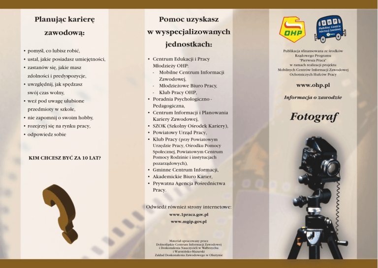 Planuj¹c karierê Pomoc uzyskasz zawodow¹: w wyspecjalizowanych jednostkach: • pomyœl, co lubisz robiæ, • ustal, jakie posiadasz umiejêtnoœci, • zastanów siê, jakie masz zdolnoœci i predyspozycje, • uwzglêdnij, jak spêdzasz swój czas wolny, • weŸ pod uwagê ulubione przedmioty w szkole, • nie zapomnij o swoim hobby, • rozejrzyj siê na rynku pracy, • odpowiedz sobie KIM CHCESZ BYÆ ZA 10 LAT? • Centrum Edukacji i Pracy M³odzie¿y OHP: - Mobilne Centrum Informacji Zawodowej, - M³odzie¿owe Biuro Pracy, - Klub Pracy OHP, • Poradnia Psychologiczno Pedagogiczna, • Centrum Informacji i Planowania Kariery Zawodowej, • SZOK (Szkolny Oœrodek Kariery), • Powiatowy Urz¹d Pracy, • Klub Pracy (przy Powiatowym Urzêdzie Pracy, Oœrodku Pomocy Spo³ecznej, Powiatowym Centrum Pomocy Rodzinie i instytucjach pozarz¹dowych), • Gminne Centrum Informacji, • Akademickie Biuro Karier, • Prywatna Agencja Poœrednictwa Pracy. OdwiedŸ równie¿ strony internetowe: www.1praca.gov.pl www.mgip.gov.pl Materia³ opracowany przez Dolnoœl¹skie Centrum Informacji Zawodowej i Doskonalenia Nauczycieli w Wa³brzychu i Warmiñsko-Mazurski Zak³ad Doskonalenia Zawodowego w Olsztynie Publikacja sfinansowana ze œrodków Rz¹dowego Programu "Pierwsza Praca" w ramach realizacji projektu Mobilnych Centrów Informacji Zawodowej Ochotniczych Hufców Pracy www.ohp.pl Informacja o zawodzie Fotograf Funkcje i zadania: Predyspozycje do zawodu: • w atelier fotograficznym lub w plenerze utrwala na papierze œwiat³oczu³ym ró¿nego rodzaju obrazy, przedstawiaj¹ce twarze, postaci, przyrodê, martw¹ naturê, produkty, które s¹ przedmiotami reklamy, a nawet œlady pope³nionych przestêpstw; • indywidualnoœæ: utrwalaj¹c obrazy fotograf musi wykazaæ siê wyobraŸni¹, wyczuciem kompozycji, umiejêtnoœci¹ ró¿norodnego patrzenia na t¹ sam¹ rzecz; • wykonuje zdjêcia na zlecenie ró¿nych wydawnictw, które s¹ wykorzystywane w gazetach, czasopismach, folderach, itp.; • wybiera odpowiednie materia³y fotograficzne; • pos³uguje siê ró¿nymi typami aparatów fotograficznych, urz¹dzeniami oœwietlaj¹cymi i b³yskowymi oraz œwiat³omierzami przy wykonywaniu zdjêæ; • przygotowuje odczynniki, oblicza i sporz¹dza receptury roztworów stosowanych w obróbce materia³ów œwiat³oczu³ych; • sporz¹dza odbitki i powiêkszenia wykonywanych zdjêæ; • bezkonfliktowoœæ: kontakty z ludŸmi s¹ czêste i intensywne, dlatego nios¹ ze sob¹ ryzyko konfliktów; • dyspozycyjnoœæ: fotograf pracuje w ró¿nych miejscach, w godzinach, które zale¿¹ od indywidualnego ustalenia czasu pracy; • profesjonalizm; • niezale¿noœæ; • dociekliwoœæ, zwi¹zan¹ z chêci¹ pog³êbiania informacji o najnowszych trendach w fotografii; • zdolnoœæ podejmowania szybkich i trafnych decyzji; • dobry stan zdrowia. Wiêcej szczegó³ów znajdziesz w teczce informacji o zawodzie Mo¿liwoœci zdobycia zawodu: Wskazane jest wykszta³cenie techniczne, specjalizacja - fotografia. Wa¿ne jest, aby osoba pracuj¹ca w zawodzie zna³a siê na fotografowaniu. Umiejêtnoœci zwi¹zane z zawodem mo¿na równie¿ zdobyæ na kursach fotograficznych i obs³ugi sprzêtu fotograficznego. Dodatkowym atutem mo¿e byæ posiadanie prawa jazdy na samochody osobowe.