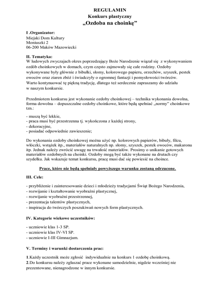 REGULAMIN Konkurs plastyczny „Ozdoba na choinkę” I .Organizator: Miejski Dom Kultury Moniuszki 2 06-200 Maków Mazowiecki II. Tematyka: W ludowych zwyczajach okres poprzedzający Boże Narodzenie wiązał się z wykonywaniem ozdób choinkowych w domach, czym często zajmowały się całe rodziny. Ozdoby wykonywane były głównie z bibułki, słomy, kolorowego papieru, orzechów, szyszek, pestek owoców oraz ziaren zbóż i świadczyły o ogromnej fantazji i pomysłowości twórców. Warto kontynuować tę piękną tradycję, dlatego też serdecznie zapraszamy do udziału w naszym konkursie. Przedmiotem konkursu jest wykonanie ozdoby choinkowej – technika wykonania dowolna, forma dowolna – dopuszczalne ozdoby choinkowe, które będą spełniać „normy” choinkowe tzn.: - muszą być lekkie, - praca musi być przestrzenna tj. wykończona z każdej strony, - dekoracyjne, - posiadać odpowiednie zawieszenie; Do wykonania ozdoby choinkowej można użyć np. kolorowych papierów, bibuły, filcu, włóczki, wstążek itp., materiałów naturalnych np. słomy, szyszek, pestek owoców, makaronu itp. Jednak należy zwrócić uwagę na trwałość materiałów. Prosimy o unikanie gotowych materiałów ozdobnych na choinki. Ozdoby mogą być także wykonane na drutach czy szydełku. Jak wskazuje temat konkursu, pracę musi dać się powiesić na choince. Prace, które nie będą spełniały powyższego warunku zostaną odrzucone. III. Cele: - przybliżenie i zainteresowanie dzieci i młodzieży tradycjami Świąt Bożego Narodzenia, - rozwijanie i kształtowanie wyobraźni plastycznej, - rozwijanie wyobraźni przestrzennej, - prezentacja talentów plastycznych, - inspiracja do twórczych poszukiwań nowych form plastycznych. IV. Kategorie wiekowe uczestników: - uczniowie klas 1-3 SP. - uczniowie klas IV-VI SP. - uczniowie I-III Gimnazjum. V. Terminy i warunki dostarczenia prac: 1.Każdy uczestnik może zgłosić indywidualnie na konkurs 1 ozdobę choinkową. 2.Do konkursu należy zgłaszać prace wykonane samodzielnie, nigdzie wcześniej nie prezentowane, nienagrodzone w innym konkursie. 3.Prace należy dostarczyć do siedziby organizatora w terminie do 09.12.2015r. do godziny 16.00 do koordynatora konkursu, którym jest Anna Winiarek. 4.Ozdoby choinkowe zgłaszane na konkurs muszą zawierać przymocowaną w sposób trwały wizytówkę zawierającą następujące dane: -imię i nazwisko autora; 5.Dodatkowo do każdej pracy prosimy o załączenie karty zgłoszeń zawierających następujące dane: -imię i nazwisko autora; -wiek/klasa; -nazwę przedszkola lub szkoły -telefon kontaktowy; -zgodę na przetwarzanie danych osobowych; 6.Prace konkursowe bez wizytówek i karty zgłoszeń nie będą brały udziału w konkursie. 7.Termin rozstrzygnięcia konkursu: 12.12.2016 r. VI. Ogłoszenie wyników i wręczenie nagród: 1.Ogłoszenie wyników i wręczenie nagród nastąpi podczas Wigilii Miejskiej na Rynku w Makowie Mazowieckim w terminie: 15.12.2016 r. VII. Ocena i kryterium oceny prac: 1. Oceny prac dokona powołane przez Organizatora jury. Werdykt jury będzie ostateczny. 2. Jury przyzna nagrody z podziałem na kategorie wiekowe. 3.Organizator przewiduje przyznanie nagród w każdej kategorii wiekowej dla I, II, III miejsca i nagrody wyróżnienia, chyba że werdykt jury będzie inny. 4. Nagrody rzeczowe nie podlegają zamianie na ich równowartość pieniężną. 5.Kryteria oceny prac: -nawiązanie do tradycji świątecznej, -pomysłowość i oryginalność, -technika wykonania, -estetyka i staranność wykonania, -materiał użyty do wykonania pracy, -nakład pracy włożony w wykonanie ozdoby, -zgodność pracy z założeniami konkursy. 6. Prace złożone na konkurs nie są zwracane uczestnikom. Wszystkie prace biorące udział w konkursie zostaną zaprezentowane na choince w MDK. Zgłaszając prace do konkursu, Uczestnik akceptuje niniejszy regulamin i jednocześnie potwierdza, że dane prace są jego własnością, zezwala na publikację. Załącznik Karta zgłoszeniowa Imię i nazwisko …………………………………………………………………………………………… Wiek/klasa …………………………………………………………………………………………… Nazwa przedszkola/szkoły …………………………………………………………………………………………… Telefon kontaktowy …………………………………………………………………………………………… Zgoda na przetwarzanie danych: Ja niżej podpisany(a) wyrażam zgodę na przetwarzanie moich danych osobowych, podanych w niniejszym oświadczeniu przez Miejski Dom Kultury Moniuszki 2, 06-200 Maków Mazowiecki. dla celów związanych z konkursem plastycznym „Ozdoba na choinkę” i wykorzystaniem dostarczonych prac. ……………………………….. miejscowość, data ……..……………… podpis opiekuna