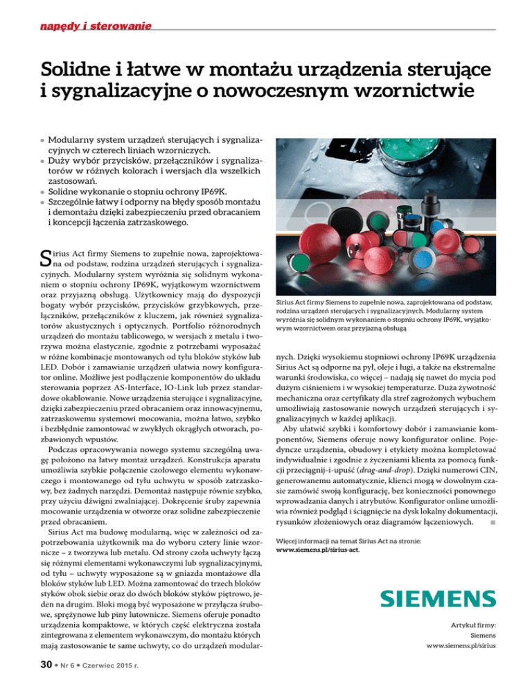 Solidne i łatwe w montażu urządzenia sterujące i sygnalizacyjne o nowoczesnym wzornictwie zz Modularny system urządzeń sterujących i sygnalizacyjnych w czterech liniach wzorniczych. zz Duży wybór przycisków, przełączników i sygnalizatorów w różnych kolorach i wersjach dla wszelkich zastosowań. zz Solidne wykonanie o stopniu ochrony IP69K. zz Szczególnie łatwy i odporny na błędy sposób montażu i demontażu dzięki zabezpieczeniu przed obracaniem i koncepcji łączenia zatrzaskowego. S irius Act firmy Siemens to zupełnie nowa, zaprojektowana od podstaw, rodzina urządzeń sterujących i sygnalizacyjnych. Modularny system wyróżnia się solidnym wykonaniem o stopniu ochrony IP69K, wyjątkowym wzornictwem oraz przyjazną obsługą. Użytkownicy mają do dyspozycji bogaty wybór przycisków, przycisków grzybkowych, przełączników, przełączników z kluczem, jak również sygnalizatorów akustycznych i optycznych. Portfolio różnorodnych urządzeń do montażu tablicowego, w wersjach z metalu i tworzywa można elastycznie, zgodnie z potrzebami wyposażać w różne kombinacje montowanych od tyłu bloków styków lub LED. Dobór i zamawianie urządzeń ułatwia nowy konfigurator online. Możliwe jest podłączenie komponentów do układu sterowania poprzez AS-Interface, IO-Link lub przez standardowe okablowanie. Nowe urządzenia sterujące i sygnalizacyjne, dzięki zabezpieczeniu przed obracaniem oraz innowacyjnemu, zatrzaskowemu systemowi mocowania, można łatwo, szybko i bezbłędnie zamontować w zwykłych okrągłych otworach, pozbawionych wpustów. Podczas opracowywania nowego systemu szczególną uwagę położono na łatwy montaż urządzeń. Konstrukcja aparatu umożliwia szybkie połączenie czołowego elementu wykonawczego i montowanego od tyłu uchwytu w sposób zatrzaskowy, bez żadnych narzędzi. Demontaż następuje równie szybko, przy użyciu dźwigni zwalniającej. Dokręcenie śruby zapewnia mocowanie urządzenia w otworze oraz solidne zabezpieczenie przed obracaniem. Sirius Act ma budowę modularną, więc w zależności od zapotrzebowania użytkownik ma do wyboru cztery linie wzornicze – z tworzywa lub metalu. Od strony czoła uchwyty łączą się różnymi elementami wykonawczymi lub sygnalizacyjnymi, od tyłu – uchwyty wyposażone są w gniazda montażowe dla bloków styków lub LED. Można zamontować do trzech bloków styków obok siebie oraz do dwóch bloków styków piętrowo, jeden na drugim. Bloki mogą być wyposażone w przyłącza śrubowe, sprężynowe lub piny lutownicze. Siemens oferuje ponadto urządzenia kompaktowe, w których część elektryczna została zintegrowana z elementem wykonawczym, do montażu których mają zastosowanie te same uchwyty, co do urządzeń modular- 30 l Nr 6 l Czerwiec 2015 r. Sirius Act firmy Siemens to zupełnie nowa, zaprojektowana od podstaw, rodzina urządzeń sterujących i sygnalizacyjnych. Modularny system wyróżnia się solidnym wykonaniem o stopniu ochrony IP69K, wyjątkowym wzornictwem oraz przyjazną obsługą nych. Dzięki wysokiemu stopniowi ochrony IP69K urządzenia Sirius Act są odporne na pył, oleje i ługi, a także na ekstremalne warunki środowiska, co więcej – nadają się nawet do mycia pod dużym ciśnieniem i w wysokiej temperaturze. Duża żywotność mechaniczna oraz certyfikaty dla stref zagrożonych wybuchem umożliwiają zastosowanie nowych urządzeń sterujących i sygnalizacyjnych w każdej aplikacji. Aby ułatwić szybki i komfortowy dobór i zamawianie komponentów, Siemens oferuje nowy konfigurator online. Pojedyncze urządzenia, obudowy i etykiety można kompletować indywidualnie i zgodnie z życzeniami klienta za pomocą funkcji przeciągnij-i-upuść (drag-and-drop). Dzięki numerowi CIN, generowanemu automatycznie, klienci mogą w dowolnym czasie zamówić swoją konfigurację, bez konieczności ponownego wprowadzania danych i atrybutów. Konfigurator online umożliwia również podgląd i ściągnięcie na dysk lokalny dokumentacji, rysunków złożeniowych oraz diagramów łączeniowych. n Więcej informacji na temat Sirius Act na stronie: www.siemens.pl/sirius-act. Artykuł firmy: Siemens www.siemens.pl/sirius