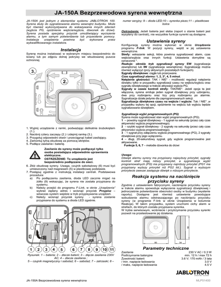 JA-150A Bezprzewodowa syrena wewnętrzna JA-150A jest jednym z elementów systemu JABLOTRON 100. Syrena służy do sygnalizowania alarmu wewnątrz budynku. Może być również wykorzystywana do wskazywania innych zdarzeń (wyjścia PG, opóźnienie wejścia/wyjścia, dzwonek do drzwi). Syrena posiada specjalny przycisk umożliwiający wyciszenie alarmu, a tym samym potwierdzenie lub przywołanie pomocy. Instalacja urządzenia powinna być wykonana przez wykwalifikowanego instalatora. Instalacja Syrenę można instalować w wybranym miejscu bezpośrednio do ściany lub po zdjęciu dolnej pokrywy we wbudowanej puszce ochronnej. 1. Wyjmij urządzenie z ramki, podważając delikatnie śrubokrętem (1.). 2. Naciśnij cztery zaczepy (2.) i zdejmij ramkę (3.). 3. Przygotuj odpowiedni otwór i przeciągnąć kabel zasilający. 4. Zamontuj tylną obudowę za pomocą wkrętów. 5. Podłącz zasilanie i baterię. Zasilanie do syreny może podłączyć tylko osoba posiadająca odpowiednie uprawnienia elektryczne. OSTRZEŻENIE: To urządzenie jest bezpośrednio podłączane do sieci. 6. Złóż obudowę syreny. Uwaga, czujnik sabotażowy (6) musi być umieszczony nad magnesem (5) w plastikowej podstawie. 7. Postępuj zgodnie z instrukcją instalacji centrali. Podstawowa procedura: a) Po podłączeniu zasilania, dioda LED zacznie migać na żółto (9) wskazując, że syrena nie została przypisana do systemu. b) Należy przejść do programu F-Link, w oknie „Urządzenia” wybrać żądany adres i wcisnąć przycisk Przypisz – wówczas system wejdzie w tryb przypisywania urządzeń. c) Należy wcisnąć przycisk syreny - syrena zostanie przypisana do systemu a dioda LED zgaśnie. numer seryjny; 9 – dioda LED;10 – syrenka piezo;11 – plastikowe bolce Ostrzeżenie: Jeżeli bateria jest słaba (raport o stanie baterii jest wysyłany do centrali), nie wszystkie funkcje syrenki są dostępne. Ustawienia syreny Konfigurację syreny można wykonać w oknie Urządzenia programu F-link. W pozycji syreny, wejdź w jej ustawienia wewnętrzne. Strefy: wskazanie sekcji, która powinna sygnalizować alarm, czas wejścia/wyjścia oraz innych funkcji. Ustawienia domyślne są oznaczone *. Reakcje: określa tryb sygnalizacji syreny EW (sygnalizacja zewnętrzna) lub IW (sygnalizacja wewnętrzna). Sygnalizację można również wyłączyć (przy aktywnych pozostałych funkcjach). Sygnały dźwiękowe: ciągłe lub przerywane. Czas sygnalizacji alarmu: 1, 2, 3*, 4, 5 minut. Natężenie głośności: TAK / NIE* - możliwość regulacji natężenia dźwięku tylko w przypadku sygnalizacji czasu na wejściu/wyjściu oraz sygnału dźwiękowego w trakcie aktywacji wyjścia PG. Sygnały w czasie kontroli strefy: TAK/NIE*. Jeżeli opcja ta jest włączona, syrena emituje jeden sygnał dźwiękowy przy uzbrojeniu, dwa przy rozbrojeniu oraz trzy przy rozbrojeniu po alarmie. Sygnalizacja działa jedynie dla zaprogramowanych sekcji. Sygnalizacja dźwiękowa czasu na wejście i wyjście: Tak / NIE* ,w przypadku wyboru tej opcji, opóźnienie na wejściu lub wyjściu będzie sygnalizowane dźwiękiem. Sygnalizacja wyjść programowalnych (PG) Syrena może sygnalizować stan wyjść programowalnych (PG). 1 – powolny sygnał dźwiękowy - 1 sygnał na sekundę (przez cały czas aktywności wyjścia programowalnego). 2 – szybki sygnał dźwiękowy - 2 sygnały na sekundę (przez cały czas aktywności wyjścia programowalnego). 3 - 1 sygnał przy załączeniu wyjścia programowalnego (PG), 2 sygnały dźwiękowe przy jego wyłączeniu. 4 – długi, 20-sekundowy sygnał, gdy wyjście programowalne jest aktywowane. Funkcje 5, 6, 7 – melodie dzwonka do drzwi Uwaga: Dźwięk alarmu syreny ma przypisany najwyższy priorytet, sygnały kontroli stref mają niższy priorytet, a sygnalizacja wyjść programowalnych (PG) ma przypisany najniższy priorytet (PG1 ma przypisany wyższy priorytet niż PG2 itd.). Sygnał o wyższym priorytecie zawsze zastępuje dźwięk o niższym priorytecie. Reakcja systemu na naciśnięcie przycisku syreny Zgodnie z ustawieniem fabrycznymi, naciśnięcie przycisku syreny w trakcie alarmu spowoduje wyłączenie sygnalizacji dźwiękowej i jednocześnie potwierdzenie obecności osoby w budynku (wysłanie raportu). Dostępne jest również ustawienie powodujące wzbudzenie alarmu odstraszającego po naciśnięciu przycisku syreny (w programie F-link w oknie Urządzenia w kolumnie Reakcja). W takim przypadku, system uruchomi cichy alarm w strefach, do których została przypisana syrenka. W trybie serwisowym, wciśniecie i przytrzymanie przycisku syrenki pozwoli na przetestowanie jej działania. Parametry techniczne Rysunek: 1 – bateria; 2 – złacze baterii; 3 – złącze zasilania 230V AC; 4 – złacze zasilania ; 5 – czujnik magnetyczny i sabotaż; 6 – sabotaż; 7 – zatrzaski; 8 – JA-150A Bezprzewodowa syrena wewnętrzna Zasilanie Podtrzymanie bateryjne Żywotność baterii / min. napięcie ładowania / maks, napięcie ładowania 230 V AC / 0.3 W min. 12 h / max 72 h 3.6 V; 170 mAh / 3 lata 3.0 V 4.5 V MLP51400 JA-150A Bezprzewodowa syrena wewnętrzna Częstotliwość komunikacji 868.1 MHz, protokół JABLOTRON Zasięg komunikacji ok. 300 m (teren niezabudowany) Syrena piezo electric, 85 dB/m Wymiary 90 x 90 x 35 mm Klasa Klasa II Zgodny z EN 50131-1, EN 50131-3 Środowisko pracy zgodne z EN 50131-1 II. Wew. Temperatura pracy -10 do +40 °C Zgodny również z EN 50130-4, EN 55022, EN 60950-1 Może być stosowany zgodnie z ERC REC 70-03 JABLOTRON ALARMS niniejszym deklaruje, że urządzenie JA-150A spełnia wszystkie wymogi normy 1999/5/WE. Oryginał deklaracji zgodności jest dostępny na stronie internetowej www.jablotron.com Uwaga: Pomimo, ze produkt nie zawiera żadnych niebezpiecznych materiałów, po zakończeniu użytkowania produktu, prosimy o jego zwrot do producenta lub dystrybutora. JA-150A Bezprzewodowa syrena wewnętrzna MLP51400