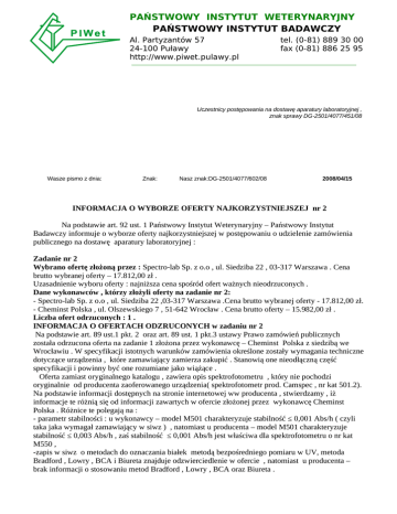 PAŃSTWOWY INSTYTUT WETERYNARYJNY PAŃSTWOWY INSTYTUT BADAWCZY Al. Partyzantów 57 24-100 Puławy http://www.piwet.pulawy.pl tel. (0-81) 889 30 00 fax (0-81) 886 25 95 Uczestnicy postępowania na dostawę aparatury laboratoryjnej , znak sprawy DG-2501/4077/451/08 Wasze pismo z dnia: Znak: Nasz znak:DG-2501/4077/602/08 2008/04/15 INFORMACJA O WYBORZE OFERTY NAJKORZYSTNIEJSZEJ nr 2 Na podstawie art. 92 ust. 1 Państwowy Instytut Weterynaryjny – Państwowy Instytut Badawczy informuje o wyborze oferty najkorzystniejszej w postępowaniu o udzielenie zamówienia publicznego na dostawę aparatury laboratoryjnej : Zadanie nr 2 Wybrano ofertę złożoną przez : Spectro-lab Sp. z o.o , ul. Siedziba 22 , 03-317 Warszawa . Cena brutto wybranej oferty – 17.812,00 zł . Uzasadnienie wyboru oferty : najniższa cena spośród ofert ważnych nieodrzuconych . Dane wykonawców , którzy złożyli oferty na zadanie nr 2: - Spectro-lab Sp. z o.o , ul. Siedziba 22 ,03-317 Warszawa .Cena brutto wybranej oferty - 17.812,00 zł. - Cheminst Polska , ul. Olszewskiego 7 , 51-642 Wrocław . Cena brutto oferty – 15.982,00 zł . Liczba ofert odrzuconych : 1 . INFORMACJA O OFERTACH ODZRUCONYCH w zadaniu nr 2 Na podstawie art. 89 ust.1 pkt. 2 oraz art. 89 ust. 1 pkt.3 ustawy Prawo zamówień publicznych została odrzucona oferta na zadanie 1 złożona przez wykonawcę – Cheminst Polska z siedzibą we Wrocławiu . W specyfikacji istotnych warunków zamówienia określone zostały wymagania techniczne dotyczące urządzenia , które zamawiający zamierza zakupić . Stanowią one nieodłączną część specyfikacji i powinny być one rozumiane jako wiążące . Oferta zamiast oryginalnego katalogu , zawiera opis spektrofotometru , który nie pochodzi oryginalnie od producenta zaoferowanego urządzenia( spektrofotometr prod. Camspec , nr kat 501.2). Na podstawie informacji dostępnych na stronie internetowej ww producenta , stwierdzamy , iż informacje te różnią się od informacji zawartych w ofercie złożonej przez wykonawcę Cheminst Polska . Różnice te polegają na : - parametr stabilności : u wykonawcy – model M501 charakteryzuje stabilność ≤ 0,001 Abs/h ( czyli taka jaka wymagał zamawiający w siwz ) , natomiast u producenta – model M501 charakteryzuje stabilność ≤ 0,003 Abs/h , zaś stabilność ≤ 0,001 Abs/h jest właściwa dla spektrofotometru o nr kat M550 , -zapis w siwz o metodach do oznaczania białek metodą bezpośredniego pomiaru w UV, metoda Bradford , Lowry , BCA i Biureta znajduje odzwierciedlenie w ofercie , natomiast u producenta – brak informacji o stosowaniu metod Bradford , Lowry , BCA oraz Biureta . W związku z powyższym oferta wykonawcy Cheminst Polska , ul. Olszewskiego 7 , 51-042 Wrocław nie spełnia wymagań specyfikacji istotnych warunków zamówienia i podlega odrzuceniu na podstawie art. 89 ust.1 pkt. 2 ustawy PZP . Oferta ta podlega również odrzuceniu na mocy art. 89 ust.1 pkt.3 uPZP w związku z podaniem nieprawdziwych danych i wprowadzenia w błąd zamawiającego w celu uzyskania przedmiotowego zamówienia . Niedopuszczalnym jest w świetle przepisów obowiązującego prawa fałszowanie danych technicznych w celu uzyskania korzyści majątkowej , stanowi to pogwałcenie zasad uczciwej konkurencji i może narazić zamawiającego na straty . Zadanie nr 7 Wybrano ofertę złożoną przez : Polygen Sp. z o.o , ul.Gołnowska 6 , 54-315 Wrocław . Cena brutto wybranej oferty –30.256,00 zł . Uzasadnienie wyboru oferty : najniższa cena. Dane wykonawców , którzy złożyli oferty na zadanie nr 7 : - Polygen Sp. z o.o , ul.Gołnowska 6 , 54-315 Wrocław . Cena brutto oferty –30.256,00 zł . Brak ofert odrzuconych . Zadanie nr 8 Wybrano ofertę złożoną przez : Polygen Sp. z o.o , ul.Gołnowska 6 , 54-315 Wrocław . Cena brutto wybranej oferty – 4.270,00 zł . Uzasadnienie wyboru oferty : najniższa cena. Dane wykonawców , którzy złożyli oferty na zadanie nr 8 : - Polygen Sp. z o.o , ul.Gołnowska 6 , 54-315 Wrocław . Cena brutto oferty – 4.270,00 zł . - Meranco Aparatura Kontrolno-Pomiarowa i Laboratoryjna sp. z o.o , ul. Myśliborska 89 , 60-432 Poznań . Cena brutto wybranej oferty – 6.270,00 zł . - Labsystem s.c , Ul. dobrego Pasterza 100 , 31-416 Kraków. Cena brutto oferty – 5.724,50 zł . Brak ofert odrzuconych . Zadanie nr 3 Wybrano ofertę złożoną przez : Merck Sp. z o.o , al. Jerozolimskie 178 , 02-486 Warszawa . Cena brutto wybranej oferty – 3.140,31 zł . Uzasadnienie wyboru oferty : najniższa cena. Dane wykonawców , którzy złożyli oferty na zadanie nr 3 : - Merck Sp. z o.o , al. Jerozolimskie 178 , 02-486 Warszawa . Cena brutto oferty – 3.140,31 zł . - Idalia sp.j , ul. Zubrzyckiego 10 , 26-610 Radom . Cena brutto oferty – 6.319,60 zł . - Donserv , ul. Globusowa 38 , 02-436 Warszawa . cena brutto oferty – 4.697,00 zł . Brak ofert odrzuconych . Pouczenie o środkach ochrony prawnej przysługujących Wykonawcy w toku postępowania o udzielenie zamówienia publicznego Wykonawcy przysługują środki odwoławcze w postaci protestu, uregulowane w dziale VI ustawy Prawo zamówień publicznych