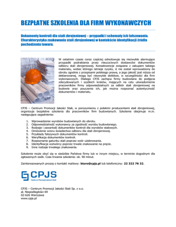 BEZPŁATNE SZKOLENIA DLA FIRM WYKONAWCZYCH Dokumenty kontroli dla stali zbrojeniowej – przypadki i schematy ich fałszowania. Charakterystyka znakowania stali zbrojeniowej w kontekście identyfikacji źródła pochodzenia towaru. W ostatnim czasie coraz częściej odnotowuje się niezwykle alarmujące przypadki podrabiania przez nieuczciwych dostawców dokumentów odbioru stali zbrojeniowej. Konsekwencje związane z zakupem takiego materiału, wobec którego istnieje ryzyko, iż nie został wprowadzony do obrotu zgodnie z przepisami polskiego prawa, a jego jakość jest niższa od deklarowanej, mogą być niezwykle dotkliwe, w szczególności dla firm wykonawczych. Dlatego CPJS zachęca firmy budowlane do podjęcia zdecydowanych i szybkich kroków, mających na celu uświadomienie pracowników firmy odpowiedzialnych za odbiór stali zbrojeniowej na budowie oraz pouczenie ich, jak można rozpoznać autentyczność dokumentów i materiału. CPJS – Centrum Promocji Jakości Stali, w porozumieniu z polskimi producentami stali zbrojeniowej, organizuje bezpłatne szkolenia dla pracowników firm budowlanych. Szkolenie obejmuje m.in. następujące zagadnienia: 1. 2. 3. 4. 5. 6. 7. 8. 9. Wprowadzenie wyrobów budowlanych do obrotu. Odpowiedzialność wykonawcy za zgodność wyrobu budowlanego. Rodzaje i zawartość dokumentów kontroli dla wyrobów stalowych. Omówienie wzoru świadectwa odbioru dla stali zbrojeniowej. Przykłady fałszywych dokumentów kontroli. Weryfikacja dokumentów kontroli. Rozpoznanie gatunku stali poprzez wzór użebrowania. Identyfikacja wytwórcy poprzez trwałe znakowanie na pręcie. Inne rodzaje trwałego znakowania. Szkolenie może obyć się w siedzibie Państwa firmy lub w innym miejscu, w terminie dogodnym dla zgłoszonych osób. Czas trwania szkolenia: ok. 90 minut. Zainteresowanych proszę o kontakt mailowy: [email protected] lub telefoniczny: 22 322 76 32. CPJS – Centrum Promocji Jakości Stali Sp. z o.o. al. Niepodległości 69 02-626 Warszawa www.cpjs.pl