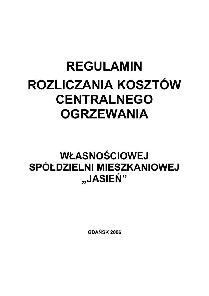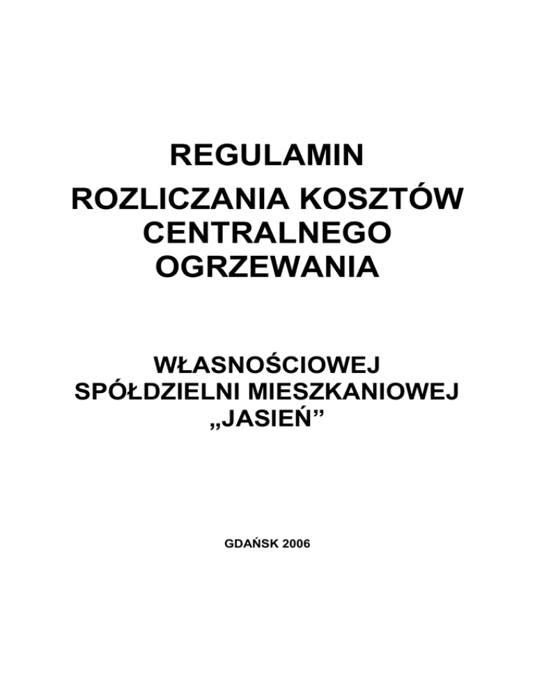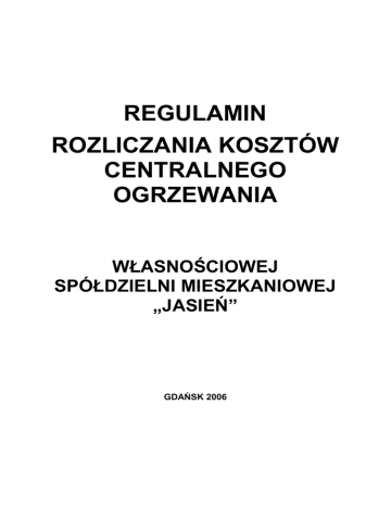 REGULAMIN ROZLICZANIA KOSZTÓW CENTRALNEGO OGRZEWANIA WŁASNOŚCIOWEJ SPÓŁDZIELNI MIESZKANIOWEJ „JASIEŃ” GDAŃSK 2006 PODSTAWA PRAWNA 1. Ustawa z 16.09.1982 roku Prawo Spółdzielcze (Dz.U.Nr 54 z 1995r. poz. 288 ze zmianami) 2. Statut Własnościowej Spółdzielni Mieszkaniowej „Jasień” wpisany do KRS w dniu 28.08.2006r 3. Ustawa z dnia 15.12.2000 o spółdzielniach mieszkaniowych (Dz.U. Nr 4 z 2001 roku poz. 27) 4. Ustawa z dnia 04 marca 2005r. o zmianie Ustawy Prawo energetyczne (Dz.U. z 2005r. Nr 62 poz. 552) 5. Rozporządzenie Ministra Gospodarki i Pracy z 30 lipca 2004r. w sprawie szczegółowych zasad kształtowania i kalkulacji taryf oraz rozliczeń w obrocie ciepłem (Dz.U. z 2004r. Nr 184 poz. 1902). §1 1. Ogólną zasadą rozliczenia kosztów centralnego ogrzewania jest podział poniesionych nakładów na ogrzewanie osiedla w okresie rozliczeniowym, czyli roku kalendarzowym – stosownie do wydatków finansowych poniesionych przez Spółdzielnię na działanie kotłowni i instalacji ciepłowniczych. 2. Podział poniesionych nakładów na ogrzewanie osiedla (kosztów centralnego ogrzewania) pomiędzy właścicielami lokali użytkowych i właścicielami lokali mieszkalnych następuje proporcjonalnie do sumy powierzchni grzewczych tych lokali. 3. W przypadku opomiarowania kotłowni licznikami energii cieplnej podział kosztów centralnego ogrzewania pomiędzy lokalami użytkowymi i lokalami mieszkalnymi nastąpi według wskazań tych liczników. 4. Podstawą rozliczenia kosztów centralnego ogrzewania dla lokali mieszkalnych są wskazania podzielników c.o. zamontowanych na grzejnikach w ilości 1 szt. na 1 grzejnik w tych lokalach wg przyjętych zasad w regulaminie. 5. Nie montuje się podzielników ciepła na grzejnikach zainstalowanych w łazience. §2 1. Rozliczenie kosztów ogrzewania, będzie dokonywane jeden raz w roku za jeden okres rozliczeniowy - po upływie tego okresu. 2. Koszty centralnego ogrzewania zwiększa się o koszty rozliczenia. 3. Każdy właściciel lokalu mieszkalnego obciążony będzie kosztem odczytu i rozliczenia podzielnika elektronicznego w zależności od ilości podzielników w mieszkaniu. §3 1. Okres rozliczeniowy obejmuje rok kalendarzowy. 2. Koszty centralnego ogrzewania lokali mieszkalnych ustala się poprzez odjęcie od całkowitych poniesionych nakładów na ogrzewanie osiedla (kosztów centralnego ogrzewania) kosztów podgrzania ciepłej wody użytkowej oraz kosztów ogrzewania lokali użytkowych i obiektów obcych, ustalonych wg klucza, jakim jest powierzchnia tych lokali i obiektów, a po opomiarowaniu kotłowni według wskazań zamontowanych liczników ciepła. 3. Całkowity koszt ogrzewania lokali mieszkalnych w danym okresie rozliczeniowym rozdziela się na dwie niezależne części: 2 I. Część stałą określającą koszt wspólny dla wszystkich właścicieli lokali mieszkalnych, na który składają się nakłady na: ogrzewanie klatek schodowych i piwnic (pralnie, suszarnie), straty ciepła w rurociągach doprowadzających ciepło, ogrzewanie pomieszczeń, w których nie zainstalowano podzielników kosztów, tj. w łazienkach, wc, przedpokojach, przepływ ciepła pomiędzy lokalami stałe opłaty za przesył gazu i energii elektrycznej. Ta część jest określona, jako 40% całkowitego kosztu ogrzewania i będzie rozdzielona na poszczególnych właścicieli lokali mieszkalnych – proporcjonalnie do całej powierzchni użytkowej lokalu mieszkalnego z wyłączeniem powierzchni pomieszczeń adaptowanych nie posiadających instalacji c.o. II. Część zmienną określającą koszt ogrzewania lokali mieszkalnych. Ta część jest określona, jako 60% całkowitego kosztu ogrzewania i będzie podzielona na poszczególnych właścicieli lokali mieszkalnych w oparciu o wskazania zainstalowanych w lokalach mieszkalnych, sprawnych podzielników kosztów. 4. Przy ustaleniu różnic dotyczących strat ciepła wynikających z odmiennego usytuowania lokali w budynkach stosuje się współczynniki korekcyjne stosowane przez firmę rozliczeniową ustalone w oparciu o wytyczne COBRTI Instal w Warszawie. 5. Koszty centralnego ogrzewania lokali użytkowych pomniejszone o wpływy z tytułu ogrzewania powierzchni wspólnych jednakowych dla wszystkich lokali rozlicza się proporcjonalnie do powierzchni lokali. 6. W odniesieniu do lokali użytkowych może być wprowadzony inny system rozliczenia kosztów centralnego ogrzewania np.: wprowadzenie dodatkowych składników lub wprowadzenie rozliczenia na podstawie podzielników ciepła po ich zainstalowaniu stosownie do Uchwały Zarządu. §4 1. Część zmienna kosztów ogrzewania lokali mieszkalnych będzie podzielona na poszczególnych właścicieli lokali mieszkalnych w oparciu o wskazania zainstalowanych w lokalach mieszkalnych sprawnych podzielników kosztów. 2. Do ustalenia ilości zużytych jednostek ciepła w tych lokalach mieszkalnych lub ich poszczególnych pomieszczeniach w których: a. nie zainstalowano podzielników kosztów, b. podzielniki te (lub jeden z podzielników w danym pomieszczeniu lokalu mieszkalnego), uległy awarii, uszkodzeniu (również nieumyślnemu) z winy właściciela lokalu mieszkalnego lub zostały zdemontowane przez właściciela lokalu mieszkalnego, podzielniki zaginęły, brakuje plomb na podzielnikach, c. odczyt wskazań podzielników nie był możliwy w okresie dokonywania odczytów. 3. W przypadkach opisanych w pkt. a, b, c , właściciele lokali mieszkalnych zostaną obciążeni za okres rozliczeniowy wg następującej zasady: - dla ustalenia ilości zużytych jednostek ciepła przyjmuje się średnią osiedlową jednostek zużytych w lokalach mieszkalnych na m² zwiększoną dwukrotnie oraz nie będą miały zastosowania współczynniki korekcyjne związane z usytuowaniem mieszkania. 4. Rozliczenie kosztów zmiennych centralnego ogrzewania w danym budynku przy zastosowaniu wskazań podzielników może być zastąpione systemem rozliczeń 3 ryczałtow