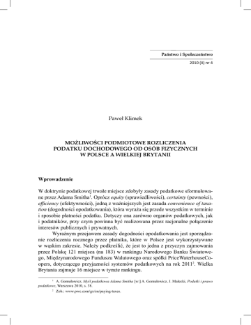 Państwo i Społeczeństwo 2010 (X) nr 4 Paweł Klimek MOŻLIWOŚCI PODMIOTOWE ROZLICZENIA PODATKU DOCHODOWEGO OD OSÓB FIZYCZNYCH W POLSCE A WIELKIEJ BRYTANII Wprowadzenie W doktrynie podatkowej trwałe miejsce zdobyły zasady podatkowe sformułowane przez Adama Smitha1. Oprócz equity (sprawiedliwości), certainty (pewności), efficiency (efektywności), jedną z ważniejszych jest zasada convenience of taxation (dogodności opodatkowania), która wyraża się przede wszystkim w terminie i sposobie płatności podatku. Dotyczy ona zarówno organów podatkowych, jak i podatników, przy czym powinna być realizowana przez racjonalne połączenie interesów publicznych i prywatnych. Wyraźnym przejawem zasady dogodności opodatkowania jest sporządzanie rozliczenia rocznego przez płatnika, które w Polsce jest wykorzystywane w wąskim zakresie. Należy podkreślić, że jest to jedna z przyczyn zajmowania przez Polskę 121 miejsca (na 183) w rankingu Narodowego Banku Światowego, Międzynarodowego Funduszu Walutowego oraz spółki PriceWaterhouseCoopers, dotyczącego przyjazności systemów podatkowych na rok 20112. Wielka Brytania zajmuje 16 miejsce w tymże rankingu. 1 A. Gomułowicz, Myśl podatkowa Adama Smitha [w:] A. Gomułowicz, J. Małecki, Podatki i prawo podatkowe, Warszawa 2010, s. 38. 2 Zob.: www.pwc.com/gx/en/paying-taxes. 132 PAWEŁ KLIMEK Regulacje polskie Zgodnie z art. 45 ustawy z 26 lipca 1991 r. o podatku dochodowym od osób fizycznych3, podatnik zasadniczo samodzielnie dokonuje rozliczenia podatku przez obliczenie należnego podatku i porównanie go z odprowadzonymi w ciągu roku zaliczkami. Jednakże art. 37 i art. 34 ust. 9 ustawy przewidują możliwość przesunięcia tego obowiązku na płatnika, przy czym art. 37 dopuszcza ją pod warunkiem złożenia przez podatnika płatnikowi wniosku do 10 stycznia po zakończeniu roku podatkowego4. Płatnikami, którzy mogą w ten sposób zostać zobligowani do rozliczenia podatku, są: 1) zakłady pracy (art. 31), 2) rolnicze spółdzielnie produkcyjne i inne spółdzielnie zajmujące się produkcją rolną (art. 33), 3) podmioty wypłacające emerytury i renty zagraniczne (art. 35 ust. 1 pkt 1), 3) podmioty wypłacające stypendia (art. 35 ust. 1 pkt 2), 4) areszty śledcze i zakłady karne wypłacające należności za pracę wykonywaną przez osadzonych (art. 35 ust. 1 pkt 4), 5) centra integracji społecznej wypłacające należności z tytułu świadczeń i motywacyjnych premii integracyjnych (art. 35 ust. 1 pkt 7). Płatnikami obligatoryjnie dokonującymi rozliczenia za podatników z mocy prawa są natomiast organy rentowe (art. 34 ust. 7). W razie braku obowiązku rozliczenia podatnika, płatnik jest zobligowany do przekazania mu imiennej informacji sporządzonej na formularzu PIT-11 (art. 39 ust. 1)5. Z ekonomicznego punktu widzenia przesunięcie obowiązku obliczenia podatku powinno być dogodne dla podatników, a przy nadmiernym skomplikowaniu konstrukcji podatku dochodowego od osób fizycznych, prowadzić do oszczędności czasu i kosztów podatników. Mimo to praktyczne wykorzystanie powyższej możliwości w Polsce, zwłaszcza w stosunku do zakładów pracy, jest znikome. Wynika to ze statystyki Ministerstwa Finansów za rok 20096, po którym płatnicy rozliczyli 23,68% podatników (5 859 065 z 24 740 297), z czego 22,11% (5 471 602) rozliczyły organy rentowe natomiast pracodawcy zaledwie 1,57% (387 463). Przyczyną tej sytuacji jest konstrukcja prawna omawianej instytucji – grupa płatników, na którą może zostać przesunięty obowiązek jest szeroka7, naDz.U. z 2010 r. Nr 149, poz. 996 ze zm., zwana dalej ustawą. Wniosek ten podlega złożeniu na formularzu PIT-12. Warto przy tym zaznaczyć, że w razie złożenia go po terminie płatnik może, ale już nie musi, dokonać rozliczenia. Por. Podatek dochodowy od osób fizycznych 2010, red. J. Marciniuk, Warszawa 2010, s. 1139. 5 Przy czym informacja może również być przekazana elektronicznie, jeżeli tylko zostanie zachowana forma deklaracji. Zob. Wyrok Wojewódzkiego Sądu Administracyjnego w Poznaniu z 22 października 2010 r. (I SA/Po 486/10), System Informacji Prawnej „Lex”, nr 620596. 6 Por. www.mf.gov.pl/dokument.php?const=3&dzial=149&id=216804, s. 3. 7 Choć brak w nim osób fizycznych – płatników, którzy wypłacają świadczenia z tytułu wykonywanej na ich rzecz działalności osobistej oraz z tytułu wykorzystywania praw autorskich i pokrewnych, co ma szcze3 4 MOŻLIWOŚCI PODMIOTOWE ROZLICZENIA PODATKU... 133 tomiast krąg podatników mogących go przenieść jest ograniczony. Nie obejmuje on łącznie opodatkowanych małżonków oraz osób samotnie wychowujących dzieci, które rozliczają się w podobny sposób (art. 37 ust. 1 pkt 3; art. 34 ust. 9 pkt 3)8. Jednak zasadniczy wpływ na niskie zainteresowanie omawianą instytucją ma jej warunkowy charakter z uwagi na formę opodatkowania, obowiązek doliczenia kwot uprzednio odliczonych oraz sposób obliczania podatku, a zwłaszcza możliwość dokonywania odliczeń od dochodu oraz obniżenia kwoty podatku. Podatnicy pragnący przenieść obowiązek rozliczania podatku nie mogą uzyskiwać żadnych innych dochodów jak od płatnika, z wyjątkiem opodatkowanych w oparciu o niektóre formy odrębne (art. 34 ust. 9 pkt 1; art. 37 ust. 1 pkt 1). Zaskakujący jest przy tym fakt, że ustawodawca nie zaliczył do nich tych, które są powszechnie uznawane za ulgowe – karty podatkowej i ryczałtu od przychodów ewidencjonowanych. Zaliczył zaś formy, w postaci których przeważnie opodatkowani są podatnicy zamożniejsi, w tym: opodatkowanie kapitałów pieniężnych (art. 30a), opodatkowanie zysków ze zbycia papierów wartościowych i pochodnych instrumentów finansowych (art. 30b), odrębne opodatkowanie pozarolniczej działalności gospodarczej (art. 30c), oraz – co szczególnie rażące –opodatkowanie dochodów z nieujawnionych źródeł i nieznajdujących pokrycia w ujawniony