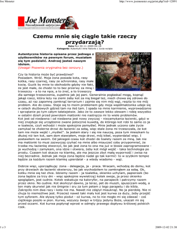 Joe Monster 1z3 http://www.joemonster.org/print.php?sid=12891 Czemu mnie się ciągle takie rzeczy przydarzają? Data Pon 30-11-2009 04:18 Kategoria: Autentyki i inne historie z życia wzięte Autentyczna historia opisana przez jednego z użytkowników na pewnym forum, musiałam się tym podzielić. Andrzej jesteś naszym idolem. (Uwaga! Pisownia oryginalna bez cenzury.) Czy ta historia może być prawdziwa? Posiadam. Wróć. Moja żona posiada kota, rasy kotka, rasy czarnej, rasy ze schroniska, rasy małe kocię. Guzik by mnie to obchodziło gdyby nie fakt, że jest małe, że chodzi to to bez przerwy za mną i trzeszczy - a to na ręce, a to żreć, a to trzeszczy dla samego trzeszczenia, zupełnie jak jej pani. Generalnie pogłaskać mogę, kopnąć jakąś rzecz, która leży na ziemi żeby kot za nią biegał też, niech chowa się zdrowo do czasu, aż raz zapomnę zamknąć terrarium i zajmie się nim mój wąż, reszta to nie mój problem. Ale do czasu. Staje się to moim problemem gdy moja współmałżonka udaje się w celach służbowych gdzieś tam na ileś tam. I spada na mnie karmienie, wyprowadzanie i sprzątanie po tym całym tałatajstwie. Jako że to zawsze lekko olewam i robię wszystko w ostatni dzień przed powrotem małżonki nie nastręcza mi to wiele problemów. Kot jest od niedawna i od niedawna jest nowy zwyczaj - niezamykania łazienki, gdyż w niej znajduje się urządzenie zwane potocznie kuwetą, do którego kot robi to samo co ja w toalecie, czyli wchodzi i może spokojnie pomyśleć. Mnie jednak uczono całe życie zamykać te cholerne drzwi do łazienki za sobą, więc stale żona mi trzeszczała, że kot tam nie może wejść i „myśleć”. Ja jestem stary i się nie nauczę, poza tym mieszkam tu dłużej niż ten kot, sam dom stawiałem, moje drzwi, mój kibel, wypierdalać więc. I postawiłem na swoim. Od jakiegoś czasu kot chodzi do toalety razem ze mną. Jak nie ma małżonki to musi zazwyczaj czyhać na mnie albo miauczeć coby przypomnieć, że trzeba mu łazienkę otworzyć, bo jak jest żona to ona ma już w biosie zaprogramowane ja wychodzę i zamykam, ona idzie i otwiera, żeby kot mógł wejść - taka technologia po prostu. Czasem kot skacze na klamkę, ale ma jeszcze zbyt małą wyporność i zwisa na niej bezradnie. Jednak jak moja żona będzie nadal go tak karmić- to w szybkim tempie będzie za każdym razem klamkę upierdalał - a wtedy wiadomo - wąż. Dobrze więc, uporządkuję: żona - delegacja, ja - praca. Wracam, wchodzę do domu, kot przy drzwiach do łazienki skwierczy, bo jak wychodziłem to zamknąłem za sobą. Ok, kotku mnie się też chce. Idziemy razem - ja toaletka, okienko uchylam, papierosik (bo żona będzie za trzy dni - więc spokojnie wywietrzę) kotek swoje, ja przez okienko spoglądam, jest cudnie. Kotek wskakuje na kaloryfer, na parapecik i patrzymy razem przez okno. No cudnie. Kot skończył dawno, ja teraz, pet do muszli, spuszczam wodę, a ten mały skurwiel jak nie śmignie i sru za tym petem z tego parapetu i do kibla. Zakręciło nim dwa razy i kota nie ma. Nawet nie zdążył miauknąć. No ja pierdolę. Nie ni chuja to niemożliwe jest. Przecież nawet taki mały kot jest kurwa za duży, żeby przejść tym syfonem. Ale słyszę tylko pizdut - oż kurwa, no to nie mogło mi się zdawać - coś ciężkiego poszło w pion. Kurwa, wszyscy święci w trójcy jedyny Boże, ukazali mi się przed oczami. Kot kurwa popłynął wprost w odmęty prawego dopływu królowej polskich rzek. 2009-12-02 21:38 Joe Monster 2z3 http://www.joemonster.org/print.php?sid=12891 Lecę kurwa na dół do piwnicy, choć może powinienem od razu do schroniska, zanim wróci moja żona - nie ma wafla, znajdę jakiegoś małego czarnego skurwiela z białą krawatką, nie było jej kilka dni, może się nie połapie. Ale chuj, najpierw do piwnicy zbiegam po schodach, słucham - coś drapie w rurze, pion, kawałek płaskiej rury miauczy - jest, kurwa, żyje i nie poleciał do sieci miejskiej. Nawet jak teraz zdechnie to chuj, przynajmniej będę miał jego truchło i powiem, że kojfnął z przyczyn naturalnych albo tylko lekko nienaturalnych, bo przecież mi baba nie uwierzy za chuja trefla, że kot sam wpadł do kibla. Ale na razie drapie i żyje. Znalazłem taki wziernik, gdzie można zaglądnąć do tej rury i wołam. Kici, kici! Ni chuja, nie przyjdzie, wołam, wołam, a ten kurwa głąb zamiast przyjść do mnie to kurwa chce iść tam skąd przyszedł, czyli do góry w pion. Ja go wołam, a on do góry drapie. I udrapie, udrapie kilkanaście centymetrów i zjazd w dół. No pojebało i mnie, że tu stoję i jego (kota) Tak przez pół godziny. Prosiłem, wołałem, błagałem, groziłem, wabiłem żarciem i ni chuja, uparł się i nic tylko rurą do góry z powrotem do kibla. Za daleko, żeby włożyć rękę, grabie czy cokolwiek. Jedyna metoda - fight fire with fire - ogień zwalczaj ogniem. Zatkałem tę rurę przy wzierniku deszczułkami, których używam na podpałkę do kominka, żeby kot nie popłynął już nigdzie dalej i z buta na górę do kibla - geberit i woda w dół - bombs gone. I bieg do piwnicy. Po drodze słyszę jak się przewala po rurach - podziałało. Wbiegam do piwnicy i kurwa koniec świata. Nie ma moich deszczułek - no może z jedna, cała prowizoryczna tama poszła w chuj i kota też nie słychać już. Ja pierdolę. Kurwa, gdzie ta rura teraz idzie - coś mi świtnęło, że kanalizacja w ulicy, dom od ulicy ze 30 metrów - może nie wszystko stracone i gdzieś się zwierzak zatrzymał po drodze. Biegnę na ulicę, jest studzienka - mam nadzieję, że to od mojego domu. Ni cholery jej nie podniosę. Ciężka jak szlag i nie ma za co chwycić. Powrót do domu i pogrzebacz od kominka, tym może uda się to podważyć. Ni cholery - najpierw ugiąłem, potem złamałem żelastwo. Myśl! Auto stoi na ulicy - mam pas do holowania, może uda się to szarpnąć. Hak, pas, wsteczny - poszło, aż zakurzył