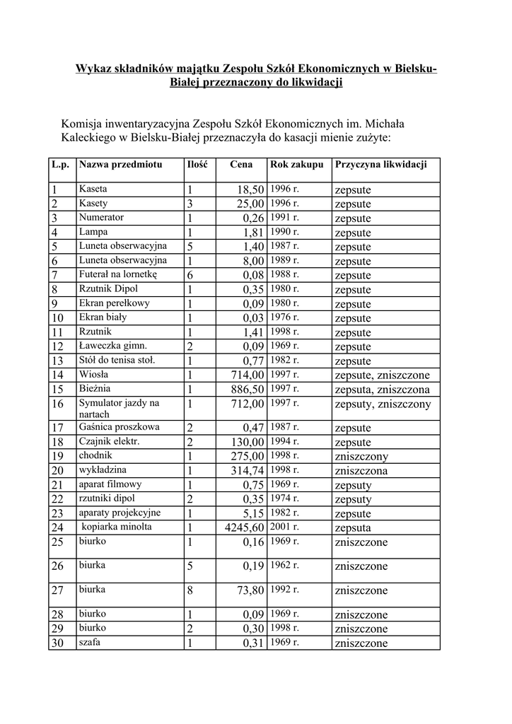 Wykaz składników majątku Zespołu Szkół Ekonomicznych w BielskuBiałej przeznaczony do likwidacji Komisja inwentaryzacyjna Zespołu Szkół Ekonomicznych im. Michała Kaleckiego w Bielsku-Białej przeznaczyła do kasacji mienie zużyte: L.p. Nazwa przedmiotu Ilość Cena Rok zakupu Przyczyna likwidacji 1 3 1 1 5 1 6 1 1 1 1 2 1 1 1 1 18,50 25,00 0,26 1,81 1,40 8,00 0,08 0,35 0,09 0,03 1,41 0,09 0,77 714,00 886,50 712,00 1996 r. 1996 r. 1991 r. 1990 r. 1987 r. 1989 r. 1988 r. 1980 r. 1980 r. 1976 r. 1998 r. 1969 r. 1982 r. 1997 r. 1997 r. 1997 r. zepsute zepsute zepsute zepsute zepsute zepsute zepsute zepsute zepsute zepsute zepsute zepsute zepsute zepsute, zniszczone zepsuta, zniszczona zepsuty, zniszczony 17 18 19 20 21 22 23 24 25 Kaseta Kasety Numerator Lampa Luneta obserwacyjna Luneta obserwacyjna Futerał na lornetkę Rzutnik Dipol Ekran perełkowy Ekran biały Rzutnik Ławeczka gimn. Stół do tenisa stoł. Wiosła Bieżnia Symulator jazdy na nartach Gaśnica proszkowa Czajnik elektr. chodnik wykładzina aparat filmowy rzutniki dipol aparaty projekcyjne kopiarka minolta biurko 2 2 1 1 1 2 1 1 1 0,47 130,00 275,00 314,74 0,75 0,35 5,15 4245,60 0,16 1987 r. 1994 r. 1998 r. 1998 r. 1969 r. 1974 r. 1982 r. 2001 r. 1969 r. zepsute zepsute zniszczony zniszczona zepsuty zepsuty zepsute zepsuta zniszczone 26 biurka 5 0,19 1962 r. zniszczone 27 biurka 8 73,80 1992 r. zniszczone 28 29 30 biurko biurko szafa 1 2 1 0,09 1969 r. 0,30 1998 r. 0,31 1969 r. zniszczone zniszczone zniszczone 1 2 3 4 5 6 7 8 9 10 11 12 13 14 15 16 31 32 33 34 35 36 37 38 39 40 41 42 43 44 45 46 47 48 49 50 51 52 53 54 55 56 57 58 59 60 61 62 63 64 65 66 67 68 69 70 71 szafa szafa stół pod maszynę stół biurowy stół biurowy ekran perełkowy rzutnik diapol plansza j. angiel. plansze do j. niem. magnetofon odkurzacz projektoskop kaseta zestaw minerałów zestaw metali maszyna do pisania maszyna do pisania maszyna do pisania fotel wyścielany stolik uczniowski stolik uczniowski przeźrocza Pierwsza pomoc torba sanitarna zestaw apteczka DIN teleskop planetarium kamerton z rysikiem przyrząd Tyndala destylarka model suwmiarki włókna zestaw gumy gablotka fajansu gablotka prod. porcel gabl. dodatki do ciast len i konopie gablotk gabl. przypr.do mięsa gabl. żywica syntet. pehametr cement zestaw burak cukr. zestaw 1 1 3 1 1 1 1 1 23 1 1 1 1 1 2 1 1 2 7 9 9 1 3 1 1 1 3 1 1 1 1 1 1 1 1 1 1 1 1 1 1 0,12 0,07 0,10 0,09 0,10 0,09 0,70 149,80 0,03 1,59 315,09 3,44 8,00 0,16 0,04 0,46 9,78 130,15 0,05 15,00 17,50 0,04 1969 r. 1969 r. 1969 r. 1969 r. 1969 r. 1982 r. 1982 r. 1996 r. 1986 r. 1988 r. 2000 r. 1988 r. 1993 r. 1969 r. 1969 r. 1969 r. 1987 r. 1991 r. 1969 r. 1990 r. 1990 r. 1986 r. zniszczone zniszczone zniszczone zniszczone zniszczone zepsuty zepsuty zepsuty zepsuty zepsuty zepsuty zepsuty zepsuty zepsuty zepsuty zepsuta zepsuta zepsuta zepsuty zepsuty zepsuty zepsute 0,05 1,00 0,56 0,42 0,01 0,01 0,19 0,02 0,02 0,06 0,03 0,06 0,03 0,03 0,04 0,04 0,97 0,06 0,02 1980 r. 2010 r. 1974 r. 1976 r. 1976 r. 1976 r. 1969 r. 1969 r. 1969 r. 1969 r. 1969 r. 1969 r. 1969 r. 1969 r. 1969 r. 1969 r. 1969 r. 1969 r. 1969 r. zniszczona zepsuta zniszczone zniszczone zniszczone zniszczone zniszczone zniszczone zniszczone zniszczone zniszczone zniszczone zniszczone zniszczone zniszczone zniszczone zniszczone zniszczone zniszczone 72 73 74 75 76 77 78 79 80 81 82 83 84 85 86 87 88 89 90 91 92 93 94 95 96 97 98 99 100 101 102 103 104 105 106 kaseta video telewizor Schneider komputer komputer komputer komputer komputer komputer komputer drukarka płyty – poezje płyty- mistrzowie płyty wiersze płyta Żeromski płyta Mickiewicz płyta Norwid płyta cześć partii płyta Słowacki płyta Broniewski płyta Gałczyński taśma Żywe Odrodzenie taśma wrzesień taśma czas przeszły taśma teatr Szekspira płyta współczesna poezja płyta wielkie monologi poradnik komputerowy CD-ROM przeźrocza do rachunkowości przeźrocza do rachunkowości przeźrocza ewidencja sprzedaży przeźrocza dokumenty księgowe przeźrocza ewidencja kosztów przeźrocza ewidencja na kontach analit. przeźrocza bilans przedsiębiorstw przeźrocza straty i zyski 1992 r. 1990 r. 1998 r. 1998 r. 1998 r. 1998 r. 2006 r. 2005 r. 2006 r. 1996 r. 1969 r. 1969 r. 1969 r. 1975 r. 1975 r. 1975 r. 1975 r. 1975 r. 1975 r. 1975 r. 1980 r. 1980 r. 1980 r. 1980 r. 1975 r. zniszczone zepsuty zepsuty zepsuty zepsuty zepsuty zepsuty zepsuty zepsuty zepsuta zniszczone zniszczone zniszczone zniszczone zniszczone zniszczone zniszczone zniszczone zniszczone zniszczone zniszczone zniszczone zniszczone zniszczone zniszczone 1 1 0,01 1975 r. 97,00 2000 r. zniszczone zepsuty 1 0,53 1983 r. zniszczone 1 0,09 1983 r. zniszczone 1 0,15 1983 r. zniszczone 1 0,18 1984 r. zniszczone 1 0,15 1984 r. zniszczone 1 0,16 1986 r. zniszczone 1 0,16 1986 r. zniszczone 1 0,17 1986 r. zniszczone 1 1 1 1 1 1 1 1 1 1 4 1 2 1 1 1 1 1 1 1 1 1 1 1 1 3,30 900,00 2639,00 2639,00 2639,00 2639,00 75,00 500,00 24,40 724,68 0,01 0,01 0,01 0,01 0,01 0,01 0,01 0,01 0,01 0,01 0,02 0,02 0,02 0,02 0,03 rzutnik dipol kalkulator Elwro 330 kalkulator Elwro 330 kalkulator citizen kalkulator citizen maszyna do pisania maszyna do pisania radiomagnetofon suwaki logarytmiczne suwak logarytmiczny przeźrocza bryły geometryczne bryły geometryczne bryły geometryczne bryły z kulą stolik stereometryczny 1 14 14 1 2 1 1 1 12 1 1 2 3 1 1 1 1,41 4,53 7,45 210,01 225,00 0,25 0,30 310,00 0,01 0,03 0,20 0,03 0,05 0,20 0,04 0,13 1986 r. 1989 r. 1989 r. 1996 r. 1996 r. 1969 r. 1969 r. 1995 r. 1969 r. 1969 r. 1969 r. 1969 r. 1969 r. 1969 r. 1969 r. 1969 r. zniszczony zniszczony zniszczony zepsuty zepsuty zniszczona zniszczona zniszczony zniszczone zniszczone zniszczone zniszczone zniszczone zniszczone zniszczone zniszczony tablica fotogr. pręty i złącza podstawki do modeli kątomierz trójkąty trójkąty zestaw do elektrolizy piasek kwarcowy produkcja cukru tworzywa sztuczne produkty suchej destyl. eksykator termometr lab. 