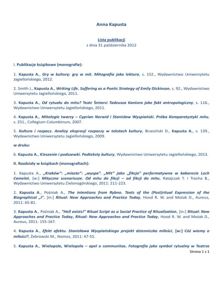 Anna Kapusta Lista publikacji z dnia 31 października 2012 I. Publikacje książkowe (monografie): 1. Kapusta A., Gry w kulturę: gry w mit. Mitografia jako lektura, s. 152., Wydawnictwo Uniwersytetu Jagiellońskiego, 2012. 2. Smith J., Kapusta A., Writing Life. Suffering as a Poetic Strategy of Emily Dickinson, s. 92., Wydawnictwo Uniwersytetu Jagiellońskiego, 2011. 3. Kapusta A., Od rytuału do mitu? Teatr Śmierci Tadeusza Kantora jako fakt antropologiczny, s. 116., Wydawnictwo Uniwersytetu Jagiellońskiego, 2011. 4. Kapusta A., Mitologie twarzy – Cyprian Norwid i Stanisław Wyspiański. Próba Komparatystyki mitu, s. 251., Collegium Columbinum, 2007. 5. Kultura i rozpacz. Analizy ekspresji rozpaczy w tekstach kultury, Brzeziński D., Kapusta A., s. 139., Wydawnictwo Uniwersytetu Jagiellońskiego, 2009. w druku: 6. Kapusta A., Kieszenie i podszewki. Podteksty kultury, Wydawnictwo Uniwersytetu Jagiellońskiego, 2013. II. Rozdziały w książkach (monografiach): 1. Kapusta A., „Kraków”: „miasto”: „wyspa”. „Mit” jako „fikcja” performatywna w kabarecie Loch Camelot, [w:] Mityczne scenariusze. Od mitu do fikcji – od fikcji do mitu, Ratajczak T. i Trocha B., Wydawnictwo Uniwersytetu Zielonogórskiego, 2011: 211-223. 2. Kapusta A., Poźniak A., The intentions from Rybno. Texts of the (Post)ritual Expression of the Biographical „I”, [in:] Ritual: New Approaches and Practice Today, Hood R. W. and Motak D., Aureus, 2011: 65-81. 3. Kapusta A., Poźniak A., “Hell exists!” Ritual Script as a Social Practice of Ritualization, [in:] Ritual: New Approaches and Practice Today, Ritual: New Approaches and Practice Today, Hood R. W. and Motak D., Aureus, 2011: 155-167. 4. Kapusta A., Efekt afektu. Stanisława Wyspiańskiego projekt dzienniczka miłości, [w:] Cóż wiemy o miłości?, Żebrowski M., Nomos, 2011: 47-55. 5. Kapusta A., Wielopole, Wielopole – apel o communitas. Fotografia jako symbol rytualny w Teatrze Strona 1 z 1 Śmierci Tadeusza Kantora, [w:] Wspólnota i różnica. Interdyscyplinarne studia, analizy i rozprawy, Kobylarek A., Wydawnictwo Adam Marszałek, 2009: 556-571. 6. Kapusta A., „Może cię właśnie rżną i skrobią w tej chwili” (Witkacy, Zakopane, 14 listopada 1925). Stanisława Ignacego Witkiewicza dyskurs aborcyjny – próba problematyzacji zagadnienia, [w:] Kultura jako pole walki płci. Normy. Tabu. Przekroczenie, Jeżyk A. i Zawadzki A., Wydawnictwo Uniwersytetu Jagiellońskiego, 2009: 25-33. 7. Kapusta A., Twarze Feba. Metaforyzacje cyklu solarnego w Wandzie i Krakusie Cypriana Norwida, [w:] Symbolika mistyczna w poezji romantycznej. Słowacki i inni, Halkiewicz-Sojak G. i Paprocka-Podlasiak B., Wydawnictwo Naukowe Uniwersytetu Mikołaja Kopernika, 2009: 203-213. 8. Kapusta A., Język rozpaczający. Powrót Odysa Stanisława Wyspiańskiego jako projekt neutralizacji rozpaczy, [w:] Kultura i rozpacz. Analizy ekspresji rozpaczy w tekstach kultury, Brzeziński D. I Kapusta A., Wydawnictwo Uniwersytetu Jagiellońskiego, 2009: 23-38. 9. Kapusta A., Cyprian Norwid i Stanisław Wyspiański – pytanie o mitobiografię, [w:] Żywioły wyobraźni Stanisława Wyspiańskiego, Czabanowska-Wróbel A., Jarząbek D. I Saul D., Wydawnictwo Księgarnia Akademicka, 2008: 55-61. 10. Kapusta A., Assunta Cypriana Norwida jako hortus conclusus, [w:] Przestrzeń ogrodu-przestrzeń kultury, Gazda G. I Gołąb M., Universitas, 2008: 269-284. 11. Kapusta A., Cyprian Norwid's Assunta as hortus conclusus, [in:] Space of Garden – Space of Culture, Gazda G. and Gołąb M., Cambridge Scholars Publishing, 2008: 258-272. 12. Kapusta A., „Slubuję ci, więc jestem”. Ceremonia weselna jako performatyw (studium przypadku), [w:] Eros-Pathos-Thanatos. Świat(y) wartości społeczeństwa polskiego u progu XXI wieku. Praca zbiorowa, Jeziorskiego I. I Korzewski M., Wydawnictwo Akademii Techniczno-Humanistycznej, 2008: 155168. 13. Kapusta A., Kain Byrona – dramat podmiotu poznającego, [w:] Artes. Prace Studentów Międzywydziałowych Indywidualnych Studiów Humanistycznych Uniwersytetu Jagiellońskiego, T. 2., Dąbrowska E. I Sepioł R., Wydawnictwo Uniwersytetu Jagiellońskiego, 2004: 23-42 . III. Artykuły w czasopismach: 1. Kapusta A., 2012, From an Eco-Fairy Tale to an Enviromentally Friendly Lifestyle. An Eco-Friendly Reading Project by Agnieszka Marzęcka, Journal of Education Culture and Society 1: 61-69. 2. Kapusta A., 2012, Czego babcia i dziadek (na)uczyli wnuki? Kilka refleksji o mapie uczniowskich myśli, Hejnał Oświatowy (2) 110: 10-12. 3. Kapusta A., 2012, Żałobne cybermacierzyństwo – przypadek „mam Aniołków”, Kultura i Historia 21: Strona 2 z 2 ISSN 1642-9826. 4. Kapusta A., Poźniak A., 2011, Intencje z Rybna. Teksty (post)rytualnej ekspresji „ja” biograficznego, Studia Kulturowe. W kręgu teorii kultury, miejsca i spektaklu 2: 56-69. 5. Kapusta A., Poźniak A., 2011, „Najświętsza Głowa Pana Jezusa”. Od skryptu metonimicznego do biografii metaforycznej, Lud XCV: 225-242 . 6. Kapusta A., 2011, Inna „Inność”. Doświadczenie niepełnosprawności jako kapitał kulturowy, Niepełnosprawność i Rehabilitacja 3: 87-101. 7. Kapusta A., 2011, „1981. Rok Niepełnosprawnych”. O inkluzji według Jana Kotei, Biuletyn Biura ds. Osób Niepełnosprawnych Uniwersytetu Jagiellońskiego 3: 20-31. 8. Kapusta A., 2011, “1981. Year of Disabled Persons”. On inclusion according to Jan Koteja, A bulletin of the Jagiellonian University Disability Support Service 3: 20-31. 9. Kapusta A., Późniak A., 2011, The Diary of Saint Faustina Kowalska Objectified in a Religious and in Village Community. The Case of Rybno, Anthropos (1) 106: 200-207. 10. Kapusta A., 2010, Polak, Ranczo i prowincja. Studium mitograficzne serialu, Kultura Współczesna. Teoria. Interpretacje. Praktyka 4 (66): 142-151. 11. Kapusta A., Salamon K., 2009, Miejsce zagadnień etycznych w procesie kształcenia na poziomie liceum (studium przypadku), Zeszyty Filozoficzne 