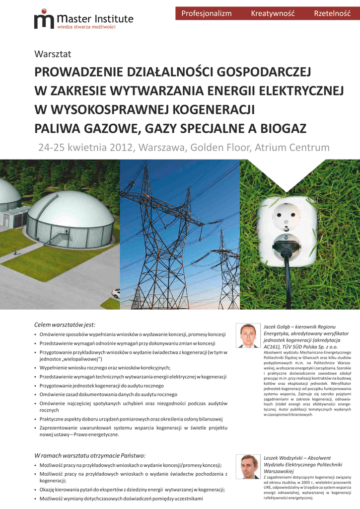 Profesjonalizm Kreatywność Rzetelność wiedza stwarza możliwości Warsztat PROWADZENIE DZIAŁALNOŚCI GOSPODARCZEJ W ZAKRESIE WYTWARZANIA ENERGII ELEKTRYCZNEJ W WYSOKOSPRAWNEJ KOGENERACJI PALIWA GAZOWE, GAZY SPECJALNE A BIOGAZ 24-25 kwietnia 2012, Warszawa, Golden Floor, Atrium Centrum Celem warsztatów jest: § Omówienie sposobów wypełniania wniosków o wydawanie koncesji, promesy koncesji § Przedstawienie wymagań odnośnie wymagań przy dokonywaniu zmian w koncesji § Przygotowanie przykładowych wniosków o wydanie świadectwa z kogeneracji (w tym w jednostce „wielopaliwowej”) § Wypełnienie wniosku rocznego oraz wniosków korekcyjnych; § Przedstawienie wymagań technicznych wytwarzania energii elektrycznej w kogeneracji § Przygotowanie jednostek kogeneracji do audytu rocznego § Omówienie zasad dokumentowania danych do audytu rocznego § Omówienie najczęściej spotykanych uchybień oraz niezgodności podczas audytów rocznych § Praktyczne aspekty doboru urządzeń pomiarowych oraz określenia osłony bilansowej § Zaprezentowanie uwarunkowań systemu wsparcia kogeneracji w świetle projektu nowej ustawy – Prawo energetyczne. W ramach warsztatu otrzymacie Państwo: § Możliwość pracy na przykładowych wnioskach o wydanie koncesji/promesy koncesji; § Możliwość pracy na przykładowych wnioskach o wydanie świadectw pochodzenia z kogeneracji; § Okazję kierowania pytań do ekspertów z dziedziny energii wytwarzanej w kogeneracji; § Możliwość wymiany dotychczasowych doświadczeń pomiędzy uczestnikami Jacek Gołąb – kierownik Regionu Energetyka, akredytowany weryfikator jednostek kogeneracji (akredytacja AC161), TÜV SÜD Polska Sp. z o.o. Absolwent wydziału Mechaniczno-Energetycznego Politechniki Śląskiej w Gliwicach oraz kilku studiów podyplomowych m.in. na Politechnice Warszawskiej, w obszarze energetyki i zarządzania. Szerokie i praktyczne doświadczenie zawodowe zdobył pracując m.in. przy realizacji kontraktów na budowę kotłów oraz eksploatacji jednostek. Weryfikator jednostek kogeneracji od początku funkcjonowania systemu wsparcia, Zajmuje się szeroko pojętymi zagadnieniami w zakresie kogeneracji, odnawialnych źródeł energii oraz efektywności energetycznej. Autor publikacji tematycznych wydanych w czasopismach branżowych. Leszek Wodzyński – Absolwent Wydziału Elektrycznego Politechniki Warszawskiej Z zagadnieniami dotyczącymi kogeneracji związany od okresu studiów, w 2005 r., wieloletni pracownik URE, odpowiedzialny w Urzędzie za system wsparcia energii odnawialnej, wytwarzanej w kogeneracji i efektywności energetycznej. Dzień Pierwszy, 24 kwietnia 2012 r. Dzień Drugi, 25 kwietnia 2012r. 9:30-10:00 rejestracja uczestników, kawa powitalna 9:00 -11:00 Wymagania pomiarowe wymagania w świetle nowych regulacji, przykłady praktyczne § pomiar strumieni paliw oraz energii wytworzonej w procesie kogeneracji § granica bilansowa jednostki kogeneracji § współczynnik C 10:00-10:45 Podstawy prawne w tym najistotniejsze zmiany zawarte w rozporządzeniu CHP § ostatnie zmiany dotyczące wsparcia kogeneracji § nowe rozporządzenie dotyczące kogeneracji – najważniejsze zmiany § biogaz rolniczy – nowe regulacje 10:45-11:45 Wytwarzanie energii elektrycznej w kogeneracji – definicje, wymagania w świetle nowych regulacji, przykłady praktyczne § kogeneracja - definicja procesu § ciepło użytkowe § równoważnik paliwowy 11:00-11:15 przerwa kawowa 11:15-13:00 Jak otrzymać pozytywną opinię akredytowanej jednostki do sprawozdania rocznego? § praktyczne aspekty doboru urządzeń pomiarowych do określania ilości paliw gazowych oraz ilości ciepła oraz wymagania metrologiczne z tym związane; § przygotowanie jednostek kogeneracji do audytu rocznego – wymagania audytowe; 11:45-12:00 przerwa kawowa 13:00-13:45 Lunch 12:00-13:00 Wytwarzanie energii elektrycznej w kogeneracji – zasady wejścia na rynek § obowiązek posiadania koncesji lub wpisu w rejestrze prowadzonym przez ARR; § promesa koncesji; § wnioskowanie o uzyskanie koncesji lub promesy koncesji; § zmiany decyzji koncesyjnej; § warunki prowadzenia działalności koncesjonowanej; 13:00-14:00 Lunch 14:00-15:00 Świadectwa pochodzenia energii elektrycznej wytworzonej w kogeneracji § wprowadzone zmiany w systemie wsparcia; § rodzaje świadectw pochodzenia z kogeneracji i klasyfikacja jednostek wytwórczych; § formalno-prawne wymogi wniosku o wydanie świadectwa pochodzenia z kogeneracji; § obowiązki operatora systemu elektroenergetycznego; § obowiązki wynikające ze sprzedaży energii elektrycznej do odbiorcy końcowego; § podmioty zobligowane do zakupu oraz umorzenia certyfikatów; § opłata zastępcza jako alternatywny sposób wypełnienia obowiązku; 15:00-16:00 Kryteria uzyskania wsparcia w postaci świadectw pochodzenia z kogeneracji § zasady i możliwości łączenia świadectw; § paliwa gazowe a gazy specjalne; § „współspalanie gazu ziemnego, metanu i biogazu” a system certyfikacji; 16:00-16:15 przerwa kawowa 16:15-16:40 kalkulacja ilości energii wytworzonej w kogeneracji; sprawozdanie roczne - zakres wymaganych informacji; § opinia jednostki akredytowanej; § § 16:40-17:00 Projekt ustawy – Nowe Prawo energetyczne § projektowane kierunki zmian mechanizmu wsparcia, 13:45-16:00 Jak otrzymać pozytywną opinię cd. § dokumentowanie danych wejściowych: § ilość energii elektrycznej; § ilość ciepła użytkowego w kogeneracji oraz poza procesem kogeneracji; § energia chemiczna paliw na wytworzenie ciepła poza procesem kogeneracji; § współczynnik zmiany mocy beta; § określanie energii chemicznej paliw, ilość paliw i wartość opałowa; § urządzenia spalania pomocniczego i uzupełniającego; § rok rozpoczęcia eksploatacji jednostki; § najczęściej spotykane uchybienia oraz niezgodności podczas audytów rocznych; § osłona bilansowa oraz schemat jednostki kogeneracji - najczęściej spotykane uchybienia; 16: