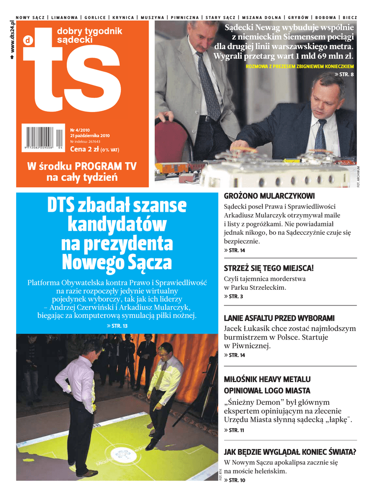 www.dts24.pl NOWY SĄCZ | LIMANOWA | GORLICE | KRYNICA | MUSZYNA | PIWNICZNA | STARY SĄCZ | MSZANA DOLNA | GRYBÓW | BOBOWA | BIECZ Sądecki Newag wybuduje wspólnie z niemieckim Siemensem pociągi dla drugiej linii warszawskiego metra. Wygrali przetarg wart 1 mld 69 mln zł. ROZMOWA Z PREZESEM ZBIGNIEWEM KONIECZKIEM J STR. 8 Nr 4/2010 21 października 2010 Nr indeksu: 267643 Cena 2 zł (0% VAT) FOT. ARCHIWUM W środku PROGRAM TV na cały tydzień GROŻONO MULARCZYKOWI DTS zbadał szanse kandydatów na prezydenta Nowego Sącza Sądecki poseł Prawa i Sprawiedliwości Arkadiusz Mularczyk otrzymywał maile i listy z pogróżkami. Nie powiadamiał jednak nikogo, bo na Sądecczyźnie czuje się bezpiecznie. J STR. 14 STRZEŻ SIĘ TEGO MIEJSCA! Czyli tajemnica morderstwa w Parku Strzeleckim. Platforma Obywatelska kontra Prawo i Sprawiedliwość na razie rozpoczęły jedynie wirtualny pojedynek wyborczy, tak jak ich liderzy – Andrzej Czerwiński i Arkadiusz Mularczyk, biegając za komputerową symulacją piłki nożnej. J STR. 3 LANIE ASFALTU PRZED WYBORAMI J STR. 13 Jacek Łukasik chce zostać najmłodszym burmistrzem w Polsce. Startuje w Piwnicznej. J STR. 14 MIŁOŚNIK HEAVY METALU OPINIOWAŁ LOGO MIASTA „Śnieżny Demon” był głównym ekspertem opiniującym na zlecenie Urzędu Miasta słynną sądecką „łapkę". J STR. 11 FOT. RTK JAK BĘDZIE WYGLĄDAŁ KONIEC ŚWIATA? W Nowym Sączu apokalipsa zacznie się na moście heleńskim. J STR. 10 2 DOBRY TYGODNIK SĄDECKI 21 października 2010 Z drugiej strony 8 lat bez telewizji! Raport, którego NIKt nie przeczyta W łaśnie opublikowano raport Najwyższej Izby Kontroli, z którego wynika, że w urzędach najchętniej i najczęściej zatrudniane osoby to krewniaki i pociotki. Dociekliwość raportu powala na łopatki. Dotychczas bowiem nie trzeba było wydawać pieniędzy na badania prowadzone przez ekipy fachowców, by dojść do podobnie smutnych wniosków. Wystarczył spacer po korytarzach urzędów. Nie wiemy jakiej metodologii użyła NIK, by rozgryźć orzeszek rodzinnych koligacji w urzędach, ale chyba nie pobierano w tym celu próbek DNA w kolejnych pokojach i wydziałach. Badanie kodu genetycznego to jedno, ale ważniejsze wydaje się tu zbadanie kodu politycznego osób wygrywających konkursy na ważne stanowiska. O takich nominacjach raport również wspomina, co oczywiście nie zmienia – i nie zmieni! – klucza doboru kadr w ważnych urzędach. Nawet najbardziej bowiem piorunujące raporty NIK mają to do siebie, że żyją w publicznej świadomości dzień albo tydzień, a zaraz potem znikają pod grubą kołderką kolejnych raportów, które również do żadnych zmian nie prowadzą. Po konkursach pozostaje – co potwierdza wspomniany raport – jedynie chwilowy smrodek. Wygrywają ci, którzy wygrać mają, a jeśli nie jesteś akurat krewnym albo znajomym królika, to twoja rola w konkursie ograniczy się do złożenia papierów. Chyba zatem lepiej już nie publikować podobnych raportów NIK, bo setki i tysiące ludzi wierzących w swoje wykształcenie oraz talent odejdzie kolejny raz z kwitkiem spod drzwi działu kadr jakiegoś urzędu. Tym sposobem już nie tylko na lata, ale na całe pokolenia utrwali się przekonanie, że lepiej stąd spieprzać, niż bezsensownie walczyć o stanowisko referenta, które i tak przecież zostało komuś przyznane przed otwarciem konkursowych kopert. Może warto o tym porozmawiać podczas samorządowej kampanii wyborczej. Tylko komu się będzie chciało o tym gadać? S T Y L Ż YC I A . Michalikowie z Ptaszkowej już osiem lat nie oglądają telewizji. Telewizor, owszem, stoi w salonie, ale sześcioosobowa rodzina zasiada przed nim tylko wtedy, kiedy mają przygotowany jakiś film na DVD. Potem odbiornik znowu gaśnie na dłużej. Jak to możliwe, że w domu pełnym dzieci nigdy nie jest włączona telewizja? Trochę przez przypadek, ale głównie dlatego, że młodsze dzieci musiały się nauczyć lepiej czytać. I tak już zostało na lata. Nikt w domu nie domaga się zresztą włączenia telewizji. Pierwszy przypadek miał miejsce końcem sierpnia, kiedy Krzysztof Michalik, znany na Sądecczyźnie działacz samorządowy, został poproszony o komentarz do głośnych wydarzeń na rocznicowym zjeździe „Solidarności” w Gdyni. – Na szczęście od ośmiu lat nie mam w domu telewizji, więc nie widziałem tego, co tam się działo – wyznał z rozbrajającą szczerością jeden z legendarnych działaczy związkowych z lat 80. Niewiarygodne? W czasach kiedy dużej części ludzkości spory kawałek życia upływa na przełączaniu pilotem kolejnych kanałów, żyją obok nas ludzie, którzy do telewizora niemal się nie zbliżają. Czyżby nie mieli prądu? Genowefa i Krzysztof Michalikowie mają w domu wszystkie zdobycze współczesnej techniki, dzieci chodzą do szkoły, a Krzysztof pracuje jako dyrektor w gminnym zakładzie komunalnym w Grybowie. Nie przeszkadza mu to nie oglądać telewizji. Jak do tego doszło? I tutaj trafiamy na drugi przypadek. W 2002 r. Michalikom korzystającym z usług jednej z satelitarnych telewizji skończył się abonament, a nowa oferta nie była specjalnie korzystna. Talerz poszedł w odstawkę, a tradycyjnej anteny w domu nie było. Telewizor zamilkł. Jak się FOT. ARCHIWUM Wojciech Molendowicz Z gór widać lepiej Rodzina Michalików zamiast przed telewizorem spędza czas m.in. na wspólnych wycieczkach miało okazać, na długie lata. Ale tu już przypadki się kończą. Niedługo potem Michalikowie posiadający dwoje własnych dzieci – Karola i Anię – zaprosili do swojej rodziny kolejną dwójkę dzieci – Marysię i Wojtka, tworząc dla nich rodzinę zastępczą. – Okazało się, że nasze nowe dzieci mają bardzo poważne problemy z czytaniem – wspomina Krzysztof Michalik. – Dlatego wieczorami zamiast gapić się w telewizor głośno czytaliśmy im książki. Szybko okazało się, że naszym dzieciom nie brakuje ogłupia
