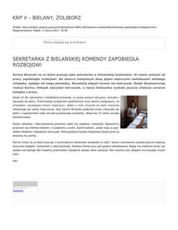 KRP V – BIELANY, ŻOLIBORZ Źródło: http://zoliborz.policja.waw.pl/r5/aktualnosci/3641,Sekretarka-z-bielanskiej-komendy-zapobiegla-rozbojowi.html Wygenerowano: Piątek, 3 marca 2017, 16:36 Strona znajduje się w archiwum. SEKRETARKA Z BIELAŃSKIEJ KOMENDY ZAPOBIEGŁA ROZBOJOWI Karina Wrzosek na co dzień pracuje jako sekretarka w bielańskiej komendzie. W czasie wolnym od pracy zapobiegła rozbojowi. Na dworcu kolejowym dwaj pijani mężczyźni zaatakowali młodego chłopaka, żądając od niego pieniędzy. Wcześniej zdążyli zerwać mu łańcuszek. Dzięki błyskawicznej reakcji Kariny chłopak odzyskał łańcuszek, a nasza koleżanka zyskała jeszcze większe uznanie kolegów z pracy. Około 15:30, sekretarka z bielańskiej komendy, w czasie wolnym od pracy, wracała z zakupów do domu. Przechodząc przejściem podziemnym przy dworcu kolejowym, na schodach, zauważyła trzech mężczyzn. Jeden z nich trzymał za kark znacznie młodszego do siebie mężczyznę. Gdy Karina Wrzosek podeszła bliżej usłyszała jak jeden z napastników żąda od pokrzywdzonego pieniędzy. Wówczas 21–latka zaczęła interweniować. Dzięki odwadze i zdecydowanej postawie udało się zapobiec rozbojowi. Napastnicy przerazili się drobnej kobietki i w popłochu uciekli. Zanim jednak „wzięli nogi za pas” oddali młodemu chłopakowi łańcuszek. Pokrzywdzony bardzo dziękował dziewczynie za okazaną mu pomoc. Karina, która na co dzień pracuje z kryminalnymi doskonale wiedziała co robić. Swoim zachowanie zyskała jeszcze większy szacunek kolegów i koleżanek z całej komendy. Postawa dziewczyny jest godna naśladowania. Nigdy nie wiadomo kiedy nas spotka coś takiego Nie możemy przechodzić obojętnie widząc takie sytuacje. Nie możemy być obojętni na krzywdę innych ludzi. (eb) Ocena: 0/5 (0) Tweetnij