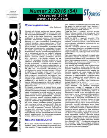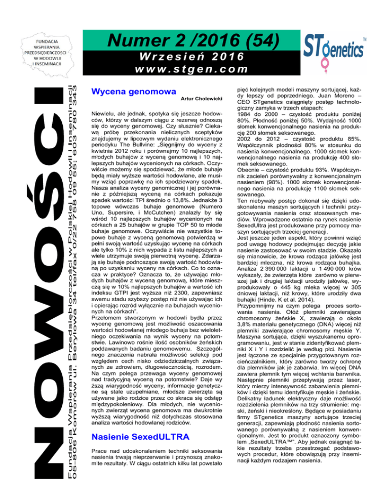 Numer 2 /2016 (54) Wrzesień 2016 www.stgen.com Wycena genomowa Artur Cholewicki Niewielu, ale jednak, spotyka się jeszcze hodowców, którzy w dalszym ciągu z rezerwą odnoszą się do wyceny genomowej. Czy słusznie? Ciekawą próbę przekonania nielicznych sceptyków znajdujemy w lipcowym wydaniu elektronicznego periodyku The Bullvine: „Sięgnijmy do wyceny z kwietnia 2012 roku i porównajmy 10 najlepszych, młodych buhajów z wyceną genomową i 10 najlepszych buhajów wycenionych na córkach. Oczywiście możemy się spodziewać, że młode buhaje będą miały wyższe wartości hodowlane, ale musimy wziąć poprawkę na ich spodziewany spadek. Nasza analiza wyceny genomicznej i jej porównanie z późniejszą wyceną na córkach pokazuje spadek wartości TPI średnio o 13,8%. Jednakże 3 topowe wówczas buhaje genomowe (Numero Uno, Supersire, i McCutchen) znalazły by się wśród 10 najlepszych buhajów wycenionych na córkach a 25 buhajów w grupie TOP 50 to młode buhaje genomowe. Oczywiście nie wszystkie topowe buhaje z wyceną genomową potwierdzą w pełni swoją wartość uzyskując wycenę na córkach ale tylko 10% z nich wypada z listu najlepszych a wiele utrzymuje swoją pierwotną wycenę. Zdarzają się buhaje podnoszące swoją wartość hodowlaną po uzyskaniu wyceny na córkach. Co to oznacza w praktyce? Oznacza to, że używając młodych buhajów z wyceną genomową, które mieszczą się w 10% najlepszych buhajów a wartość ich indeksu GTPI jest wyższa niż 2300, zapewniasz swemu stadu szybszy postęp niż nie używając ich i opierając rozród wyłącznie na buhajach wycenionych na córkach”. Przełomem stworzonym w hodowli bydła przez wycenę genomową jest możliwość oszacowania wartości hodowlanej młodego buhaja bez wieloletniego oczekiwania na wynik wyceny na potomstwie. Lawinowo rośnie ilość osobników żeńskich poddawanych badaniu genomowemu. Szczególnego znaczenia nabrała możliwość selekcji pod względem cech nisko odziedziczalnych związanych ze zdrowiem, długowiecznością, rozrodem. Na czym polega przewaga wyceny genomowej nad tradycyjną wyceną na potomstwie? Daje wy ższą wiarygodność wyceny, informacje genetyczne są stale uzupełniane, młodsze zwierzęta są używane jako rodzice przez co skraca się odstęp międzypokoleniowy. Dla młodych, nie wycenionych zwierząt wycena genomowa ma dwukrotnie wyższą wiarygodność niż dotychczas stosowana analiza wartości hodowlanej rodziców. Nasienie SexedULTRA Prace nad udoskonaleniem techniki seksowania nasienia trwają nieprzerwanie i przynoszą znakomite rezultaty. W ciągu ostatnich kilku lat powstało pięć kolejnych modeli maszyny sortującej, każdy lepszy od poprzedniego. Juan Moreno – CEO STgenetics osiągnięty postęp technologiczny zamyka w trzech etapach: 1984 do 2000 – czystość produktu poniżej 80%. Płodność poniżej 50%. Wydajność 1000 słomek konwencjonalnego nasienia na produkcję 200 słomek seksowanego. 2002 do 2012 – czystość produktu 85%. Współczynnik płodności 80% w stosunku do nasienia konwencjonalnego. 1000 słomek konwencjonalnego nasienia na produkcję 400 słomek seksowanego. Obecnie – czystość produktu 93%. Współczynnik zacieleń porównywalny z konwencjonalnym nasieniem (98%). 1000 słomek konwencjonalnego nasienia na produkcję 1100 słomek seksowanego. Ten niebywały postęp dokonał się dzięki udoskonaleniu maszyn sortujących i techniki przygotowywania nasienia oraz stosowanych mediów. Wprowadzone ostatnio na rynek nasienie SexedUltra jest produkowane przy pomocy maszyn sortujących trzeciej generacji. Jest jeszcze jeden aspekt, który powinni wziąć pod uwagę hodowcy podejmując decyzję jakie nasienie zastosować w swoim stadzie. Okazało się mianowicie, że krowa rodząca jałówkę jest bardziej mleczna, niż krowa rodząca buhajka. Analiza 2 390 000 laktacji u 1 490 000 krów wykazały, że zwierzęta które zarówno w pierwszej jak i drugiej laktacji urodziły jałówkę, wyprodukowały o 445 kg mleka więcej w 305 dniowej laktacji, niż krowy, które urodziły dwa buhajki (Hinde. K et al. 2014). Przypomnijmy na czym polega proces sortowania nasienia. Otóż plemniki zawierające chromosomy żeńskie X, zawierają o około 3,8% materiału genetycznego (DNA) więcej niż plemniki zawierające chromosomy męskie Y. Maszyna sortująca, dzięki wyszukanemu oprogramowaniu, jest w stanie zidentyfikować plemniki X i Y i rozdzielić je według płci. Nasienie jest łączone ze specjalnie przygotowanym rozcieńczalnikiem, który zarówno tworzy ochronę dla plemników jak je zabarwia. Im więcej DNA zawiera plemnik tym więcej wchłania barwnika. Następnie plemniki przepływają przez laser, który mierzy intensywność zabarwienia plemników i dzięki temu identyfikuje męskie i żeńskie. Delikatny ładunek elektryczny daje możliwość rozdzielenia plemników na trzy strumienie: męski, żeński i nieokreślony. Będące w posiadaniu firmy STgenetics maszyny sortujące trzeciej generacji, zapewniają płodność nasienia sortowanego porównywalną z nasieniem konwencjonalnym. Jest to produkt oznaczony symbolem „SexedULTRA™”. Aby jednak osiągnąć takie rezultaty trzeba przestrzegać podstawowych procedur, które obowiązują przy inseminacji każdym rodzajem nasienia. Nowości 2 Buhaje STgenetics Joanna Cholewicka bredu 6,9% i znakomite wykorzystanie paszy +203. Powiększyliśmy naszą ofertę buhajów reprezentujących firmę STgenetics do 22. Są wśród nich buhaje reprezentujące elitarną genetykę amerykańską – DENVER TPI 2708, DRACO TPI 2686 jak i takie, które znakomicie wypadają po przeliczeniu na polską bazę – MEGA WATT i CYPRUS indeks PF 151. Spływa do nas coraz więcej wyników o skuteczności nasienia SexedULTRA. Pochodzą one już z kilkunastu gospodarstw i większości są bardzo zadowalające. 151HO01611 DIXON ur. 24.12.2013 (ALTAOAK X ROBUST X PLANET) Wydajność matki w I l