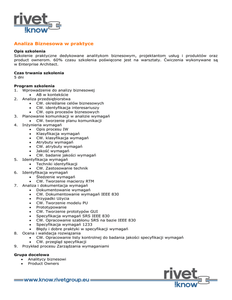 Analiza Biznesowa w praktyce Opis szkolenia Szkolenie praktyczne dedykowane analitykom biznesowym, projektantom usług i produktów oraz product ownerom. 60% czasu szkolenia poświęcone jest na warsztaty. Ćwiczenia wykonywane są w Enterprise Architect. Czas trwania szkolenia 5 dni Program szkolenia 1. Wprowadzenie do analizy biznesowej AB w kontekście 2. Analiza przedsiębiorstwa CW. określanie celów biznesowych CW. identyfikacja interesariuszy CW. opis procesów biznesowych 3. Planowanie komunikacji w analizie wymagań CW. tworzenie planu komunikacji 4. Inżynieria wymagań Opis procesu IW Klasyfikacja wymagań CW. klasyfikacja wymagań Atrybuty wymagań CW. atrybuty wymagań Jakość wymagań CW. badanie jakości wymagań 5. Identyfikacja wymagań Techniki identyfikacji CW. Zastosowanie technik 6. Identyfikacja wymagań Śledzenie wymagań CW. Tworzenie macierzy RTM 7. Analiza i dokumentacja wymagań Dokumentowanie wymagań CW. Dokumentowanie wymagań IEEE 830 Przypadki Użycia CW. Tworzenie modelu PU Prototypowanie CW. Tworzenie prototypów GUI Specyfikacja wymagań SRS IEEE 830 CW. Opracowanie szablonu SRS na bazie IEEE 830 Specyfikacja wymagań 1233 Błędy i dobre praktyki w specyfikacji wymagań 8. Ocena i walidacja rozwiązania CW. Opracowanie listy kontrolnej do badania jakości specyfikacji wymagań CW. przegląd specyfikacji 9. Przykład procesu Zarządzania wymaganiami Grupa docelowa Analitycy biznesowi Product Owners Wszyscy, którzy planują rozwój kariery zawodowej Język Szkolenie przeprowadzane jest w języku polskim lub angielskim. Materiały szkoleniowe dostępne są w języku polskim. W ramach szkolenia gwarantujemy Kompetentnego Trenera Komplet materiałów szkoleniowych Certyfikat ukończenia szkolenia Profesjonalną obsługę Lunch Przerwy kawowe Cena szkolenia 4000 zł netto
