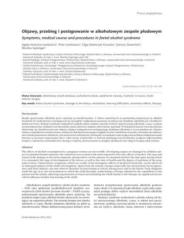 Praca poglądowa Objawy, przebieg i postępowanie w alkoholowym zespole płodowym Symptoms, medical course and procedures in foetal alcohol syndrome Agata Horecka-Lewitowicz1, Piotr Lewitowicz2, Olga Adamczyk-Gruszka3, Dariusz Skawiński4, Monika Szpringer1 Zakład Profilaktyki Społecznej, Instytut Zdrowia Publicznego, Wydział Nauk o Zdrowiu, Uniwersytet Jana Kochanowskiego w Kielcach Kierownik Zakładu: dr hab. n. hum. Monika Szpringer, prof. UJK 2 Zakład Patologii, Instytut Pielęgniarstwa i Położnictwa, Wydział Nauk o Zdrowiu, Uniwersytet Jana Kochanowskiego w Kielcach Kierownik Zakładu: prof. dr hab. n. med. Anna Nasierowska-Guttmejer 3 Zakład Położnictwa, Ginekologii i Pielęgniarstwa Położniczo-Ginekologicznego, Instytut Pielęgniarstwa i Położnictwa, Wydział Nauk o Zdrowiu, Uniwersytet Jana Kochanowskiego w Kielcach Dyrektor Instytutu: prof. dr hab. n. med. Grażyna Rydzewska 4 Zakład Profilaktyki i Epidemiologii Nowotworów, Instytut Zdrowia Publicznego, Wydział Nauk o Zdrowiu, Uniwersytet Jana Kochanowskiego w Kielcach Kierownik Zakładu: prof. dr hab. n. med. Sławomir Dutkiewicz 1 Studia Medyczne 2013; 29 (2): 195–198 Słowa kluczowe: alkoholowy zespół płodowy, uszkodzenie płodu, opóźnienie rozwoju, trudności w nauce, skutki wtórne, terapia. Key words: foetal alcohol syndrome, damage to the foetus, retardation, learning difficulties, secondary effects, therapy. Streszczenie Skutki spożywania alkoholu przez ciężarną są nieodwracalne. U dzieci narażonych na prenatalną ekspozycję na alkohol dochodzi do uszkodzenia rozwijających się narządów; najbardziej narażony na toksyczne działanie alkoholu jest ośrodkowy układ nerwowy. Rodzaj i nasilenie uszkodzeń u płodu zależy między innymi od ilości spożywanego alkoholu, czasu, w jakim jest przyjmowany, stadium rozwoju płodu, stanu zdrowia i stopnia odżywienia ciężarnej. W kolejnych fazach rozwoju dziecka obserwuje się charakterystyczne objawy, będące następstwem teratogennego działania alkoholu w życiu płodowym. Oprócz zmian o charakterze somatycznym, zwłaszcza charakterystycznego wyglądu twarzy i niedoboru wzrostu, stwierdza się zaburze nia w funkcjonowaniu szkolnym, rówieśniczym i rodzinnym. Istotnymi czynnikami wpływającymi na dalsze funkcjonowanie dziecka są wczesne rozpoznanie (do 6. roku życia), środowisko, w którym przebiega rozwój dziecka, podjęcie odpowiedniej terapii w zależności od możliwości chorego i rodziny, dostosowanie wymagań szkolnych oraz objęcie terapią całej rodziny. Abstract The effects of alcohol consumption by a pregnant woman are irreversible. Developing organs are damaged in children sub ject to prenatal alcohol exposure; the central nervous system is the most exposed to the toxic effects of alcohol. The type and extent of the damage in the foetus depends, among others, on the amount of consumed alcohol, the time span during which it is consumed, the stage of development of the foetus, as well as the state of health and the degree of nutrition of the preg nant woman. Characteristic symptoms, which are results of the teratogenic effects of alcohol in foetal life, can be observed in subsequent phases of the child’s development. Apart from the somatic changes (especially the characteristic facial appear ance and short stature), one may observe disorders in functioning at school, among peers and in the family. Early diagnosis (until the age of 6), the environment in which the child develops, undertaking a therapy adjusted to the capabilities of the patient and the family, adjusting requirements at school and including the whole family in the therapy are significant factors which influence further functioning of the child. Alkoholowy zespół płodowy (foetal alcohol syndrome – FAS) oraz spektrum poalkoholowych skutków roz wojowych (fetal alcohol spectrum disorder – FASD) są kon sekwencjami spożywania alkoholu przez ciężarną. Na każdym etapie ciąży alkohol działa toksycznie na rozwi jający się organizm płodu. Nie istnieje bezpieczna dawka alkoholu w ciąży. Skutki działania alkoholu na płód są nieodwracalne. Mimo deklarowanej przez kobiety świa Studia Medyczne 2013; 29/2 domości konsekwencji spożywania alkoholu podczas ciąży około 1/3 ciężarnych pije alkohol, często jako argu ment podając dobry wpływ niewielkich ilości alkoholu na rozwój dziecka. Rodzaj i nasilenie uszkodzeń u płodu zależą od ilo ści spożywanego alkoholu, czasu, w jakim jest przyj mowany, stadium rozwoju płodu w momencie naraże nia na wpływ alkoholu, stanu zdrowia i odżywienia 196 Agata Horecka-Lewitowicz, Piotr Lewitowicz, Olga Adamczyk-Gruszka, Dariusz Skawiński, Monika Szpringer kobiety, stosowania przez nią innych substancji psy choaktywnych, czynników genetycznych kobiety i płodu [1]. Alkohol może spowodować zgon płodu, anomalie rozwojowe, zaburzenia funkcjonowania i opóźnienie wzrostu. Najsilniej oddziałuje na roz wijający się układ nerwowy płodu. U dzieci matek pijących podczas ciąży bezpośrednio po porodzie ob serwowano objawy zespołu abstynencyjnego [2]. Po urodzeniu u tych dzieci mogą wystąpić poważne pro blemy związane z adaptacją oddechową i biochemicz ną, często stwierdza się hipoglikemię, hipokalcemię i hiperbilirubinemię [3]. U dzieci z FAS może się pojawić wiele nieprawidło wości rozwojowych, choć nie zawsze występują one w pełnym zestawie. Najbardziej charakterystyczna jest twarz dziecka [3–9], którą cechują specyficzne zmiany: • małogłowie, • spłaszczenie środkowej części twarzy, • szeroka nasada nosa – szerokie rozstawienie oczu nasila wrażenie spłaszczenia, • brak lub zmniejszenie czerwieni wargowej górnej, • krótki, zadarty nos, • brak lub spłaszczenie rynienki podnosowej, • niedorozwój żuchwy, niewielkie podbródek i broda, • szpary powiekowe skrócone przez występowanie zmarszczki nakątnej, • uszy nisko osadzone, małżowi