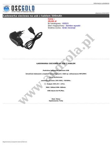 Informacje o produkcie Utworzono 03-03-2017 Ładowarka sieciowa na usb z kablem 500mAh Cena : 20,00 zł ro la .p l Nr katalogowy : 03521 Stan magazynowy : bardzo wysoki Średnia ocena : brak recenzji nd ŁADOWARKA SIECIOWA NA USB Z KABLEM Podróżna ładowarka sieciowa USB Umożliwia ładowanie urządzeń korzystających z USB np: odtwarzacze MP3/MP4 w .a Dane techniczne: zasilanie sieciowe 100-240V,~50/60Hz. Output: DC5.2V +-(5%). MAX: 500mA MIN: 400mA. w w USB złącze do PC/Mac. Wygenerowano w programie www.oscGold.com Stan: Nowy Opakowanie: Folia