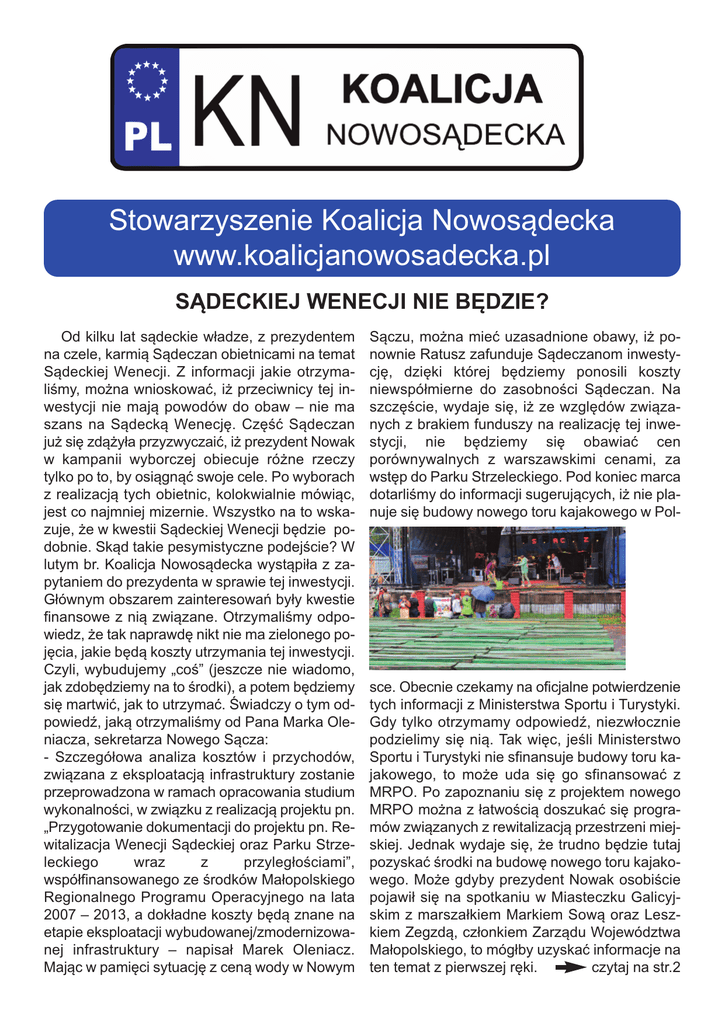 Stowarzyszenie Koalicja Nowosądecka www.koalicjanowosadecka.pl SĄDECKIEJ WENECJI NIE BĘDZIE? Od kilku lat sądeckie władze, z prezydentem na czele, karmią Sądeczan obietnicami na temat Sądeckiej Wenecji. Z informacji jakie otrzymaliśmy, można wnioskować, iż przeciwnicy tej inwestycji nie mają powodów do obaw – nie ma szans na Sądecką Wenecję. Część Sądeczan już się zdążyła przyzwyczaić, iż prezydent Nowak w kampanii wyborczej obiecuje różne rzeczy tylko po to, by osiągnąć swoje cele. Po wyborach z realizacją tych obietnic, kolokwialnie mówiąc, jest co najmniej mizernie. Wszystko na to wskazuje, że w kwestii Sądeckiej Wenecji będzie podobnie. Skąd takie pesymistyczne podejście? W lutym br. Koalicja Nowosądecka wystąpiła z zapytaniem do prezydenta w sprawie tej inwestycji. Głównym obszarem zainteresowań były kwestie finansowe z nią związane. Otrzymaliśmy odpowiedz, że tak naprawdę nikt nie ma zielonego pojęcia, jakie będą koszty utrzymania tej inwestycji. Czyli, wybudujemy „coś” (jeszcze nie wiadomo, jak zdobędziemy na to środki), a potem będziemy się martwić, jak to utrzymać. Świadczy o tym odpowiedź, jaką otrzymaliśmy od Pana Marka Oleniacza, sekretarza Nowego Sącza: - Szczegółowa analiza kosztów i przychodów, związana z eksploatacją infrastruktury zostanie przeprowadzona w ramach opracowania studium wykonalności, w związku z realizacją projektu pn. „Przygotowanie dokumentacji do projektu pn. Rewitalizacja Wenecji Sądeckiej oraz Parku Strzeleckiego wraz z przyległościami”, współfinansowanego ze środków Małopolskiego Regionalnego Programu Operacyjnego na lata 2007 – 2013, a dokładne koszty będą znane na etapie eksploatacji wybudowanej/zmodernizowanej infrastruktury – napisał Marek Oleniacz. Mając w pamięci sytuację z ceną wody w Nowym Sączu, można mieć uzasadnione obawy, iż ponownie Ratusz zafunduje Sądeczanom inwestycję, dzięki której będziemy ponosili koszty niewspółmierne do zasobności Sądeczan. Na szczęście, wydaje się, iż ze względów związanych z brakiem funduszy na realizację tej inwestycji, nie będziemy się obawiać cen porównywalnych z warszawskimi cenami, za wstęp do Parku Strzeleckiego. Pod koniec marca dotarliśmy do informacji sugerujących, iż nie planuje się budowy nowego toru kajakowego w Pol- sce. Obecnie czekamy na oficjalne potwierdzenie tych informacji z Ministerstwa Sportu i Turystyki. Gdy tylko otrzymamy odpowiedź, niezwłocznie podzielimy się nią. Tak więc, jeśli Ministerstwo Sportu i Turystyki nie sfinansuje budowy toru kajakowego, to może uda się go sfinansować z MRPO. Po zapoznaniu się z projektem nowego MRPO można z łatwością doszukać się programów związanych z rewitalizacją przestrzeni miejskiej. Jednak wydaje się, że trudno będzie tutaj pozyskać środki na budowę nowego toru kajakowego. Może gdyby prezydent Nowak osobiście pojawił się na spotkaniu w Miasteczku Galicyjskim z marszałkiem Markiem Sową oraz Leszkiem Zegzdą, członkiem Zarządu Województwa Małopolskiego, to mógłby uzyskać informacje na ten temat z pierwszej ręki. czytaj na str.2 Stowarzyszenie Koalicja Nowosądecka str. 1 Szanowni Państwo, Drodzy Sądeczanie, Zapraszamy do lektury „Wiosennej Koalicji”. Z pewnością warto przeczytać artykuł dotyczący trzech ważnych inwestycji. Niezwykle istotna jest też kwestia środków unijnych, o której mówi kolejny tekst. Wszyscy jesteśmy ciekawi, jak wygląda problem, związany z Sądecką Wenecją. Będzie, czy nie będzie? Oto jest pytanie, na które Autor kolejnego artykułu próbuje odpowiedzieć. Młodzi ludzie to nadzieja na lepsze jutro, budowanie nowej sądeckiej przyszłości. To świadoma i niezwykle ważna część naszej społeczności, która widzi i ocenia to, co wokół nas się dzieje. Przeczytajmy zatem o tym, jakie młodzież sądecka ma oczekiwania od prezydenta, Ryszarda Nowaka. W tym numerze znajdziecie również Państwo informacje na temat naszych sądeckich bolączek, związanych z niektórymi osiedlami. Szeroko rozumiana przestrzeń publiczna, która nas otacza, stanowi podstawę egzystencji każdego człowieka. Powinna być zatem przyjazna, bezpieczna i co jest również istotne, estetyczna i ułatwiająca życie, a nie utrudniająca. A czy tak jest w naszym urokliwym, ale zaniedbanym pod wieloma względami mieście? Różnorodne problemy, trudne i kontrowersyjne sprawy nie ujdą naszej uwadze. Cały czas staramy się bacznie obserwować to, co się dzieje w Nowym Sączu. Cieszymy się z pozytywów, ale zwracamy także uwagę na to, co niepokojące i przykre dla mieszkańców miasta. W tym miejscu prosimy Was o współpracę, czyli zgłaszanie drogą mailową wszelkich istotnych Waszym zdaniem problemów. Życzymy przyjemnej lektury i optymistycznego wiosennego nastroju! Za Zarząd Koalicji Nowosądeckiej dr Katarzyna Godek Wiceprezes, redaktor naczelna Wydawca: Stowarzyszenie Koalicja Nowosądecka Zespół redakcyjny: Katarzyna Godek, Artur Bochenek, Barbara Krawczyk, Paweł Kupczak, Wojciech Popardowski, Jacek Żelasko Zdjęcia: źródło: Koalicja Nowosądecka Współpraca: Pełnomocnicy osiedlowi Skład i łamanie: Tadeusz Krawczyk Adres Redakcji: Stowarzyszenie Koalicja Nowosądecka 33-300 Nowy Sącz, ul. Nowy Świat 2 Tel. (+48 18) 545 05 45; e-mail: [email protected], [email protected] strona www: www.koalicjanowosadecka.pl dr Katarzyna Godek redaktor naczelny SĄDECKIEJ WENECJI NIE BĘDZIE? .........................................................................................2 KILKA SŁÓW O ŚRODKACH UNIJNYCH .........................................................................................2 INWESTYCJE .........................................................................................3 CZEGO OCZEKUJE SĄDECKA MŁODZIEŻ OD PREZYDENTA? .........................................................................................4 KRÓTKA 