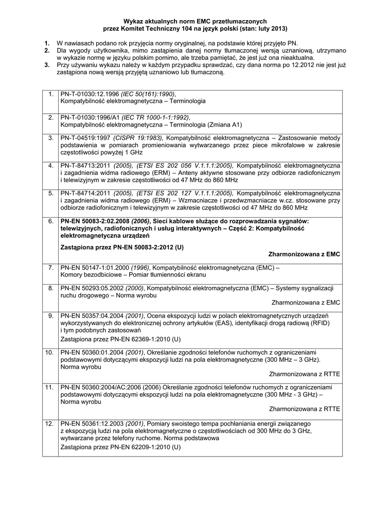 Wykaz aktualnych norm EMC przetłumaczonych przez Komitet Techniczny 104 na język polski (stan: luty 2013) 1. 2. 3. W nawiasach podano rok przyjęcia normy oryginalnej, na podstawie której przyjęto PN. Dla wygody użytkownika, mimo zastąpienia danej normy tłumaczonej wersją uznaniową, utrzymano w wykazie normę w języku polskim pomimo, ale trzeba pamiętać, że jest już ona nieaktualna. Przy używaniu wykazu należy w każdym przypadku sprawdzać, czy dana norma po 12.2012 nie jest już zastąpiona nową wersją przyjętą uznaniowo lub tłumaczoną. 1. PN-T-01030:12.1996 (IEC 50(161):1990), Kompatybilność elektromagnetyczna – Terminologia 2. PN-T-01030:1996/A1 (IEC TR 1000-1-1:1992), Kompatybilność elektromagnetyczna – Terminologia (Zmiana A1) 3. PN-T-04519:1997 (CISPR 19:1983), Kompatybilność elektromagnetyczna – Zastosowanie metody podstawienia w pomiarach promieniowania wytwarzanego przez piece mikrofalowe w zakresie częstotliwości powyżej 1 GHz 4. PN-T-84713:2011 (2005), (ETSI ES 202 056 V.1.1.1:2005), Kompatybilność elektromagnetyczna i zagadnienia widma radiowego (ERM) – Anteny aktywne stosowane przy odbiorze radiofonicznym i telewizyjnym w zakresie częstotliwości od 47 MHz do 860 MHz 5. PN-T-84714:2011 (2005), (ETSI ES 202 127 V.1.1.1:2005), Kompatybilność elektromagnetyczna i zagadnienia widma radiowego (ERM) – Wzmacniacze i przedwzmacniacze w.cz. stosowane przy odbiorze radiofonicznym i telewizyjnym w zakresie częstotliwości od 47 MHz do 860 MHz 6. PN-EN 50083-2:02.2008 (2006), Sieci kablowe służące do rozprowadzania sygnałów: telewizyjnych, radiofonicznych i usług interaktywnych – Część 2: Kompatybilność elektromagnetyczna urządzeń Zastąpiona przez PN-EN 50083-2:2012 (U) Zharmonizowana z EMC 7. PN-EN 50147-1:01.2000 (1996), Kompatybilność elektromagnetyczna (EMC) – Komory bezodbiciowe – Pomiar tłumienności ekranu 8. PN-EN 50293:05.2002 (2000), Kompatybilność elektromagnetyczna (EMC) – Systemy sygnalizacji ruchu drogowego – Norma wyrobu Zharmonizowana z EMC 9. PN-EN 50357:04.2004 (2001), Ocena ekspozycji ludzi w polach elektromagnetycznych urządzeń wykorzystywanych do elektronicznej ochrony artykułów (EAS), identyfikacji drogą radiową (RFID) i tym podobnych zastosowań Zastąpiona przez PN-EN 62369-1:2010 (U) 10. PN-EN 50360:01.2004 (2001), Określanie zgodności telefonów ruchomych z ograniczeniami podstawowymi dotyczącymi ekspozycji ludzi na pola elektromagnetyczne (300 MHz – 3 GHz). Norma wyrobu Zharmonizowana z RTTE 11. PN-EN 50360:2004/AC:2006 (2006) Określanie zgodności telefonów ruchomych z ograniczeniami podstawowymi dotyczącymi ekspozycji ludzi na pola elektromagnetyczne (300 MHz - 3 GHz) – Norma wyrobu Zharmonizowana z RTTE 12. PN-EN 50361:12.2003 (2001), Pomiary swoistego tempa pochłaniania energii związanego z ekspozycją ludzi na pola elektromagnetyczne o częstotliwościach od 300 MHz do 3 GHz, wytwarzane przez telefony ruchome. Norma podstawowa Zastąpiona przez PN-EN 62209-1:2010 (U) -2- 13. PN-EN 50364:04.2012 (2010), Ograniczenie ekspozycji ludzi w polach elektromagnetycznych urządzeń pracujących w zakresie częstotliwości od 0 Hz do 300 GHz, wykorzystywanych do elektronicznego nadzoru artykułów (EAS), identyfikacji z wykorzystaniem fal radiowych (RFID) i podobnych zastosowań Zharmonizowana z RTTE, LVD 14. PN-EN 50370-1:2007 (2005), Kompatybilność elektromagnetyczna (EMC) – Norma grupy wyrobów dotycząca obrabiarek – Część 1: Emisja Zharmonizowana z EMC 15. PN-EN 50370-2:03.2005 (2003), Kompatybilność elektromagnetyczna (EMC) – Norma grupy wyrobów – obrabiarki – Część 2: Odporność Zharmonizowana z EMC 16. PN-EN 50371:12.2004 (2002), Zgodność elektronicznych i elektrycznych urządzeń małej mocy z ograniczeniami podstawowymi dotyczącymi ekspozycji ludzi w polach elektromagnetycznych o częstotliwościach od 10MHz do 300 GHz – Ludność – Norma ogólna Zharmonizowana z EMC i RTTE 17. PN-EN 50383:05.2005 (2002), Obliczenia i pomiary intensywności pola elektromagnetycznego i swoistego tempa pochłaniania energii związanego z ekspozycją ludzi w polach elektromagnetycznych o częstotliwościach od 110 MHz do 40 GHz, wytwarzanych przez radiowe stacje bazowe i stałe stacje końcowe bezprzewodowych systemów telekomunikacyjnych. Norma podstawowa Zastąpiona przez PN-EN 50383:2011 (U) 18. PN-EN 50384:12.2004 (2002), Norma grupy wyrobów dla wykazania zgodności radiowych stacji bazowych i stacjonarnych stacji końcowych systemów bezprzewodowej telekomunikacji z ograniczeniami podstawowymi lub poziomami odniesienia dotyczącymi ekspozycji ludzi w polach elektromagnetycznych częstotliwości radiowych (110 MHz – 40 MHz). Ekspozycja zawodowa 19. PN-EN 50385:10.2004 (2002), Norma grupy wyrobów dla wykazania zgodności radiowych stacji bazowych i stacjonarnych stacji końcowych systemów bezprzewodowej telekomunikacji z ograniczeniami podstawowymi lub poziomami odniesienia dotyczącymi ekspozycji ludzi w polach elektromagnetycznych częstotliwości radiowych (110 MHz – 40 MHz). Ekspozycja ludności Zharmonizowana z RTTE 20. PN-EN 50401:02.2008 (2006) Norma wyrobu do oceny zgodności wprowadzanych do eksploatacji stacjonarnych urządzeń nadawczych (od 110 MHz do 40 GHz) przeznaczonych do stosowania w sieciach telekomunikacyjnych z ograniczeniami podstawowymi lub poziomami odniesienia dotyczącymi ekspozycji ludności na pola elektromagnetyczne Zharmonizowana z RTTE 21. PN-EN 50413:01:2013 (2008), Norma podstawowa dotycząca metody pomiaru i obliczeń ekspozycji ludzi w polach elektrycznych, magnetycznych i elektromagnetycznych (0 Hz – 300 GHz) 22. PN-EN 50498:08.2011 (2010), Kompatybilność elektromagnetyczna (EMC) – Norma rodziny wyrobów dla samochodowych urządzeń elektronicznych przeznaczonych do obrotu detalicznego Zharmonizowana z EMC 23. PN-EN 55011:05.2012 (2010), Urządzenia przemysłowe, naukowe i medyczne – Charakterystyki z