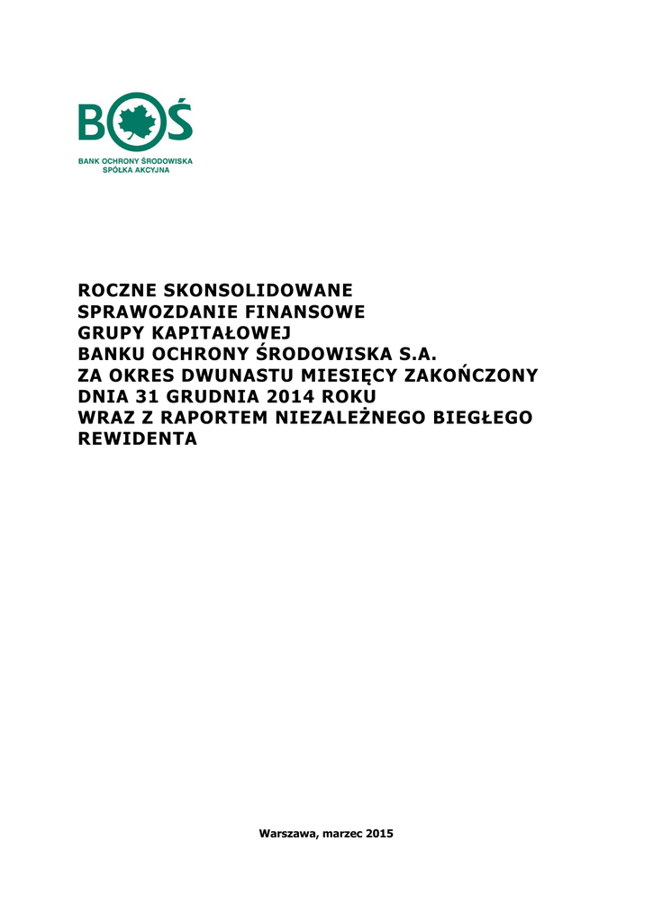 ROCZNE SKONSOLIDOWANE SPRAWOZDANIE FINANSOWE GRUPY KAPITAŁOWEJ BANKU OCHRONY ŚRODOWISKA S.A. ZA OKRES DWUNASTU MIESIĘCY ZAKOŃCZONY DNIA 31 GRUDNIA 2014 ROKU WRAZ Z RAPORTEM NIEZALEŻNEGO BIEGŁEGO REWIDENTA Warszawa, marzec 2015 Roczne Skonsolidowane Sprawozdanie Finansowe Grupy Kapitałowej BOŚ S.A. za okres dwunastu miesięcy zakończony dnia 31 grudnia 2014 r. w tys. zł Spis treści do rocznego skonsolidowanego sprawozdania finansowego zgodnie z MSSF zatwierdzonymi przez UE Strona Roczny skonsolidowany rachunek zysków i strat............................................................................ 3 Roczne skonsolidowane sprawozdanie z całkowitych dochodów ...................................................... 4 Roczne skonsolidowane sprawozdanie z sytuacji finansowej ........................................................... 5 Roczne skonsolidowane sprawozdanie ze zmian w kapitale własnym ............................................... 6 Roczne skonsolidowane sprawozdanie z przepływów pieniężnych ................................................... 7 Dodatkowe noty objaśniające do rocznego skonsolidowanego sprawozdania finansowego ................ 9 1. Podstawowe informacje o Banku Ochrony Środowiska S.A. i Grupie Kapitałowej Banku Ochrony Środowiska S.A. ................................................................................................................... 9 2. Informacje o przyjętych zasadach (polityce) rachunkowości przy sporządzaniu skonsolidowanego sprawozdania finansowego .................................................................................................. 14 3. Korekty błędów dotyczących poprzednich okresów ................................................................ 36 4. Ważniejsze oszacowania i oceny .......................................................................................... 36 5. Zarządzanie ryzykiem.......................................................................................................... 40 6. Wynik z tytułu odsetek........................................................................................................ 90 7. Wynik z tytułu opłat i prowizji .............................................................................................. 91 8. Wynik na działalności handlowej .......................................................................................... 91 9. Wynik na inwestycyjnych (lokacyjnych) papierach wartościowych ........................................... 91 10. Wynik z pozycji wymiany..................................................................................................... 92 11. Pozostałe przychody operacyjne .......................................................................................... 92 12. Pozostałe koszty operacyjne ................................................................................................ 92 13. Wynik odpisów (netto) z tytułu utraty wartości...................................................................... 93 14. Ogólne koszty administracyjne............................................................................................. 93 15. Świadczenia pracownicze .................................................................................................... 94 16. Obciążenia podatkowe ........................................................................................................ 94 17. Zysk przypadający na jedną akcję ........................................................................................ 95 18. Kasa, środki w Banku Centralnym ........................................................................................ 95 19. Lokaty w innych bankach oraz kredyty i pożyczki udzielone innym bankom.............................. 96 20. Papiery wartościowe przeznaczone do obrotu........................................................................ 96 21. Kredyty i pożyczki udzielone klientom ................................................................................... 97 22. Inwestycyjne (lokacyjne) papiery wartościowe ...................................................................... 99 23. Wartości niematerialne.......................................................................................................103 24. Rzeczowe aktywa trwałe ....................................................................................................106 25. Inne aktywa ......................................................................................................................107 26. Zobowiązania wobec innych banków ...................................................................................108 27. Zobowiązania wobec klientów .............................................................................................108 28. Zobowiązania z tytułu emisji bankowych papierów wartościowych .........................................109 1 Roczne Skonsolidowane Sprawozdanie Finansowe Grupy Kapitałowej BOŚ S.A. za okres dwunastu miesięcy zakończony dnia 31 grudnia 2014 r. w tys. zł 29. Zobowiązania podporządkowane .........................................................................................110 30. Rezerwy ...........................................................................................................................112 31. Odroczony podatek dochodowy ..........................................................................................116 32. Pozostałe zobowiązania......................................................................................................117 33. Aktywa i zobowiązania warunkowe......................................................................................118 34. Działalność maklerska ........................................................................................................120 35. Kapitał podstawowy...............................................