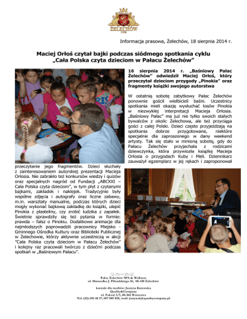 Informacja prasowa, Żelechów, 18 sierpnia 2014 r. Maciej Orłoś czytał bajki podczas siódmego spotkania cyklu „Cała Polska czyta dzieciom w Pałacu Żelechów” 16 sierpnia 2014 r. „Baśniowy Pałac Żelechów” odwiedził Maciej Orłoś, który przeczytał dzieciom przygody „Pinokia” oraz fragmenty książki swojego autorstwa przeczytanie jego fragmentów. Dzieci słuchały z zainteresowaniem autorskiej prezentacji Macieja Orłosia. Nie zabrakło też konkursów wiedzy i quizów oraz specjalnych nagród od Fundacji „ABCXXI – Cała Polska czyta dzieciom”, w tym płyt z czytanymi bajkami, zakładek i naklejek. Tradycyjnie były wspólne zdjęcia i autografy oraz liczne zabawy, m.in. warsztaty manualne, podczas których dzieci mogły wykonać bajkową zakładkę do książki, ulepić Pinokia z plasteliny, czy zrobić ludzika z zapałek. Świetnie sprawdziły się też pytania w formie: prawda – fałsz o Pinokiu. Dodatkowe animacje dla najmłodszych poprowadzili pracownicy Miejsko Gminnego Ośrodka Kultury oraz Biblioteki Publicznej w Żelechowie, którzy aktywnie uczestniczą w akcji ”Cała Polska czyta dzieciom w Pałacu Żelechów” i kolejny raz pracowali twórczo z dziećmi podczas spotkań w „Baśniowym Pałacu”. W ostatnią sobotę zabytkowy Pałac Żelechów ponownie gościł wielbicieli baśni. Uczestnicy spotkania mieli okazję wysłuchać losów Pinokia w niezwykłej interpretacji Macieja Orłosia. „Baśniowy Pałac” ma już nie tylko swoich stałych bywalców z okolic Żelechowa, ale też przyciąga gości z całej Polski. Dzieci często przyjeżdżają na spotkania dobrze przygotowane, niektóre specjalnie dla zaproszonego w dany weekend artysty. Tak się stało w minioną sobotę, gdy do Pałacu Żelechów przyjechała z rodzicami dziewczynka, która przywiozła książkę Macieja Orłosia o przygodach Kuby i Meli. Dziennikarz zauważył egzemplarz w jej rękach i zaproponował Pałac Żelechów SPA & Wellness ul. Marszałka J. Piłsudskiego 36, 08-430 Żelechów kontakt dla mediów: Justyna Kurowska Quality&Company ul. Foksal 3/5, 00-366 Warszawa Tel: (22) 692 48 37, 607 085 850, mail: [email protected] W najbliższą sobotę, 23 sierpnia o godz. 17.00 odbędzie się już ósme i zarazem przedostatnie wakacyjne spotkanie w ramach akcji „cała Polska czyta dzieciom w Pałacu Żelechów”. Tym razem gościem specjalnym „Baśniowego Pałacu” będzie Paulina Holtz. Akcja „Cała Polska czyta dzieciom w Pałacu Żelechów” promująca głośnie czytanie dzieciom jest prowadzona przez wszystkie sobotnie popołudnia lipca i sierpnia 2014 r. (spotkanie z gościem specjalnym ok. godz. 17.00). Aktywności są planowane na terenie pałacowego parku, który wraz z budynkiem Pałacu został wpisany na listę zabytków. XVIII-wieczny Pałac Żelechów utrzymany w stylu klasycystycznym ma ciekawą historię, sam Brzechwa pisał: „wiadomo, że Żelechów słynie z dziadków do orzechów” („Orzech”). Obecnie kompleks pałacowo-parkowy w mazowieckim Żelechowie (87 km od Warszawy i 87 km od Lublina) funkcjonuje jako obiekt konferencyjno-wypoczynkowy posiadając 75 stylowych pokoi, własny browar, SPA & Wellness, stawy rybne i pałacowe lochy. Podczas kolejnych spotkań w „Baśniowym Pałacu” znane z mediów osoby, aktorzy, autorzy bajek i dziennikarze przenoszą dzieci w świat baśniowych bohaterów jak: „Jaś i Małgosia”, „Kopciuszek”, „Królewna Śnieżka”, „Pinokio”, „Calineczka”, „Śpiąca królewna”, ale również i wydawniczych niespodzianek. Inicjatywa „Baśniowy Pałac” skierowana jest do wszystkich chętnych dzieci - mile widziane są dzieci z Żelechowa i okolic. Wstęp na spotkania jest bezpłatny. Społeczna inicjatywa Pałacu Żelechów jest promowana wśród lokalnej społeczności, wpierają ją także lokalne władze, biblioteka, ośrodek kultury i miłośnicy rozwijania czytelnictwa wśród dzieci oraz media. Akcję wsparło wielu artystów m.in. Ewa Błaszczyk, Barbara i Jacek Bursztynowicz, Marta Kuligowska, Maciej Orłoś, Radosław Pazura, Joanna Trzepiecińska, czy Michał Zawadka. „Baśniowy Pałac” został objęty patronatem przez Fundację „ABCXXI – Cała Polska czyta dzieciom”, Burmistrz miasta Żelechowa, TVP Lublin, Tygodnik Siedlecki, Radio Podlasie oraz portale: podlasie24.pl; kuriergarwolinski.pl; miastodzieci.pl i Qlturka.pl. Pałac Żelechów SPA & Wellness ul. Marszałka J. Piłsudskiego 36, 08-430 Żelechów kontakt dla mediów: Justyna Kurowska Quality&Company ul. Foksal 3/5, 00-366 Warszawa Tel: (22) 692 48 37, 607 085 850, mail: [email protected] Patronaty: Burmistrz Żelechowa - Koniec - Kontakt dla mediów Justyna Kurowska – PR Manager Tel: 607 085 850; (22) 692 48 37 [email protected] Pałac Żelechów SPA & Wellness – zabytkowy obiekt pałacowy na Mazowszu Odrestaurowany XVIII-wieczny Pałac w Żelechowie od 2013 roku funkcjonuje jako luksusowy Pałac SPA & Wellness łącząc zabytkowy klimat z wysmakowanym wystrojem wnętrz i nowoczesnym wyposażeniem. Posiada 75 stylowych pokoi mogących pomieścić łącznie 150 osób. Kompleks pałacowo-parkowy w Żelechowie ma bogatą historię związaną m.in. z Romualdem Trauguttem i „Dziadkiem do orzechów” Jana Brzechwy, posiada własne stawy rybne i pałacowy browar uchodzący za skarb Pałacu. Budynki obiektu są połączone lochami, zaś pałacowe SPA to niezwykła podróż do strefy niezapomnianych, zmysłowych doznań. Więcej informacji na: www.palaczelechow.pl Pałac Żelechów SPA & Wellness ul. Marszałka J. Piłsudskiego 36, 08-430 Żelechów kontakt dla mediów: Justyna Kurowska Quality&Company ul. Foksal 3/5, 00-366 Warszawa Tel: (22) 692 48 37, 607 085 850, mail: [email protected]