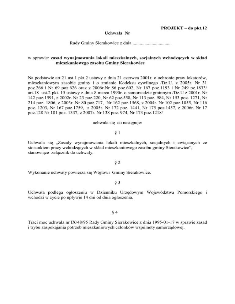 PROJEKT – do pkt.12 Uchwała Nr Rady Gminy Sierakowice z dnia ................................. w sprawie: zasad wynajmowania lokali mieszkalnych, socjalnych wchodzących w skład mieszkaniowego zasobu Gminy Sierakowice Na podstawie art.21 ust.1 pkt.2 ustawy z dnia 21 czerwca 2001r. o ochronie praw lokatorów, mieszkaniowym zasobie gminy i o zmianie Kodeksu cywilnego /Dz.U. z 2005r. Nr 31 poz.266 i Nr 69 poz.626 oraz z 2006r.Nr 86 poz.602, Nr 167 poz.1193 i Nr 249 pz.1833/ art.18 ust.2 pkt. 15 ustawy z dnia 8 marca 1990r. o samorzadzie gminnym /Dz.U z 2001r. Nr 142 poz.1591, z 2002r. Nr 23 poz.220, Nr 62 poz.558, Nr 113 poz. 984, Nr 153 poz. 1271, Nr 214 poz. 1806, z 2003r. Nr 80 poz.717, Nr 162 poz.1568, z 2004r. Nr 102 poz.1055, Nr 116 poz. 1203, Nr 167 poz.1759, z 2005r. Nr 172 poz. 1441, Nr 175 poz.1457, z 2006r. Nr 17 poz.128 Nr 181 poz. 1337, z 2007r. Nr 138 poz. 974, Nr 173 poz.1218/ uchwala się co następuje: §1 Uchwala się „Zasady wynajmowania lokali mieszkalnych, socjalnych i związanych ze stosunkiem pracy wchodzących w skład mieszkaniowego zasobu gminy Sierakowice”, stanowiące załącznik do uchwały. §2 Wykonanie uchwały powierza się Wójtowi Gminy Sierakowice. §3 Uchwała podlega ogłoszeniu w Dzienniku Urzędowym Województwa Pomorskiego i wchodzi w Ŝycie po upływie 14 dni od dnia ogłoszenia. §4 Traci moc uchwała nr IX/48/95 Rady Gminy Sierakowice z dnia 1995-01-17 w sprawie zasad i trybu zaspokajania potrzeb mieszkaniowych członków wspólnoty samorządowej. Załącznik do Uchwały Nr.......... Rady Gminy Sierakowice z dnia ...................... Zasady wynajmowania lokali mieszkalnych, socjalnych wchodzących w skład mieszkaniowego zasobu Gminy Sierakowice. §1 Lokale mieszkalne wchodzące w skład mieszkaniowego zasobu gminy mogą być przedmiotem najmu i zamiany wyłącznie na rzecz osób fizycznych. §2 Lokal mieszkalny moŜe być oddany w najem na czas nieoznaczony osobie, która spełnia łącznie następujące warunki: 1) przed złoŜeniem wniosku o najem lokalu zamieszkiwała i była zameldowana na pobyt stały przed okres co najmniej 5 lat a terenie Gminy Sierakowice; 2) nie posiada tytułu prawnego do innego lokalu lub domu mieszkalnego albo zamieszkuje w lokalu, w którym powierzchnia uŜytkowa na jedną osobę nie przekracza 5m²; 3) średni dochód /brutto/ na jednego członka gospodarstwa domowego z okresu 3 miesięcy poprzedzających datę złoŜenia wniosku jest niŜszy niŜ 120 % najniŜszej emerytury w gospodarstwie jednoosobowym i 60% najniŜszej emerytury w gospodarstwie wieloosobowym. §3 1. Pierwszeństwo wynajmu lokalu mieszkalnego z mieszkaniowego zasobu Gminy Sierakowice przysługuje w następującej kolejności: 1) pozbawionym mieszkań w wyniku klęski Ŝywiołowej lub innego zdarzenia losowego; 2) zajmującym lokale w budynkach stanowiących mienie komunalne gminy przeznaczonych do rozbiórki decyzją organu nadzoru budowlanego; 3) zajmującym lokale przeznaczone na cele edukacyjne i ochrony zdrowia; 4) zajmującym lokale przeznaczone do rozbiórki w związku z inwestycją gminy; 5) rodzinom wielodzietnym znajdującym się w trudnych warunkach mieszkaniowych i osiągającym dochód nie wyŜszy niŜ 120% najniŜszej emerytury w gospodarstwie jednoosobowym i 60 % najniŜszej emerytury w gospodarstwie wieloosobowym; 6) osobom, które opuściły dom dziecka w związku z uzyskaniem pełnoletności nie mając moŜliwości powrotu do lokalu zajmowanego przed umieszczeniem pod warunkiem, Ŝe ostatnim miejscem zamieszkania przed pobytem w domu dziecka był teren Gminy Sierakowice; 7) uprawnionym na podstawie przepisów szczegółowych. 2. Za rodziny znajdujące się w trudnych warunkach mieszkaniowych uznaje się rodziny mieszkające w lokalu, w którym na członka gospodarstwa domowego przypada mniej niŜ 5 m² powierzchni uŜytkowej a lokal nie spełnia wymogów pomieszczeń przeznaczonych na pobyt stały ludzi. 3. Warunki określone w ust.1 pkt.2 i 4 muszą być spełnione równieŜ w chwili zawarcia umowy najmu. 4. Za dochód, o którym mowa w ust.1 pkt.5 uwaŜa się dochód, bez względu na tytuł i źródło, uzyskany łącznie przez wnioskodawcę i członków jego rodziny, zgłoszonych do wspólnego zamieszkiwania lokalu, po odliczeniu składek na ubezpieczenie emerytalne i rentowe oraz na ubezpieczenie chorobowe określone w przepisach o ubezpieczeniu społecznym, chyba Ŝe składki zostały zaliczone do kosztów uzyskania przychodów, 5. Średni miesięczny dochód ustala się przyjmując za podstawę dochód z okresu ostatnich trzech miesięcy poprzedzających złoŜenie wniosku. Dochód podlega ponownemu ustaleniu w momencie kwalifikowania do przydziału lokalu mieszkalnego. §4 1. W przypadku opuszczenia przez najemcę lokalu mieszkalnego i pozostania w nim osób zamieszkujących dotychczas wspólnie z najemcą, pierwszeństwo do zawarcia umowy przysługuje zamieszkującym i zameldowanym w tym lokalu przez okres co najmniej 5 lat: 1) pełnoletnim dzieciom; 2) osobom przysposobionym; 3) rodzicom o ile spełniają kryterium określone w § 3 ust.4. 2. W przypadku śmierci najemcy do wstąpienia w stosunek najmu stosuje się przepisy art.691 Kodeksu cywilnego. 3. Zasady określone w ust.1i 2 nie dotyczą osób, które w chwili śmierci najemcy miały tytuł prawny do zajmowania innego lokalu mieszkalnego lub domu jedno lub wielorodzinnego. §5 1.Z mieszkaniowego zasobu wydziela się część lokali z przeznaczeniem na wynajem jako lokale socjalne. 2. Wykaz lokali socjalnych stanowi załącznik nr 2 do uchwały. §6 1. Na lokale socjalne Rada Gminy moŜe przeznaczyć lokale mieszkalne o obniŜonym standardzie lecz nadające się do zamieszkania, w przypadku opuszczenia ich przez dotychczasowych najemców. W lokalu socjalnym powierzchnia pokoi przypadających na jednego członka gospodarstwa domowego nie moŜe być mniejsza niŜ 5 m², a w przypadku gospodarstwa jednoosobowego 10m². 2. Lokal socjalny przysługuje: 1) osobo
