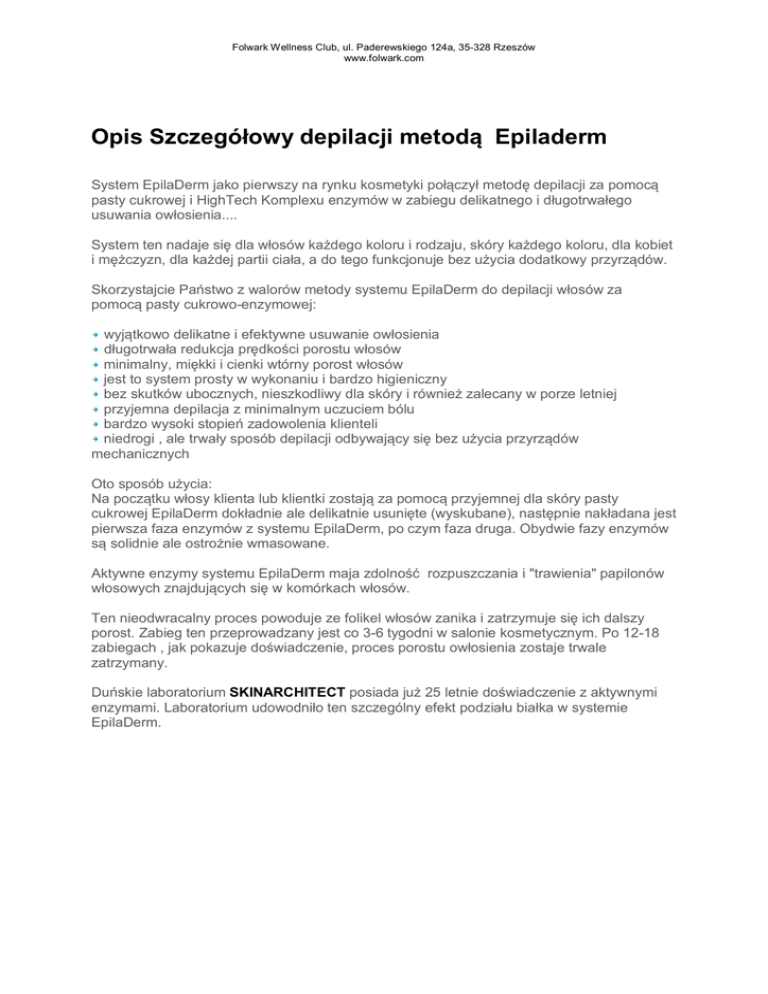 Folwark Wellness Club, ul. Paderewskiego 124a, 35-328 Rzeszów www.folwark.com Opis Szczegółowy depilacji metodą Epiladerm System EpilaDerm jako pierwszy na rynku kosmetyki połączył metodę depilacji za pomocą pasty cukrowej i HighTech Komplexu enzymów w zabiegu delikatnego i długotrwałego usuwania owłosienia.... System ten nadaje się dla włosów każdego koloru i rodzaju, skóry każdego koloru, dla kobiet i mężczyzn, dla każdej partii ciała, a do tego funkcjonuje bez użycia dodatkowy przyrządów. Skorzystajcie Państwo z walorów metody systemu EpilaDerm do depilacji włosów za pomocą pasty cukrowo-enzymowej: wyjątkowo delikatne i efektywne usuwanie owłosienia długotrwała redukcja prędkości porostu włosów minimalny, miękki i cienki wtórny porost włosów jest to system prosty w wykonaniu i bardzo higieniczny bez skutków ubocznych, nieszkodliwy dla skóry i również zalecany w porze letniej przyjemna depilacja z minimalnym uczuciem bólu bardzo wysoki stopień zadowolenia klienteli niedrogi , ale trwały sposób depilacji odbywający się bez użycia przyrządów mechanicznych Oto sposób użycia: Na początku włosy klienta lub klientki zostają za pomocą przyjemnej dla skóry pasty cukrowej EpilaDerm dokładnie ale delikatnie usunięte (wyskubane), następnie nakładana jest pierwsza faza enzymów z systemu EpilaDerm, po czym faza druga. Obydwie fazy enzymów są solidnie ale ostrożnie wmasowane. Aktywne enzymy systemu EpilaDerm maja zdolność rozpuszczania i "trawienia" papilonów włosowych znajdujących się w komórkach włosów. Ten nieodwracalny proces powoduje ze folikel włosów zanika i zatrzymuje się ich dalszy porost. Zabieg ten przeprowadzany jest co 3-6 tygodni w salonie kosmetycznym. Po 12-18 zabiegach , jak pokazuje doświadczenie, proces porostu owłosienia zostaje trwale zatrzymany. Duńskie laboratorium SKINARCHITECT posiada już 25 letnie doświadczenie z aktywnymi enzymami. Laboratorium udowodniło ten szczególny efekt podziału białka w systemie EpilaDerm.