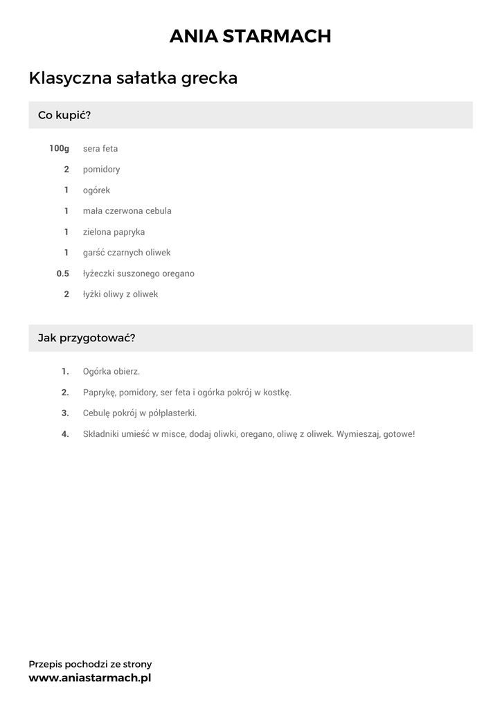 ANIA STARMACH Klasyczna sałatka grecka Co kupić? 100g sera feta 2 pomidory 1 ogórek 1 mała czerwona cebula 1 zielona papryka 1 garść czarnych oliwek 0.5 2 łyżeczki suszonego oregano łyżki oliwy z oliwek Jak przygotować? 1. Ogórka obierz. 2. Paprykę, pomidory, ser feta i ogórka pokrój w kostkę. 3. Cebulę pokrój w półplasterki. 4. Składniki umieść w misce, dodaj oliwki, oregano, oliwę z oliwek. Wymieszaj, gotowe! Przepis pochodzi ze strony www.aniastarmach.pl