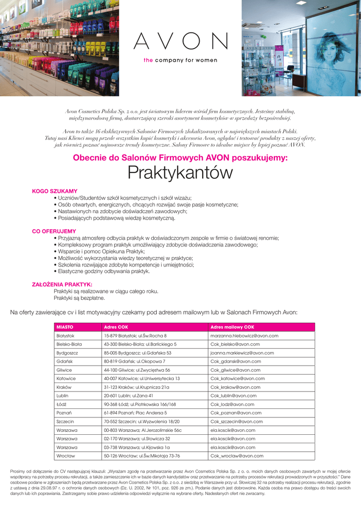 Avon Cosmetics Polska Sp. z o.o. jest światowym liderem wśród firm kosmetycznych. Jesteśmy stabilną, międzynarodową firmą, dostarczającą szeroki asortyment kosmetyków w sprzedaży bezpośredniej. Avon to także 16 ekskluzywnych Salonów Firmowych zlokalizowanych w największych miastach Polski. Tutaj nasi Klienci mogą przede wszystkim kupić kosmetyki i akcesoria Avon, oglądać i testować produkty z naszej oferty, jak również poznać najnowsze trendy kosmetyczne. Salony Firmowe to idealne miejsce by lepiej poznać AVON. Obecnie do Salonów Firmowych AVON poszukujemy: Praktykantów KOGO SZUKAMY • Uczniów/Studentów szkół kosmetycznych i szkół wizażu; • Osób otwartych, energicznych, chcących rozwijać swoje pasje kosmetyczne; • Nastawionych na zdobycie doświadczeń zawodowych; • Posiadających podstawową wiedzę kosmetyczną. CO OFERUJEMY • Przyjazną atmosferę odbycia praktyk w doświadczonym zespole w firmie o światowej renomie; • Kompleksowy program praktyk umożliwiający zdobycie doświadczenia zawodowego; • Wsparcie i pomoc Opiekuna Praktyk; • Możliwość wykorzystania wiedzy teoretycznej w praktyce; • Szkolenia rozwijające zdobyte kompetencje i umiejętności; • Elastyczne godziny odbywania praktyk. Założenia praktyk: Praktyki są realizowane w ciągu całego roku. Praktyki są bezpłatne. Na oferty zawierające cv i list motywacyjny czekamy pod adresem mailowym lub w Salonach Firmowych Avon: miasto Adres COK Adres mailowy COK Białystok 15-879 Białystok; ul.Św.Rocha 8 [email protected] Bielsko-Biała 43-300 Bielsko-Biała; ul.Barlickiego 5 [email protected] Bydgoszcz 85-005 Bydgoszcz; ul.Gdańska 53 [email protected] Gdańsk 80-819 Gdańsk; ul.Okopowa 7 [email protected] Gliwice 44-100 Gliwice; ul.Zwycięstwa 56 [email protected] Katowice 40-007 Katowice; ul.Uniwersytecka 13 [email protected] Kraków 31-123 Kraków; ul.Krupnicza 21a [email protected] Lublin 20-601 Lublin; ul.Zana 41 [email protected] Łódź 90-368 Łódź; ul.Piotrkowska 166/168 [email protected] Poznań 61-894 Poznań; Plac Andersa 5 [email protected] Szczecin 70-552 Szczecin; ul.Wyzwolenia 18/20 [email protected] Warszawa 00-803 Warszawa; Al.Jerozolimskie 56c [email protected] Warszawa 02-170 Warszawa; ul.Słowicza 32 [email protected] Warszawa 03-738 Warszawa; ul.Kijowska 1a [email protected] Wrocław 50-126 Wrocław; ul.Św.Mikołaja 73-76 [email protected] Prosimy od dołączenie do CV następującej klauzuli: „Wyrażam zgodę na przetwarzanie przez Avon Cosmetics Polska Sp. z o. o. moich danych osobowych zawartych w mojej ofercie współpracy na potrzeby procesu rekrutacji, a także zamieszczenie ich w bazie danych kandydatów oraz przetwarzanie na potrzeby procesów rekrutacji prowadzonych w przyszłości.” Dane osobowe podane w zgłoszeniach będą przetwarzane przez Avon Cosmetics Polska Sp. z o.o. z siedzibą w Warszawie przy ul. Słowiczej 32 na potrzeby realizacji procesu rekrutacji, zgodnie z ustawą z dnia 29.08.97 r. o ochronie danych osobowych (Dz. U. 2002, Nr 101, poz. 926 ze zm.). Podanie danych jest dobrowolne. Każda osoba ma prawo dostępu do treści swoich danych lub ich poprawiania. Zastrzegamy sobie prawo udzielenia odpowiedzi wyłącznie na wybrane oferty. Nadesłanych ofert nie zwracamy.