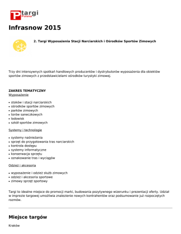 Infrasnow 2015 2. Targi Wyposażenia Stacji Narciarskich i Ośrodków Sportów Zimowych Trzy dni intensywnych spotkań handlowych producentów i dystrybutorów wyposażenia dla obiektów sportów zimowych z przedstawicielami ośrodków turystyki zimowej. ZAKRES TEMATYCZNY Wyposażenie ● ● ● ● ● ● stoków i stacji narciarskich ośrodków sportów zimowych parków zimowych torów saneczkowych lodowisk szkół sportów zimowych Systemy i technologie ● ● ● ● ● ● systemy naśnieżania sprzęt do przygotowania tras narciarskich kontrola dostępu systemy informatyczne konserwacja sprzętu oznakowanie tras i wyciągów Odzież i akcesoria ● ● ● wyposażenie i odzież służb zimowych odzież i akcesoria sportowe zimowy sprzęt sportowy Targi to idealne miejsce do promocji marki, budowania pozytywnego wizerunku i prezentacji oferty. Udział w imprezie targowej umożliwia znalezienie nowych kontrahentów oraz podsumowanie już rozpoczętych rozmów. Miejsce targów Kraków Galicyjska 9 Organizator Targi w Krakowie Kraków Galicyjska 9 12 644 59 32 www.targi.krakow.pl [email protected]