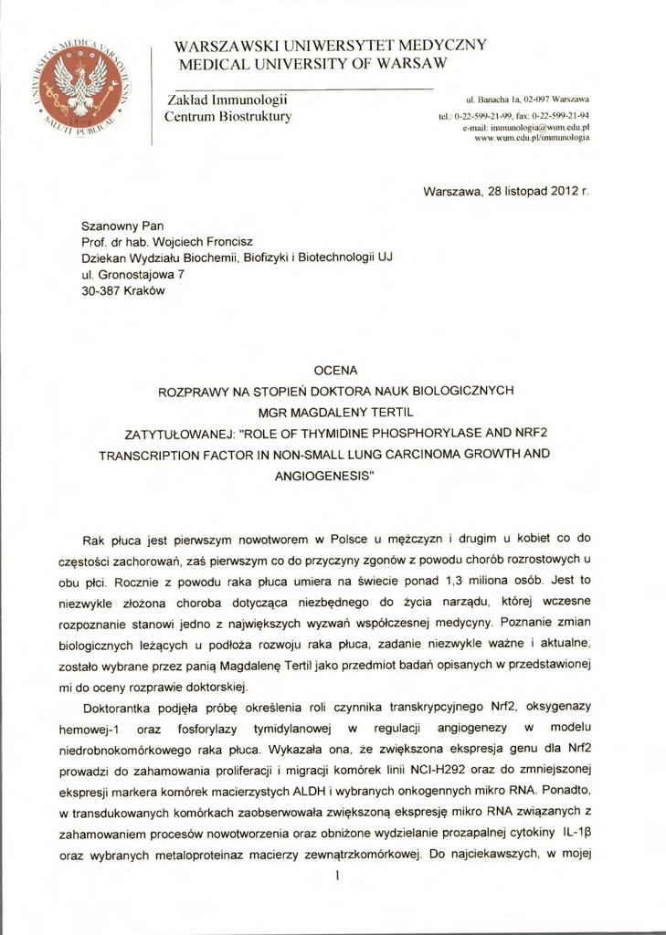 WARSZAWSKI UN1WERSYTET MEDYCZNY MEDICAL UNIVERSITY OF WARSAW Zakład Immunologii Centrum Biostruktury ul. Banacha la, 02-097 Warszawa tel.: 0-22-599-21-99, fax: 0-22-599-21-94 e-mail: immunologiagwum.edu.pl www.wum.edu.pl/immunologia Warszawa, 28 listopad 2012 r. Szanowny Pan Prof. dr hab. Wojciech Froncisz Dziekan Wydział u Biochemii, Biofizyki i Biotechnologii UJ ul. Gronostajowa 7 30-387 Kraków OCENA ROZPRAWY NA STOPIEŃ DOKTORA NAUK BIOLOGICZNYCH MGR MAGDALENY TERTIL ZATYTUŁOWANEJ: "ROLE OF THYMIDINE PHOSPHORYLASE AND NRF2 TRANSCRIPTION FACTOR IN NON-SMALL LUNG CARCINOMA GROWTH AND ANGIOGENESIS" Rak płuca jest pierwszym nowotworem w Polsce u mężczyzn i drugim u kobiet co do częstości zachorowań, zaś pierwszym co do przyczyny zgonów z powodu chorób rozrostowych u obu płci. Rocznie z powodu raka płuca umiera na świecie ponad 1,3 miliona osób. Jest to niezwykle złożona choroba dotycząca niezbędnego do życia narządu, której wczesne rozpoznanie stanowi jedno z największych wyzwań współ czesnej medycyny. Poznanie zmian biologicznych leżących u podłoża rozwoju raka pł uca, zadanie niezwykle ważne i aktualne, zostało wybrane przez panią Magdalenę Tertil jako przedmiot badań opisanych w przedstawionej mi do oceny rozprawie doktorskiej. Doktorantka podjęła próbę określenia roli czynnika transkrypcyjnego Nrf2, oksygenazy hemowej-1 oraz fosforylazy tymidylanowej w regulacji angiogenezy w modelu niedrobnokomórkowego raka płuca. Wykazała ona, że zwiększona ekspresja genu dla Nrf2 prowadzi do zahamowania proliferacji i migracji komórek linii NCI-H292 oraz do zmniejszonej ekspresji markera komórek macierzystych ALDH i wybranych onkogennych mikro RNA. Ponadto, w transdukowanych komórkach zaobserwowała zwiększoną ekspresję mikro RNA związanych z zahamowaniem procesów nowotworzenia oraz obniżone wydzielanie prozapalnej cytokiny IL-1f3 oraz wybranych metaloproteinaz macierzy zewnątrzkomórkowej. Do najciekawszych, w mojej 1 WARSZAWSKI UNIWERSYTET MEDYCZNY MEDICAL UNIVERSITY OF WARSAW Zakład Immunologii Centrum Biostruktury ul. Banacha la, 02-097 Warszawa tel 0-22-599-21-99, fax: 0-22-599-21-94 e-mail: [email protected] ww.‘‘turredu.pl/immunologia ocenie, wyników należy zwiększona ekspresja fosforylazy tymidylanowej w komórkach transdukowanych genem dla czynnika Nrf2. Jest to obserwacja oryginalna, do tej pory nie opisywana przez innych badaczy. Mgr Magdalena Tertil wykazała ponadto, że w regulacji ekspresji fosforylazy tymidyny bierze pośrednio udział oksygenaza hemowa-1 i proces ten jest zależny od statusu oksydacyjnego komórki. Dalsze badania pozwoliły na wyciągnięcie wniosku, że zwiększona ekspresja fosforylazy tymidylanowej hamuje proliferację i migrację badanych komórek, jednocześnie nasila ona wydzielanie czynników proangiogennych i stymuluje proces angiogenezy. Zwiększony potencjał angiogenny komórek transdukowanych genem dla fosforylazy tymidylanowej Doktorantka potwierdziła w mysim modelu in vivo oraz w modelu komórek śródbłonka in vitro poddanych dział aniu cytokin prozapalnych zwiększających ekspresję badanego genu. Zbadanie ekspresji fosforylazy tymidylanowej i związanych z nią cytokin prozapalnych w pierwotnym materiale pobranym od pacjentów z niedrobnokomórkowym rakiem płuca uważam za najbardziej wartoś ciowy element recenzowanej rozprawy. Są to bez wątpienia obserwacje oryginalne, o znaczeniu poznawczym i potencjalnym zastosowaniu klinicznym. We Wstępie doktorantka szczegółowo omówiła epidemiologię, podstawy biologii oraz klasyfikację kliniczną raka płuca, podstawy biologiczne procesu angiogenezy nowotworowej oraz możliwości zastosowania terapii antyangiogennej w leczeniu tego nowotworu, głównie wymierzonej w białka ważne dla przebiegu tego zjawiska, takie, jak fosforylaza tymidyny, oksygenaza hemowa-1 oraz czynnik transkrypcyjny Nrf2. Ponadto, jeden podrozdział poświęciła roli mikro RNA w powstawaniu nowotworów oraz znaczeniu zapalenia i nowotworowych komórek macierzystych w rozwoju nowotworów. Tę część rozprawy oceniam wysoko. Doktorantka wykazała się w niej dużą dojrzałością i wprawą w analizowaniu obszernych danych z literatury światowej. Ponadto, zilustrowała część opisywanych zjawisk bardzo czytelnymi i starannymi rycinami, które ułatwiają lekturę tego rozdziału. W mojej ocenie we Wstępie zabrakło jednak płynnych przejść narracyjnych pomiędzy poszczególnymi podrozdziałami. Uważam również, że Tabela 1, opisująca stadia kliniczne raka pł uca, nie wpisuje się w tematykę zagadnień poruszanych w części badawczej pracy i jest w związku z tym zbędna. Doktorantka nie ustrzegła się również drobnych błędów językowych (dla przykładu, na stronie 22 zamiast zdania: ".. stimuli, which leads to degradation of extracellular matrix..." powinno znaleźć się zdanie: "..stimuli, which lead to..."). Te drobne mankamenty w żaden sposób nie umniejszają wartości rozprawy, która został a napisana niezwykle starannie i przejrzyście. Na podkreślenie zasługuje również bardzo sprawne posługiwanie się językiem angielskim przez Doktorantkę . Cztery cele pracy zostały zwięźle określone i w większości odpowiadają podjętym badaniom. WARSZAWSKI UNIWERSYTET MEDYCZNY MEDICAL UNIVERSITY OF WARSAW Zakład Immunologii Centrum Biostruktury ul. Banacha la, 02-097 Warszawa tel.: 0-22-599-21-99, fax: 0-22-599-21-94 e-mail: [email protected] www.wum.edu.pl/immunologia Opis Materiałów i Metod jest niezwykle wyczerpujący i staranny. Zastosowana przez Doktorantkę metodyka badawcza jest nowoczesna i zgodna z najwyższymi światowymi standardami dla tego typu doświadczeń. Należy podkreślić, że w swojej pracy mgr Magdalena Tertil wykorzystała liczne, niekiedy zaawansowane techniki laboratoryjne, co wskazuje na Jej duże doświadczenie badawcze i biegłość w posługiwaniu się rozmaitymi metodami biologii molekularnej. Mo