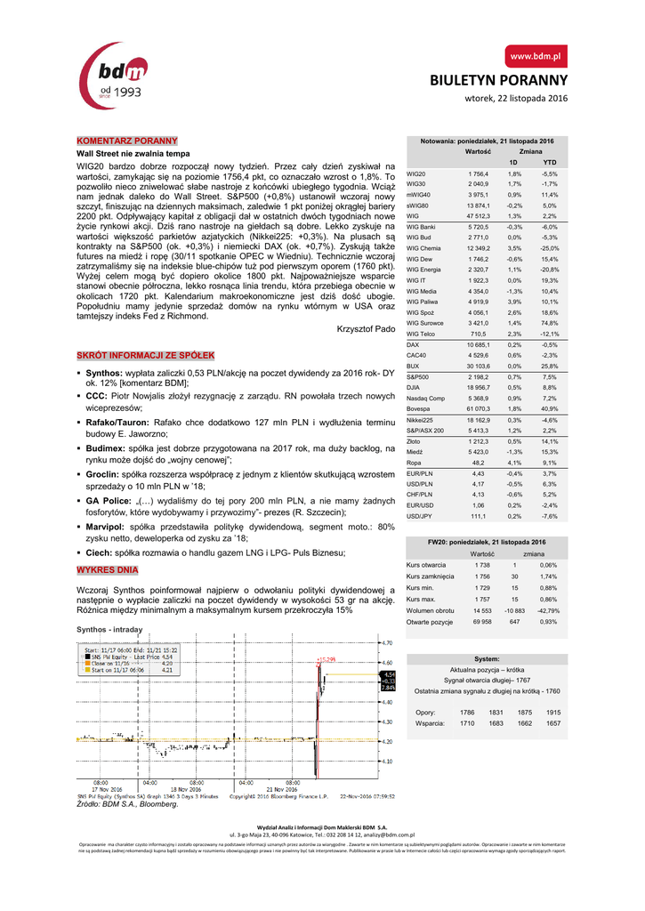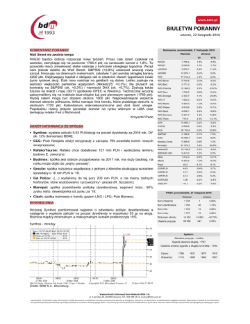 BIULETYN PORANNY wtorek, 22 listopada 2016 KOMENTARZ PORANNY Notowania: poniedziałek, 21 listopada 2016 Wartość Wall Street nie zwalnia tempa WIG20 bardzo dobrze rozpoczął nowy tydzień. Przez cały dzień zyskiwał na wartości, zamykając się na poziomie 1756,4 pkt, co oznaczało wzrost o 1,8%. To pozwoliło nieco zniwelować słabe nastroje z końcówki ubiegłego tygodnia. Wciąż nam jednak daleko do Wall Street. S&P500 (+0,8%) ustanowił wczoraj nowy szczyt, finiszując na dziennych maksimach, zaledwie 1 pkt poniżej okrągłej bariery 2200 pkt. Odpływający kapitał z obligacji dał w ostatnich dwóch tygodniach nowe życie rynkowi akcji. Dziś rano nastroje na giełdach są dobre. Lekko zyskuje na wartości większość parkietów azjatyckich (Nikkei225: +0,3%). Na plusach są kontrakty na S&P500 (ok. +0,3%) i niemiecki DAX (ok. +0,7%). Zyskują także futures na miedź i ropę (30/11 spotkanie OPEC w Wiedniu). Technicznie wczoraj zatrzymaliśmy się na indeksie blue-chipów tuż pod pierwszym oporem (1760 pkt). Wyżej celem mogą być dopiero okolice 1800 pkt. Najpoważniejsze wsparcie stanowi obecnie półroczna, lekko rosnąca linia trendu, która przebiega obecnie w okolicach 1720 pkt. Kalendarium makroekonomiczne jest dziś dość ubogie. Popołudniu mamy jedynie sprzedaż domów na rynku wtórnym w USA oraz tamtejszy indeks Fed z Richmond. Krzysztof Pado SKRÓT INFORMACJI ZE SPÓŁEK Synthos: wypłata zaliczki 0,53 PLN/akcję na poczet dywidendy za 2016 rok- DY ok. 12% [komentarz BDM]; CCC: Piotr Nowjalis złożył rezygnację z zarządu. RN powołała trzech nowych wiceprezesów; Rafako/Tauron: Rafako chce dodatkowo 127 mln PLN i wydłużenia terminu budowy E. Jaworzno; Budimex: spółka jest dobrze przygotowana na 2017 rok, ma duży backlog, na rynku może dojść do „wojny cenowej”; Groclin: spółka rozszerza współpracę z jednym z klientów skutkującą wzrostem sprzedaży o 10 mln PLN w ’18; GA Police: „(…) wydaliśmy do tej pory 200 mln PLN, a nie mamy żadnych fosforytów, które wydobywamy i przywozimy”- prezes (R. Szczecin); 1 756,4 1,8% WIG30 2 040,9 1,7% -1,7% mWIG40 3 975,1 0,9% 11,4% sWIG80 13 874,1 -0,2% 5,0% WIG 47 512,3 1,3% 2,2% WIG Banki 5 720,5 -0,3% -6,0% WIG Bud 2 771,0 0,0% -5,3% WIG Chemia 12 349,2 3,5% -25,0% WIG Dew 1 746,2 -0,6% 15,4% WIG Energia 2 320,7 1,1% -20,8% WIG IT 1 922,3 0,0% 19,3% WIG Media 4 354,0 -1,3% 10,4% WIG Paliwa 4 919,9 3,9% 10,1% WIG Spoż 4 056,1 2,6% 18,6% WIG Surowce 3 421,0 1,4% 74,8% 710,5 2,3% -12,1% DAX 10 685,1 0,2% -0,5% CAC40 4 529,6 0,6% -2,3% BUX 30 103,6 0,0% 25,8% S&P500 2 198,2 0,7% 7,5% DJIA 18 956,7 0,5% 8,8% Nasdaq Comp 5 368,9 0,9% 7,2% Bovespa 61 070,3 1,8% 40,9% Nikkei225 18 162,9 0,3% -4,6% S&P/ASX 200 5 413,3 1,2% 2,2% Złoto 1 212,3 0,5% 14,1% Miedź 5 423,0 -1,3% 15,3% Ropa 48,2 4,1% 9,1% EUR/PLN 4,43 -0,4% 3,7% USD/PLN 4,17 -0,5% 6,3% CHF/PLN 4,13 -0,6% 5,2% EUR/USD 1,06 0,2% -2,4% USD/JPY 111,1 0,2% -7,6% WIG Telco FW20: poniedziałek, 21 listopada 2016 Ciech: spółka rozmawia o handlu gazem LNG i LPG- Puls Biznesu; WYKRES DNIA Wczoraj Synthos poinformował najpierw o odwołaniu polityki dywidendowej a następnie o wypłacie zaliczki na poczet dywidendy w wysokości 53 gr na akcję. Różnica między minimalnym a maksymalnym kursem przekroczyła 15% YTD -5,5% WIG20 Marvipol: spółka przedstawiła politykę dywidendową, segment moto.: 80% zysku netto, deweloperka od zysku za ’18; ; Zmiana 1D Wartość zmiana Kurs otwarcia 1 738 1 0,06% Kurs zamknięcia 1 756 30 1,74% Kurs min. 1 729 15 0,88% Kurs max. 1 757 15 0,86% Wolumen obrotu 14 553 -10 883 -42,79% Otwarte pozycje 69 958 647 0,93% Synthos - intraday System: Aktualna pozycja – krótka Sygnał otwarcia długiej– 1767 Ostatnia zmiana sygnału z długiej na krótką - 1760 Opory: 1786 1831 1875 1915 Wsparcia: 1710 1683 1662 1657 Źródło: BDM S.A., Bloomberg. Wydział Analiz i Informacji Dom Maklerski BDM S.A. ul. 3-go Maja 23, 40-096 Katowice, Tel.: 032 208 14 12, [email protected] Opracowanie ma charakter czysto informacyjny i zostało opracowany na podstawie informacji uznanych przez autorów za wiarygodne . Zawarte w nim komentarze są subiektywnymi poglądami autorów. Opracowanie i zawarte w nim komentarze nie są podstawą żadnej rekomendacji kupna bądź sprzedaży w rozumieniu obowiązującego prawa i nie powinny być tak interpretowane. Publikowanie w prasie lub w Internecie całości lub części opracowania wymaga zgody sporządzających raport. BIULETYN PORANNY wtorek, 22 listopada 2016 GPW – PODSUMOWANIE Indeksy GPW FW20 (1,738.00, 1,757.00, 1,729.00, 1,756.00, +30.0000) 1850 Open Low High Close WIG20 1 731,4 1 731,4 1 757,8 1 756,4 1,8% 680 WIG30 2 019,1 2 014,5 2 041,8 2 040,9 1,7% 766 MWIG40 3 955,0 13 821,5 13 927,0 3 975,1 0,9% 129 SWIG80 13 911,6 3 939,3 3 975,1 13 874,1 -0,2% 34 WIG-PL 47 999,7 47 999,7 48 233,1 48 233,1 1,3% 852 WIG 47 147,4 47 021,0 47 512,3 47 512,3 1,3% 892 1800 WIG20 Alior 1750 1700 1650 16 23 30 6 June 13 20 27 4 July 11 18 25 1 8 August 16 22 29 5 12 19 September 26 3 10 October 17 24 31 7 14 21 November 28 5 December WIG20 (1,731.39, 1,757.81, 1,731.39, 1,756.35, +30.6100) 1850 Cena 42,03 Mkt Cap 1D YTD 5 433 -0,4% -22,5% -10,4% 50,91 4 226 -0,2% BZ WBK 291,60 28 937 -1,2% 2,7% CCC 189,05 7 397 3,6% 36,4% Cyfrowy P. 23,57 15 074 -1,0% 12,9% Enea 9,36 4 132 3,1% -17,2% Energa 7,17 2 969 1,7% -43,3% Eurocash 36,80 5 119 0,0% -24,1% KGHM 82,93 16 586 2,4% 30,6% Lotos 34,26 6 334 3,4% 26,9% LPP 5 600,00 10 300 9,4% 0,8% mBANK 335,00 14 164 0,6% 6,7% Orange 5,32 6 982 3,1% -18,9% Pekao 116,75 30 643 -1,4% -18,6% PGE 9,44 17 651 0,0% -26,2% PGNIG 4,60 27 140 -0,4% -10,5% PKN Orlen 75,35 32 228 5,6% 11,1% PKOBP 25,54 31 925 0,7% -6,5% PZU 28,56 24 662 2,7% -16,0% Tauron 2,53 4 434 2,0% -12,2% Cena Mkt Cap 1650 16 23 30 6 June 13 20 27 4 July 11 18 25 1 8 August 16 22 29 5 12 19 September 26 3 10 October 17 24 31 7 14 21 November 28 5 December zmi ana 1D YTD Alumetal 57,69 887 1,
