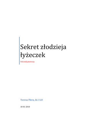 Sekret złodzieja łyżeczek Odcinek pierwszy Teresa Flera, kl. I LO 10-01-2010 I. B yło późne popołudnie. Jesienne słońce powoli chyliło się ku zachodowi. Ulice były prawie puste, nie licząc kilku spóźnionych samochodów. Na skrzyżowaniu dwóch starych, brudnych ulic stała sobie równie stara i brudna, mała, zaniedbana kamieniczka. Od lat była pusta, jednak urząd miasta miał większe problemy na głowie niż interesowanie się nią. Dopóki nikt nie narzekał, mogła sobie tam stać nawet do sądnego dnia. A jednak był z niej pożytek, o którym urzędy nic, rzecz jasna, nie wiedziały. Miała bowiem rolę tajnej kryjówki pewnego złodzieja. Ale o tym później. Dwudziestego piątego października pogoda była nadzwyczaj brzydka. Padał deszcz i wiał zimny, nieprzyjemny wiatr. Wiele osób nie przyszło tego dnia do szkoły, czy to z powodu kataru, czy też niewygód wywołanych warunkami atmosferycznymi. Pan Horacy, nauczyciel matematyki, postanowił tego dnia iść do domu wcześniej, to znaczy zaraz po lekcjach. Zazwyczaj zostawał w szkole do późnego wieczora, sprawdzał i oceniał klasówki, pisał listy do rodziców któregoś z uczniów, przygotowywał się do lekcji lub uzupełniał dziennik. Tego jednak dnia nie miał na to ochoty. Wyszedł z budynku i otworzył czarny parasol. Pan Horacy był typowym nauczycielem matematyki; przynajmniej tak uważali myślący stereotypami uczniowie. Był w średnim wieku, niezbyt wysoki, ale i nie za niski, bardzo chudy. Miał jasnobrązowe włosy, trochę za długie jak na poukładanego matematyka, ale zawsze starannie uczesane. Nosił również duże okrągłe okulary w tanich plastikowych oprawkach. Był kawalerem. Swoje małe dwupokojowe mieszkanie dzielił z małym kundelkiem, Albertem. Kiedy pan Horacy spędzał długie godziny w szkole, sąsiadka z naprzeciwka, staruszka o imieniu Krysia, zajmowała się Albim. Nauczyciel szybko dotarł do domu. Już na klatce schodowej przywitało go radosne szczekanie zwierzątka. Kiedy otwierał drzwi, jego uwagę zwróciła mała koperta wsunięta do połowy pod wycieraczkę. Schylił się i podniósł ją. Była zaadresowana do niego, ale nie było na niej ani adresu nadawcy, ani znaczka pocztowego. Pan Horacy wszedł do domu i położył tajemniczy list na stole. Następnie nalał sobie szklankę wody. Domyślał się, od kogo jest ów list. Jeśli się nie mylił, w kopercie powinno znajdować się zaproszenie na spotkanie; nie miał ochoty nigdzie iść w taką pogodę. Jednak po chwili zastanowienia ciekawość zwyciężyła i otworzył kopertę. W istocie było tam zaproszenie do małej kawiarenki nieopodal. Pan Horacy westchnął. Miał się tam stawić równo o siedemnastej, co dawało mu niecałe pół godziny, by się przygotować. Kawiarenka nosiła zaszczytną nazwę „Królowa”. Była ona jednak niezwykle złudna. Wystrój wnętrza był tani, wręcz nieco tandetny; salonik malutki. Stało w nim sześć malutkich, mieszczących najwyżej dwie osoby stolików – nigdy nie zdarzyło się jeszcze, aby znajdowała się tam naraz liczba gości wystarczająca do zapełnienia całego tuzina drewnianych krzesełek. Sala była widna – białe ściany, względnie czyste okna, trzy różne, niepasujące do siebie lampki stały oddzielnie w trzech kątach. - Witaj – przywitał przyjaciela pan Horacy, dosiadając się bezceremonialnie do jednego ze stolików – co też się znowu stało? - Nie oglądasz wiadomości. – stwierdził jego rozmówca. Był w zbliżonym do Horacego wieku, może nieco starszy. Jego strój był bardziej szykowny, ciemnoszara marynarka i czarne spodnie świadczyły o lekkim poczuciu wyższości i wyuczonej nonszalancji właściciela. Krótkie czarne włosy i bystre ciemne oczy mówiły to samo. Horacy milczał. - Skradziono kolejny komplet barokowych łyżeczek. - Barokowych łyżeczek – powtórzył z lekkim cynizmem pan Horacy. – Chcesz, żebym pomógł ci szukać te łyżeczki? - Wydaje mi się, że chodziło o coś więcej niż łyżeczki. - Z pewnością – sarkastyczny ton nie opuszczał matematyka – potem ukradnie kilka widelców, noży... może nawet filiżanek. To by była dopiero zbrodnia. - Takie właśnie rzeczy znikają już od ponad dziesięciu lat. Małe kuferki na biżuterię, stare monety, lusterka, puzderka... łyżeczki. Ale zdaje się, że złodziej szuka konkretnych rzeczy. Nie obrabia całych sklepów i muzeów, ale zabiera pojedyncze drobiazgi, o które nikt nie będzie robił zbyt dużej afery. Rzeczy bez większej wartości. Co ciekawe, to chyba typ kolekcjonera, żadna ze skradzionych rzeczy nigdzie się nie odnalazła, nie została sprzedana, oddana, przemycona. Wszystko jakby wyparowało. - Posłuchaj mnie – powiedział już spokojnie Horacy – lubiłem twoje teorie spisku, kiedy mieliśmy po piętnaście lat, ale czy nie sądzisz, ze wyrośliśmy z zabawy w detektywówamatorów, poszukiwaczy barokowych łyżeczek? - Ja jestem dziennikarzem, mogę napisać o tym do jakiegoś brukowca, oni lubią teorie spisku, zapłacą mi coś. A jeśli chodzi o ciebie – jesteśmy przecież kumplami. Nie nudzi cię czasem uczenie matematyki w gimnazjum? Horacy nie odpowiedział. Rzeczywiście jego życie stało się ostatnio nieco monotonne. - Dobrze – powiedział w końcu – zgoda. Pomogę ci znaleźć te bezcenne łyżeczki. - Mówię ci, Horacy. To coś większego niż kilka łyżeczek. - Muszę już iść. Spotkajmy się w sobotę, powiesz mi dokładnie, o co chodzi. Po tych słowach wstał i wyszedł na ulicę. Poszedł do domu, ale nie spieszył się. Wybrał dłuższą drogę i przez cały czas myślał o tej sprawie. W sobotę spotkał się z ze swoim znajomym. Na spotkaniu były jeszcze dwie inne osoby. - A co oni tu robią? – zapytał Horacy wskazując na dwoje nastolatków, dziewczynę i chłopca, siedzących obok pana Jacka. - Będą nam pomagać – odparł z uśmiechem Jacek. – Co dwie głowy to nie j