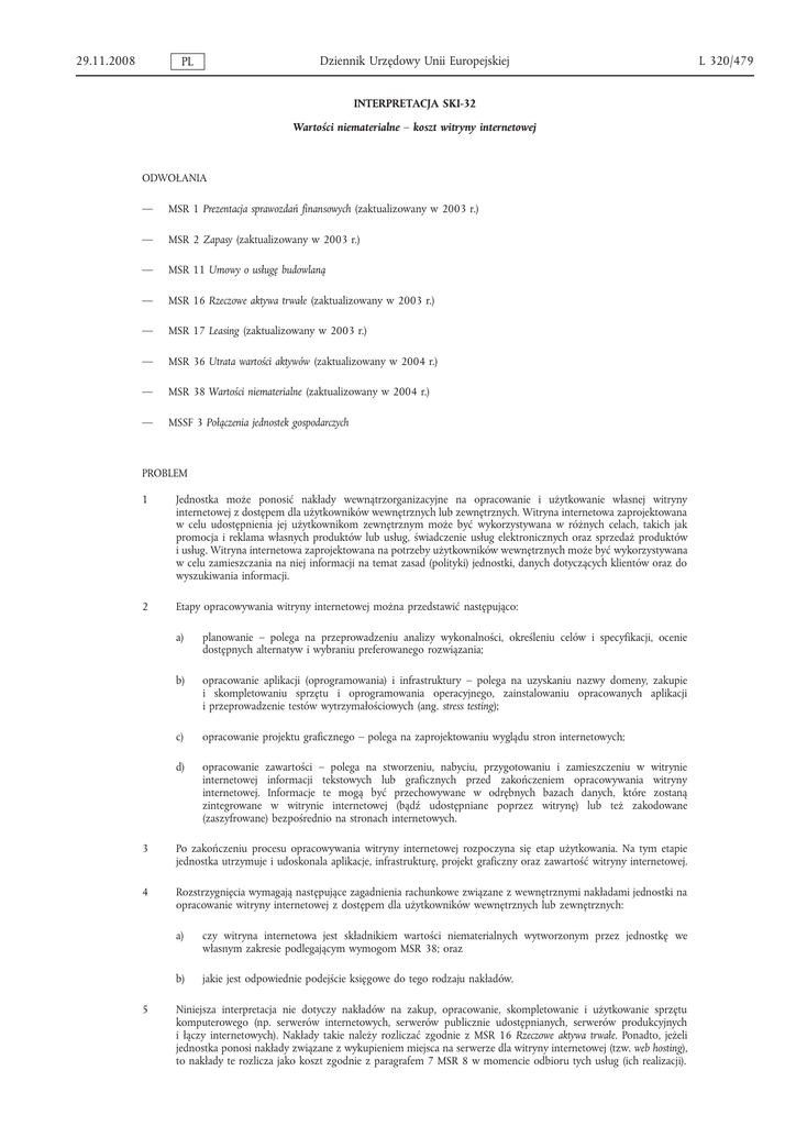 29.11.2008 Dziennik Urzędowy Unii Europejskiej PL INTERPRETACJA SKI-32 Wartości niematerialne – koszt witryny internetowej ODWOŁANIA — MSR 1 Prezentacja sprawozdań finansowych (zaktualizowany w 2003 r.) — MSR 2 Zapasy (zaktualizowany w 2003 r.) — MSR 11 Umowy o usługę budowlaną — MSR 16 Rzeczowe aktywa trwałe (zaktualizowany w 2003 r.) — MSR 17 Leasing (zaktualizowany w 2003 r.) — MSR 36 Utrata wartości aktywów (zaktualizowany w 2004 r.) — MSR 38 Wartości niematerialne (zaktualizowany w 2004 r.) — MSSF 3 Połączenia jednostek gospodarczych PROBLEM 1 Jednostka może ponosić nakłady wewnątrzorganizacyjne na opracowanie i użytkowanie własnej witryny internetowej z dostępem dla użytkowników wewnętrznych lub zewnętrznych. Witryna internetowa zaprojektowana w celu udostępnienia jej użytkownikom zewnętrznym może być wykorzystywana w różnych celach, takich jak promocja i reklama własnych produktów lub usług, świadczenie usług elektronicznych oraz sprzedaż produktów i usług. Witryna internetowa zaprojektowana na potrzeby użytkowników wewnętrznych może być wykorzystywana w celu zamieszczania na niej informacji na temat zasad (polityki) jednostki, danych dotyczących klientów oraz do wyszukiwania informacji. 2 Etapy opracowywania witryny internetowej można przedstawić następująco: a) planowanie – polega na przeprowadzeniu analizy wykonalności, określeniu celów i specyfikacji, ocenie dostępnych alternatyw i wybraniu preferowanego rozwiązania; b) opracowanie aplikacji (oprogramowania) i infrastruktury – polega na uzyskaniu nazwy domeny, zakupie i skompletowaniu sprzętu i oprogramowania operacyjnego, zainstalowaniu opracowanych aplikacji i przeprowadzenie testów wytrzymałościowych (ang. stress testing); c) opracowanie projektu graficznego – polega na zaprojektowaniu wyglądu stron internetowych; d) opracowanie zawartości – polega na stworzeniu, nabyciu, przygotowaniu i zamieszczeniu w witrynie internetowej informacji tekstowych lub graficznych przed zakończeniem opracowywania witryny internetowej. Informacje te mogą być przechowywane w odrębnych bazach danych, które zostaną zintegrowane w witrynie internetowej (bądź udostępniane poprzez witrynę) lub też zakodowane (zaszyfrowane) bezpośrednio na stronach internetowych. 3 Po zakończeniu procesu opracowywania witryny internetowej rozpoczyna się etap użytkowania. Na tym etapie jednostka utrzymuje i udoskonala aplikacje, infrastrukturę, projekt graficzny oraz zawartość witryny internetowej. 4 Rozstrzygnięcia wymagają następujące zagadnienia rachunkowe związane z wewnętrznymi nakładami jednostki na opracowanie witryny internetowej z dostępem dla użytkowników wewnętrznych lub zewnętrznych: 5 a) czy witryna internetowa jest składnikiem wartości niematerialnych wytworzonym przez jednostkę we własnym zakresie podlegającym wymogom MSR 38; oraz b) jakie jest odpowiednie podejście księgowe do tego rodzaju nakładów. Niniejsza interpretacja nie dotyczy nakładów na zakup, opracowanie, skompletowanie i użytkowanie sprzętu komputerowego (np. serwerów internetowych, serwerów publicznie udostępnianych, serwerów produkcyjnych i łączy internetowych). Nakłady takie należy rozliczać zgodnie z MSR 16 Rzeczowe aktywa trwałe. Ponadto, jeżeli jednostka ponosi nakłady związane z wykupieniem miejsca na serwerze dla witryny internetowej (tzw. web hosting), to nakłady te rozlicza jako koszt zgodnie z paragrafem 7 MSR 8 w momencie odbioru tych usług (ich realizacji). L 320/479 L 320/480 Dziennik Urzędowy Unii Europejskiej PL 6 MSR 38 nie ma zastosowania do wartości niematerialnych utrzymywanych przez jednostkę z zamiarem ich sprzedaży w ramach prowadzenia działalności gospodarczej (zob. MSR 2 Zapasy oraz MSR 11 Umowy o usługę budowlaną) oraz do leasingu objętego zakresem MSR 17 Leasing. W konsekwencji niniejszej interpretacji nie stosuje się w odniesieniu do nakładów na opracowanie lub użytkowanie witryny internetowej (lub oprogramowania do przeznaczonego dla witryn internetowych), jeżeli witryna internetowa ma zostać sprzedana innej jednostce. Jeżeli witryna internetowa jest leasingowana w ramach leasingu operacyjnego, postanowienia niniejszej interpretacji powinien stosować leasingodawca. Jeżeli witryna internetowa jest leasingowana w ramach leasingu finansowego, leasingobiorca powinien zastosować niniejszą interpretację po początkowym ujęciu leasingowanego składnika aktywów. UZGODNIONE STANOWISKO 7 Opracowana własna witryna internetowa jednostki z dostępem dla użytkowników wewnętrznych lub zewnętrznych stanowi składnik wartości niematerialnych wytworzony przez jednostkę we własnym zakresie, który podlega wymogom MSR 38. 8 Opracowana witryna internetowa ujmowana jest jako składnik aktywów niematerialnych wtedy i tylko wtedy, gdy poza spełnieniem ogólnych wymogów zawartych w paragrafie 21 MSR 38, które dotyczą ujmowania i początkowej wyceny odnośnych aktywów, jednostka spełnia wymogi paragrafu 57 MSR 38. Spełnienie wymogu wykazania, w jaki sposób witryna internetowa wygeneruje prawdopodobne przyszłe korzyści ekonomiczne, zgodnie z paragrafem 57 d) MSR 38, powinno być wykonalne przede wszystkim wówczas, gdy witryna internetowa ma zdolność generowania przychodów, na przykład bezpośrednich przychodów wynikających z możliwości złożenia zamówień na witrynie internetowej. Jeżeli natomiast witryna internetowa została opracowana wyłącznie lub głównie dla celów promocji bądź reklamy produktów lub usług własnych, to jednostka nie będzie w stanie udowodnić, że witryna internetowa spowoduje powstanie prawdopodobnych przyszłych korzyści ekonomicznych, a zatem wszystkie nakłady poniesione na opracowanie takiej witryny ujmuje się w kosztach w momencie poniesienia. 9 Wszelkie wewnętrzne nakłady poniesione na opracowanie i użytkowanie witryny internetowej jednostki rozlicza