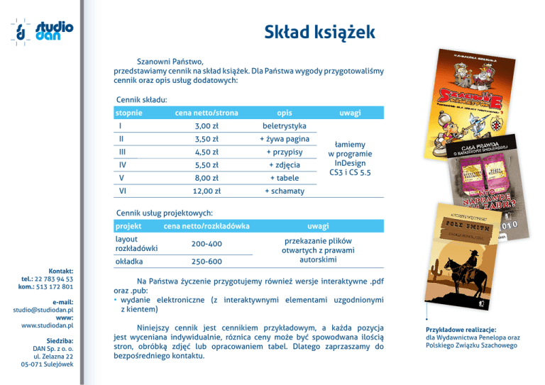 Skład książek Szanowni Państwo, przedstawiamy cennik na skład książek. Dla Państwa wygody przygotowaliśmy cennik oraz opis usług dodatowych: Cennik składu: stopnie cena netto/strona opis uwagi I 3,00 zł beletrystyka II 3,50 zł + żywa pagina III 4,50 zł + przypisy IV 5,50 zł + zdjęcia V 8,00 zł + tabele VI 12,00 zł + schamaty łamiemy w programie InDesign CS3 i CS 5.5 Cennik usług projektowych: projekt Kontakt: tel.: 22 783 94 53 kom.: 513 172 801 e-mail: [email protected] www: www.studiodan.pl Siedziba: DAN Sp. z o. o. ul. Zelazna 22 05-071 Sulejówek cena netto/rozkładówka uwagi layout rozkładówki 200-400 okładka 250-600 przekazanie plików otwartych z prawami autorskimi Na Państwa życzenie przygotujemy również wersje interaktywne .pdf oraz .pub: • wydanie elektroniczne (z interaktywnymi elementami uzgodnionymi z kientem) Niniejszy cennik jest cennikiem przykładowym, a każda pozycja jest wyceniana indywidualnie, róznica ceny może być spowodwana ilością stron, obróbką zdjęć lub opracowaniem tabel. Dlatego zaprzaszamy do bezpośredniego kontaktu. Przykładowe realizacje: dla Wydawnictwa Penelopa oraz Polskiego Związku Szachowego