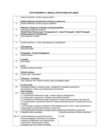 OPIS PRZEDMIOTU / MODUŁU KSZTAŁCENIA (SYLABUS) 1. Nazwa przedmiotu / modułu w języku polskim 2. Metody diagnozy specyficznych trudności w uczeniu się Nazwa przedmiotu / modułu w języku angielskim 4. Methods of Diagnosis of Specific Learning Disabilities Jednostka prowadząca przedmiot Wydział Nauk Historycznych i Pedagogicznych, Instytut Pedagogiki, Zakład Pedagogiki Wczesnoszkolnej i Przedszkolnej Kod przedmiotu / modułu 5. Rodzaj przedmiotu / modułu (obowiązkowy lub fakultatywny) 6. Obowiązkowy Kierunek studiów 7. Pedagogika – Terapia pedagogiczna Poziom studiów 8. II stopień Rok studiów 3. II rok 9. Semestr (zimowy lub letni) 10. Semestr zimowy Forma zajęć i liczba godzin 11. Ćwiczenia – 15 ćwiczeń Imię, nazwisko, tytuł / stopień naukowy osoby prowadzącej zajęcia 12. 13. 14. EK_01 Dr Anna Jurek Wymagania wstępne w zakresie wiedzy, umiejętności i kompetencji społecznych dla przedmiotu / modułu oraz zrealizowanych przedmiotów Brak wymagań Cele przedmiotu: C-1 Przybliżenie podstawowych pojęć z zakresu diagnozy pedagogicznej. C-2 Zapoznanie z przyczynami i skutkami niepowodzeń szkolnych. C-3 Przybliżenie podstawowych pojęć dotyczących rozwoju psychoruchowego i jego zaburzeń. C-4 Zaznajomienie z symptomami zaburzeń rozwoju funkcji poznawczych i motorycznych oraz ich integracji. C-5 Prezentacja i omówienie wybranych testów diagnostycznych i innych metod stosowanych w rozpoznawaniu specyficznych trudności w uczeniu się. C-6 Przygotowanie studentów do diagnozowania specyficznych trudności w uczeniu się. Zakładane efekty kształcenia: Symbole kierunkowych efektów kształcenia: potrafi posługiwać się wiedzą teoretyczną z zakresu pedagogiki, psychologii oraz dydaktyki i metodyki szczegółowej w celu diagnozowania, analizowania i prognozowania sytuacji pedagogicznych oraz dobierania strategii K_U03 realizowania działań praktycznych na poszczególnych etapach edukacyjnych EK_02 potrafi samodzielnie zdobywać wiedzę i rozwijać swoje profesjonalne umiejętności związane z działalnością pedagogiczną (dydaktyczną, wychowawczą i opiekuńczą), korzystając z różnych źródeł i nowoczesnych technologii, K_U04 EK_03 posiada umiejętności diagnostyczne pozwalające na rozpoznawanie sytuacji uczniów ze specjalnymi potrzebami edukacyjnymi, opracowywanie wyników obserwacji i formułowanie wniosków. K_U05 EK_04 potrafi ocenić przydatność typowych metod, procedur i dobrych praktyk do realizacji zadań dydaktycznych, wychowawczych i opiekuńczych związanych z odpowiednimi etapami edukacyjnymi K_U07 potrafi pracować z uczniami, indywidualizować zadania i dostosowywać metody i treści do potrzeb i możliwości uczniów (w tym uczniów ze specjalnymi potrzebami edukacyjnymi) oraz zmian zachodzących w świecie i w nauce, K_U14 ma przekonanie o wadze zachowania się w sposób profesjonalny, refleksji na tematy etyczne i przestrzegania zasad etyki zawodowej, wykazuje cechy refleksyjnego praktyka K_K04 EK_05 EK_06 15. 16. Treści programowe: Analiza przyczyn niepowodzeń szkolnych. Wpływ zaburzeń rozwoju poznawczego i ruchowego na funkcjonowanie ucznia i przebieg procesu kształcenia. Wieloaspektowość postępowania diagnostycznego. Dysleksja, dysgrafia, dysortografia, SLI, dyspraksja i inne zaburzenia rozwoju ruchowego, ADHD i zahamowania psychoruchowe – charakterystyka zaburzeń, postępowanie diagnostyczne. Różnice indywidualne a zaburzenia rozwoju. Współwystępowanie zaburzeń rozwojowych. Zalecana literatura (podręczniki) Literatura podstawowa: Bogdanowicz M., Leworęczność u dzieci, Warszawa 1992. Bogdanowicz M., Ryzyko dysleksji, dysortografii i dysgrafii. Skala Ryzyka Dysleksji wraz z normami dla klas I i II, Gdańsk 2012. Cooper P., Ideus K., Zrozumieć dziecko z nadpobudliwością psychoruchową, Warszawa 2001. Krasowicz-Kupis G. (red.), Diagnoza dysleksji. Najważniejsze problemy, Gdańsk 2009. Lipowska M., Dysleksja i ADHD. Współwystępujące zaburzenia rozwoju, Warszawa 2011. Petersen W., Dzieci ze specyficznymi trudnościami w uczeniu się, w: Metody pedagogiki specjalnej, Norris G. Haring, Richard L. Schiefelbusch (red.), Warszawa 1977. Reid G., Wearmouth J. (red.), Dysleksja. Teoria i praktyka, Gdańsk 2008. Smith D.D., Pedagogika specjalna. T. I i II, Warszawa 2008. Wilgocka-Okoń B., Gotowość szkolna dzieci sześcioletnich, Warszawa 2003. Wood E.R., Specjalne trudności w uczeniu się poszczególnych przedmiotów, w: Ch.E. Skinner (red.), Psychologia wychowawcza, Warszawa 1971. Wood R., Jak dzieci uczą się i myślą, Kraków 2004. Literatura uzupełniająca: Bogdanowicz M., Adryjanek A., Uczeń z dysleksją w szkole, Gdynia 2004. Borkowska A.R., Domańska Ł. (red.), Neuropsychologia kliniczna dziecka, Warszawa 2006. Domagała A., Mirecka U., Grafomotoryka u dzieci w wieku 7-13 lat, Lublin 2010. Górniewicz E., Pedagogiczna diagnoza specyficznych trudności w czytaniu i pisaniu, Toruń 2002. Gruszczyk-Kolczyńska E., Dzieci ze specyficznymi trudnościami w uczeniu się matematyki, Warszawa 2005. Gruszczyk-Kolczyńska E., Zielińska E., Nauczycielska diagnoza gotowości do podjęcia nauki szkolnej. Jak prowadzić obserwację dzieci, interpretować wyniki i formułować wnioski, Kraków 2011. Kutscher M. Atwood L., Wolff T., Dzieci z zaburzeniami łączonymi, Warszawa 2007. Oszwa U., Dziecko z zaburzeniami rozwoju i zachowania w klasie szkolnej, Kraków 2007. Oszwa U., Wczesna diagnoza dziecięcych trudności w liczeniu, Kraków 2008. Sawa B., Jeżeli dziecko źle czyta i pisze, Warszawa 1997. Szeląg E., Szymaszek A., Test do badania słuchu fonematycznego u dzieci i dorosłych, Gdańsk 2006. Thompson J., Specjalne potrzeby edukacyjne, Warszawa 2013. 17. Forma zaliczenia poszczególnych komponentów przedmiotu / modułu, sposób sprawdzenia osiągnięcia zamierzonych efektów kształcenia: Ćwiczenia: projekt, kolokwium na ocenę Projekt: Ocena umiejętności studentów w zakresie przeprowadzen