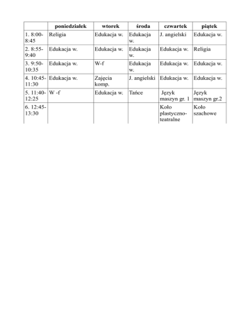 poniedziałek środa czwartek 1. 8:00- Religia 8:45 Edukacja w. Edukacja w. J. angielski 2. 8:55- Edukacja w. 9:40 Edukacja w. Edukacja w. Edukacja w. Religia 3. 9:50- Edukacja w. 10:35 W-f Edukacja w. Edukacja w. Edukacja w. 4. 10:45- Edukacja w. 11:30 Zajęcia komp. J. angielski Edukacja w. Edukacja w. 5. 11:40- W -f 12:25 Edukacja w. Tańce 6. 12:4513:30 wtorek piątek Edukacja w. Język Język maszyn gr. 1 maszyn gr.2 Koło plastycznoteatralne Koło szachowe