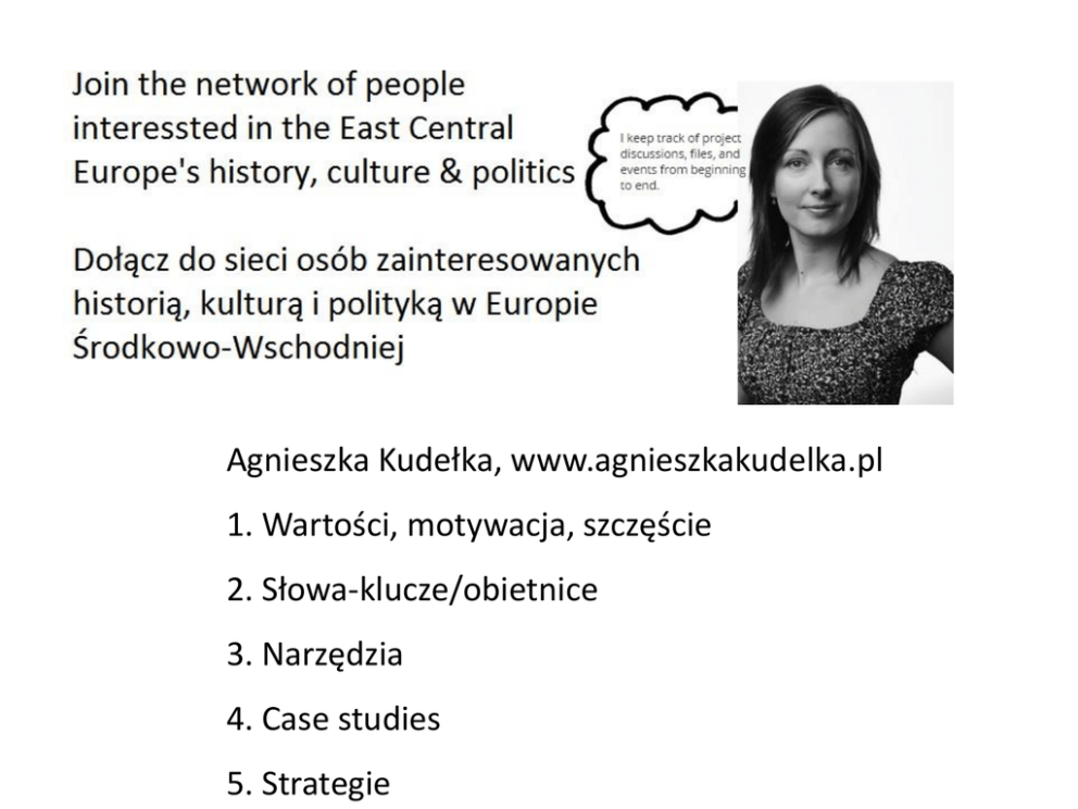 Agnieszka Kudełka, www.agnieszkakudelka.pl 1. Wartości, motywacja, szczęście 2. Słowa-klucze/obietnice 3. Narzędzia 4. Case studies 5. Strategie „Posiadanie marzeń odróżnia człowieka wolnego*, żyjącego pełnią życia, od niewolnika dnia codziennego. Posiadanie wielkiego marzenia odróżnia wielkiego człowieka od przeciętnego” Joanna Malinowska-Parzydło („Jesteś marką”) *wolność wewnętrzna „Od marzeń i wizji blisko jest do misji.” Po co żyjesz? Działasz? (misja) W co najmocniej wierzysz? (wartości osobiste) 1. Jakie wydarzenia, gesty, momenty mają dla Ciebie wartość? Kiedy uwidoczniła się w nich Twoja wartość? (sukcesy) 2. Co najwyżej oceniasz (rzeczy, osoby, zdarzenia) w swoim życiu? Bez czego nie wyobrażasz sobie życia? Za co jesteś wdzięczna? („dary”) 3. Jakie cechy osobowe lubisz w sobie/innych? (cechy immanentne) Joanna Malinowska-Parzydło („Jesteś marką”) Przykłady wartości: - Budowanie/Pogłębianie relacji - Wytrwałość, gotowość do poświęceń - Wiara w ludzi, empatia - Pozytywne nastawienie - Energia i ciekawość - Osiąganie sukcesów/wyników - Dzielenie się wiedzą i umiejętnościami - Zmiana nastawień - Szacunek (pamięć) - ... Wartość a marka, wartość marki: 1. „Wartość marki mierzymy jej unikatowością, a nie zdolnością do kreowania i odgrywania ról na potrzeby chwili.” 2. Marka zbudowana jest w głowach i sercach ludzi, więc nie istnieje poza światem naszych relacji z ludźmi”. Weryfikacja „tego jak jesteśmy odbierani”, aby „korygować” „wspierająco” naszą strategię i pozycjonowanie naszej marki. 3. „[P]owinieneś zrozumieć, w czym tkwi źródło Twojej autentyczności, a to z kolei wymaga uświadomienia sobie, kiedy i z jakiego powodu chowasz się za ‘maskami’, w ‘rolach’ wykreowanych na potrzeby specyficznych sytuacji”. Joanna Malinowska-Parzydło („Jesteś marką”) Jak połączyć misję, wizję i działania? Trzeba „myśleć pozytywnie”, ale też „ujarzmić te pozytywne wyobrażenia, myślenie, żeby było skutecznie”. POZYTYWNE MYŚLENIE „może być skuteczne, ale tylko wtedy, kiedy wyobrażamy sobie proces dochodzenia do celu. Często jest tak, że kiedy marzymy o czymś, stawiamy sobie cel i on jest taki bardzo emocjonalny, bardzo tego chcemy, my tego pożądamy, to, to pożądanie tego wyniku odbiera nam energię życiową na to, żeby do tego dążyć. My się często spalamy.” UWAGA: „kiedy my troszeczkę przestaniemy myśleć o tym wyniku, kiedy on stanie się takim troszeczkę produktem ubocznym naszego działania, procesu działania, wtedy go osiągniemy.” dr Ewa Jarczewska-Gerc (www.andrzejtucholski.pl) Motywacja: „to są wszelkie procesy odpowiedzialne za uruchomienie, ukierunkowanie, podtrzymanie i zakończenie działania.” Prof. Wiesław Łukaszewski, psycholog motywacji Szczęście: „Jesteśmy odpowiedzialni za to, żeby [szczęście] budować w codzienności.” „Bardzo trudno jest [...] wziąć sprawy w swoje ręce i aktywnie włączać szczęście.” „[D]oświadczamy szczęścia, kiedy coś robimy, kiedy doświadczamy flow, czyli przepływu. To jest takie poczucie zaangażowania z pełną kontrolą, ale też utratą poczucia czasu, że [...] nie czujemy, a czas mija.” dr Ewa Jarczewska-Gerc (www.andrzejtucholski.pl) O czym pamiętać planując działania: 1. Być sobą 2. Dać się poznać (relacje osobiste, z grupami społecznymi, zawodowymi i branżami) 3. Skutecznie się komunikować (media społecznościowe, branżowe, horyzontalne) 4. Żyć wartościowym życiem (intelekt, duchowość, emocje, ciało, relacje) Joanna Malinowska-Parzydło („Jesteś marką”) Jak Twoje wartości odnoszą się do potrzeb Twoich odbiorców? 1. Potrzeby fizjologiczne/biologiczne – zapewnienie jedzenia, odpoczynku etc. 2. Potrzeby bezpieczeństwa – zapewnienie bliskości, ochrony przed niebezpieczeństwami, opieki, sprawiedliwości, porządku 3. Potrzeby przynależności – znalezienie przyjaciół, akceptacji, osób o podobnych wartościach 4. Potrzeby szacunku i uznania – odniesienie sukcesu na danym polu, wzrost pewności siebie, poczucia własnej wartości 5. Potrzeby poznawcze – wzrost wiedzy na własny temat lub na temat otaczającego świata 6. Potrzeby estetyczne – poprawa samopoczucia, estetyki 7. Potrzeby samorealizacji – umacnianie poczucia własnej wartości, wyrażanie siebie, realizowanie własnych celów Słowa-klucze, odnoszące się do wartości marki / „Obietnice” marki: („Z jakimi trzema wartościami chcesz być kojarzony?”) Nike: Authentic. Athletic. Performance Nokia: Connecting People Disney: Fun Family Entertainment Apple: Think Different (Steve Jobs: Simplicity) McDonald’s: Jedzenie, znajomi, zabawa Orlen: Najbliżej (reklamy opowiadają o różnych ludziach, którzy podróżują po to, by spotkać się z bliskimi oraz rozwijać swoje zainteresowania, eksponowanie silnych relacji międzyludzkich) Muzeum Historii Żydów Polskich: 1000 powodów („Są 1000 powodów, by odwiedzić Muzeum POLIN oraz podzielić się swoją historią. A jaki jest Twój powód?”) Cel: „inspiracja i motywacja do rozwoju oraz dobrych zmian przez komunikowanie ważnych wartości jak najszerszej grupie odbiorców” Sieć/marka i wartości płynące z identyfikacji z nią: • wpływ • unikalność • autentyczność Przykłady sieci/marek i ich narzędzi: 1. Sieciówka – Permakultura – Sieć sensownego biznesu 2. Archiwa społeczne 3. MitOst - Wymiana kulturowa i językowa 4. TEA - Edukacja antydyskryminacyjna Narzędzia: 1. Publikacja (treści): blogi, issuu, piktochart, gingkoapp 2. Współdzielenie: youtube, flickr, slideshare, pinterest, instagram 3. Współtworzenie, współpraca: Google docs, UpWork, Calendly 4. Budowanie i podtrzymywanie relacji: narzędzia do wysyłki newsletterów (mailchimp, freshmail), social networks 5. Bieżące informowanie i odnoszenie się do aktualno