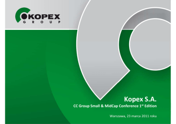 Kopex S.A. CC Group Small & MidCap Conference 1st Edition Warszawa, 23 marca 2011 roku zastrzeżenie Niniejsze opracowanie zostało sporządzone wyłącznie w celach informacyjnych i nie ma na celu nakłaniania do nabycia lub zbycia jakichkolwiek instrumentów finansowych. Opracowanie nie stanowi reklamy, oferty ani proponowania nabycia instrumentów finansowych. Zostały w nim wykorzystane źródła informacji, które Kopex S.A. uznaje za wiarygodne i dokładne, jednak nie ma gwarancji, że są one wyczerpujące i w pełni odzwierciedlają stan faktyczny. Opracowanie może zawierać stwierdzenia dotyczące przyszłości, które stanowią ryzyko inwestycyjne lub źródło niepewności i mogą istotnie różnić się od faktycznych rezultatów. Kopex S.A. nie ponosi odpowiedzialności za efekty decyzji, które zostały podjęte na podstawie niniejszego opracowania. Opracowania nie należy traktować jako źródła wiedzy wystarczającej do podjęcia decyzji inwestycyjnej. Odpowiedzialność za sposób wykorzystania informacji zawartych w opracowaniu spoczywa wyłącznie na korzystającym z opracowania. Opracowanie podlega ochronie wynikającej z ustawy o prawie autorskim i prawach pokrewnych. Powielanie, publikowanie lub jego rozpowszechnianie wymaga pisemnej zgody Kopex S.A. 2 www.kopex.com.pl dane rynkowe spółka Kopex S.A. liczba akcji 74.332.538 kapitalizacja 1.561,0 mln zł /21 marca 2011 r./ free float 34,49% indeks, sektor WIG / mWIG40, elektromaszynowy rynek notowań podstawowy ticker KPX Prezes Zarządu – Marian Kostempski Zarząd Spółki Wiceprezes Zarządu – Joanna Parzych Wiceprezes Zarządu – Józef Wolski strona www www.kopex.com.pl kontakt IR 3 www.kopex.com.pl podsumowanie działalności 4Q 2010 • podsumowanie finansowe – zakończona restrukturyzacja w segmencie odlewów /HSW, LIV/ oraz dwóch pozostałych spółek serbskich – dodatnie wyniki EBIT i netto w 4Q 2010 – wzrost rentowności operacyjnej w segmencie usług górniczych • 11,8% 4Q 2010 vs -9% 4Q 2009 • 13,2% 1-4Q 2010 vs 0,4% 2009, przewidywany dalszy upside – wzrost backlog-u w core-business o 6% r-d-r w warunkach porównywalnych /24% w stosunku do 08.2010/, w tym o 97% w segmencie urządzeń elektrycznych i elektronicznych • podsumowanie operacyjne – zapoczątkowanie prac nad nową strategią rynkową i produktową na lata 2011+ – porządkowanie i stopniowe upraszczanie struktury grupy – szczegółowy przegląd procesów oraz audyt zarządzania i finansowy w spółkach regularnie odnotowujących niezadowalające wyniki finansowe – rekordowe wyniki wydobywcze ściany Carborough Downs wykorzystującej obudowę Tagoru, osiągającej tzw. poziom dostępności operacyjnej 99% 4 www.kopex.com.pl podsumowanie operacyjne www.kopex.com.pl ożywienie na rynku węgla rosnące zużycie węgla /szacowany wzrost zużycia +58% do 2035/ i wzrost znaczenia węgla w strukturze źródeł energii wzrost udziału Chin w globalnym zużyciu węgla /do 54% w 2035/ 200 160 120 80 40 w ciągu kolejnych 20 lat największy wzrost wydobycia w państwach Azji i Afryki 0 2010 Chiny produkcja węgla w wybranych regionach świata (kwd BTU) 60 2010 2035 E 50 P 2020 P 2025 Pozostałe państwa Azji poza OECD 140 100 120 USD / t 60 30 80 Pozostałe państwa DES ARA Index 40 RB Index 60 20 10 P 2035 100 40 20 P 2030 indeksy cen węgla 120 80 Indie P 2015 NEWC Index 0 USA Australia i Nowa Zelandia Rosja Indie Afryka Chiny gru10 sty11 lut11 40 lis-10 0 sie10 wrz10 paź10 • +58% 240 lip-10 • światowa konsumpcja węgla (kwd BTU) sty10 lut10 mar10 kwi10 maj10 cze10 • Źródła: International Energy Outlook, global COAL 6 www.kopex.com.pl tendencje na światowych rynkach • wzrost konsumpcji węgla i zapotrzebowania na maszyny górnicze determinuje tendencje konsolidacyjne - Caterpillar Inc. liderem procesów konsolidacyjnych /przejęcie Bucyrus Int.: wartość transakcji 7,6 mld USD/ • rosnący popyt na maszyny górnicze na rynkach emerging markets /Chiny, Indie/ oraz na tradycyjnych rynkach eksporterów węgla /Australia, Indonezja, RPA/ • znaczące inwestycje w sektorze górnictwa w Chinach, USA, Rosji • poprawa backlogów globalnych producentów: Joy Global r/r +24%, Bucyrus Int r/r +35% 150% Stowe Coal Index S&P 500 140% 130% 120% 110% 100% 90% 80% sty-10 lut-10 mar-10 kwi-10 maj-10 cze-10 lip-10 sie-10 wrz-10 paź-10 lis-10 gru-10 sty-11 Stowe Coal Index – indeks grupujący spółki z sektora górnictwa węgla i maszyn górniczych, w tym m.in. Bucyrus Int., Joy Global 7 www.kopex.com.pl inwestycje w polskim górnictwie 8 • poprawa sytuacji w polskim górnictwie /wzrost wyników finansowych i rentowności/ stymuluje wzrost nakładów inwestycyjnych • szansa na poprawę efektywności górnictwa - prywatyzacja największych spółek /JSW w 2011/ • zgodnie z planami inwestycyjnymi w ramach realizacji Strategii działalności górnictwa węgla kamiennego nakłady 3 największych spółek węglowych w latach 2010-2015 wyniosą łącznie 15,2 mld zł: 5,7 mld zł JSW; 5 mld KW; 4,5 mld zł KHW • w 2011 r. JSW planuje przeznaczyć na inwestycje blisko 1 mld mln zł – wzrost r/r o 88% , z czego 466 mln zł na budownictwo inwestycyjne /+39%/ i 526 mln zł na zakup gotowych dóbr inwestycyjnych /+175%/ • w JSW priorytetem jest rozbudowa dwóch najbardziej perspektywicznych kopalń - "Zofiówki" i "Pniówka" poprzez udostępnienie i zagospodarowanie nowych złóż: "Bzie Dębina 1 - Zachód" i "Pawłowice 1„ - inwestycje realizowane przez Grupę Kopex www.kopex.com.pl sytuacja finansowa i backlog www.kopex.com.pl podsumowanie wyników Grupy 1-4Q 2010 w tys. zł 4Q2009 4Q2010 1-4Q2009 1-4Q2010 przychody ze sprzedaży 586 028 744 264 2 299 132 2 367 455 -4 550 54 571 191 550 178 159 -23 214 32 043 119 828 93 605 wynik netto -5 799 15 190 75 011 42 519 rentowność netto -1,0% 2,0% 3,3% 1,8% wynik netto dla akcjonariuszy spółki dominującej -6 035 13 291 66 483 34 524 EBITDA EBIT 10 • wpływ kosztó