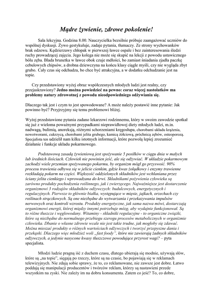 Mądre żywienie, zdrowe pokolenie! Sala lekcyjna. Godzina 8.00. Nauczycielka bezsilnie próbuje zaangażować uczniów do wspólnej dyskusji. Żywo gestykuluje, zadaje pytania, tłumaczy. Ze strony wychowanków brak odzewu. Kędzierzawy chłopak w pierwszej ławce ospale i bez zainteresowania śledzi ruchy prowadzącej zajęcia. Jego kolega nie może się skupić na lekcji z powodu ustawicznego bólu zęba. Blada brunetka w ławce obok czuje mdłości, bo zamiast śniadania zjadła paczkę cebulowych chipsów, a drobna dziewczyna na końcu klasy ciągle myśli, czy nie wygląda zbyt grubo. Cały czas się odchudza, bo chce być atrakcyjna, a w dodatku odchudzanie jest na topie. Czy przedstawiony wyżej obraz współczesnych młodych ludzi jest realny, czy przejaskrawiony? Jedno można powiedzieć na pewno: coraz więcej nastolatków ma problemy natury zdrowotnej z powodu nieodpowiedniego odżywiania się. Dlaczego tak jest i czym to jest spowodowane? A może należy postawić inne pytanie: Jak powinno być? Przyjrzyjmy się temu problemowi bliżej. Wyżej przedstawione pytania zadano lekarzowi rodzinnemu, który w swoim zawodzie spotkał się już z wieloma poważnymi przypadkami nieprawidłowej diety młodych ludzi, m.in. nadwagą, bulimią, anoreksją, różnymi schorzeniami kręgosłupa, chorobami układu krążenia, nowotworami, cukrzycą, chorobami jelita grubego, kamicą żółciową, próchnicą zębów, osteoporozą. Specjalista ten udzielił nam kilku istotnych informacji, które pozwolą lepiej zrozumieć działanie i funkcje układu pokarmowego. Podstawową zasadą żywieniową jest spożywanie 5 posiłków w ciągu dnia w małych lub średnich ilościach. Człowiek nie powinien jeść, ale się odżywiać. W układzie pokarmowym zachodzi wiele przemian spożywanego pokarmu, by organizm mógł go przyswoić. 90% procesu trawienia odbywa się w jelicie cienkim, gdzie kwas żołądkowy i enzymy trawienne rozkładają pokarm na części. Większość oddzielonych składników jest wchłaniana przez ściany jelita cienkiego i wprowadzana do krwi. Składnikami pożywienia człowieka są zarówno produkty pochodzenia roślinnego, jak i zwierzęcego. Najważniejsze jest dostarczenie organizmowi 3 rodzajów składników odżywczych: budulcowych, energetycznych i regulacyjnych. Pierwsze to głównie białka, występujące w mięsie, jajkach, orzechach czy roślinach strączkowych. Są one niezbędne do wytwarzania i przekazywania impulsów nerwowych oraz kontroli wzrostu. Produkty energetyczne, jak sama nazwa mówi, dostarczają organizmowi energii, której między innymi potrzebuje mózg, aby wydajnie funkcjonował. Są to różne tłuszcze i węglowodany. Witaminy - składniki regulacyjne - to organiczne związki, które są niezbędne do normalnego przebiegu szeregu procesów metabolicznych w organizmie człowieka. Dbanie o własne zdrowie wcale nie jest takie trudne, jak mogłoby się zdawać. Można mieszać produkty o różnych wartościach odżywczych i tworzyć przepyszne dania i przekąski. Dlaczego więc młodzież woli „fast foody”, które nie zawierają żadnych składników odżywczych, a jedynie nasycone kwasy tłuszczowe powodujące przyrost wagi? – pyta specjalista. Młodzi ludzie pragną iść z duchem czasu, dlatego ubierają się modnie, używają słów, które są „na topie”, sięgają po rzeczy, które są na czasie, bo pojawiają się w reklamach telewizyjnych. Nie zdają sobie sprawy, że to, co reklamowane, nie zawsze jest dobre. Łatwo poddają się manipulacji producentów i twórców reklam, którzy są nastawieni przede wszystkim na zyski. Nie zależy im na dobru konsumenta. Zatem co jeść? To, co dobre, szybkie w przyrządzeniu i modne, czy to, co naprawdę przynosi korzyści naszemu organizmowi? Pani Helena Sikora, dietetyk z wieloletnim stażem, poucza: Częstym błędem popełnianym przez młodych ludzi jest nieodpowiednie łączenie składników odżywczych. Jedzą to, co lubią, a nie to, co powinni jeść, dlatego spożywany przez nich posiłek nie zaspokaja podstawowych potrzeb organizmu. Stąd liczne wady rozwojowe kręgosłupa, szara cera, łatwo łamiące się paznokcie, wypadające włosy, problemy z koncentracją itp. Innym problemem jest zapominanie o śniadaniu, które jest podstawą. Organizm pozbawiony śniadania nie może być wydajny. Dzieci i młodzież , przychodząc do szkoły bez śniadania, nie są w stanie skupić się na lekcji, bo czują tzw. ssanie w żołądku. Głodu nie można oszukać!!!Jeżeli młodzi zainwestują w swój organizm teraz, zafundują sobie zdrową i pogodną starość. Wbrew pozorom racjonalne odżywianie się jest bardzo ważne. Może zaważyć nie tylko na zdrowiu, ale także na efektach podejmowanych przez nas działań. Dla przykładu ludzki mózg odżywia się glukozą, która jest w owocach i warzywach. W ciągu dnia potrzebuje on jedną filiżankę tego produktu. Problemy z koncentracją biorą się z niedożywienia i braku odpowiednich kwasów. Anoreksja i bulimia to choroby o podłożu psychicznym, których skutkiem jest zaburzenie odżywiania. Chorzy, którzy na nie cierpią, są często wykluczani ze środowiska, w którym żyją. Zła dieta zatem może decydować o sukcesie lub porażce naszych działań, o opinii innych ludzi na nasz temat czy własnej samoocenie. Dlatego każdy dzień rozpoczynajmy od solidnego śniadania. Niech nasze posiłki będą rozsądne, czyli w odpowiednich proporcjach i niech składają się, w miarę możliwości, ze starannie dobranych i sporządzanych produktów. Dzięki temu będziemy zdrowi i lepiej postrzegani przez otoczenie. Warto się zastanowić, co będzie naszym następnym posiłkiem, puste kalorie czy pożyteczne dla organizmu składniki. Mądre żywienie to zdrowe pokolenie. Zdrowe pokolenie to pokolenie ludzi sporadycznie korzystających z poradni lekarskich i aptek, sanatoriów, punktów rehabilitacyjnych itp. Zdrowe pokolenie to pokolenie lud