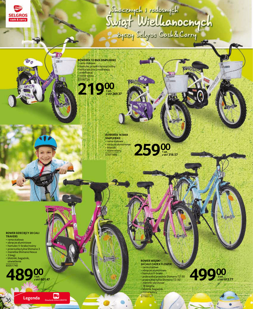 ROWEREK 12 BMX SIMPLEBIKE • rama stalowa • hamulec przedni ręczny/nożny • kółka boczne umożliwiają stabilizację • różne wzory 57596124 21900 1 szt. z VAT 269.37 ROWEREK 16 BMX SIMPLEBIKE • rama stalowa • obręcze aluminiowe • błotniki • różne wzory 57671406 ROWER DZIECIĘCY 20 CALI TRAVERS • rama stalowa • obręcze aluminiowe • hamulec V-brake/nożny • przerzutka tylna Shimano 3 • manetka Shimano Nexus • 3 biegi • błotniki, bagażnik, oświetlenie 65051740 48900 1 szt. z VAT 601.47 36 Legenda Dowóz do 30 km GRATIS! 25900 1 szt. z VAT 318.57 ROWER MIEJSKI 24 CALE CADEX FLOWER • rama stalowa • obręcze aluminiowe • hamulce V-brake • przerzutka przednia Shimano TZ-30 • przerzutka tylna Shimano TZ-50 • manetki obrotowe • 18 biegów • błotnik, bagażnik • różne kolory 57785727 49900 1 szt. z VAT 613.77