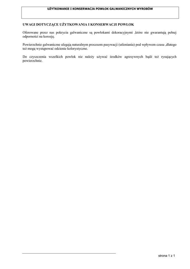 UŻYTKOWANIE I KONSERWACJA POWŁOK GALWANICZNYCH WYROBÓW UWAGI DOTYCZĄCE UŻYTKOWANIA I KONSERWACJI POWŁOK Oferowane przez nas pokrycia galwaniczne są powłokami dekoracyjnymi ,które nie gwarantują pełnej odporności na korozję. Powierzchnie galwaniczne ulegają naturalnym procesom pasywacji (utleniania) pod wpływem czasu ,dlatego też mogą występować odcienie kolorystyczne. Do czyszczenia wszelkich powłok nie należy używać środków agresywnych bądź też rysujących powierzchnie. strona 1 z 1