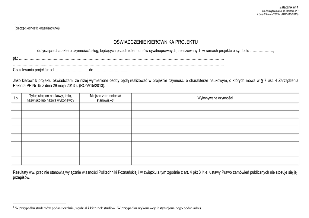 Załącznik nr 4 do Zarządzenia Nr 15 Rektora PP z dnia 29 maja 2013 r. (RO/V/15/2013) ………………………………. (pieczęć jednostki organizacyjnej) OŚWIADCZENIE KIEROWNIKA PROJEKTU dotyczące charakteru czynności/usług, będących przedmiotem umów cywilnoprawnych, realizowanych w ramach projektu o symbolu ………………., pt.: .………………………………………………………………………………..…………………………………………………………………… ……………………..……………………………………………………………………………………………………………….………………….. Czas trwania projektu: od ………………………. do …………………….... Jako kierownik projektu oświadczam, że niżej wymienione osoby będą realizować w projekcie czynności o charakterze naukowym, o których mowa w § 7 ust. 4 Zarządzenia Rektora PP Nr 15 z dnia 29 maja 2013 r. (RO/V/15/2013): Lp. Tytuł, stopień naukowy, imię, nazwisko lub nazwa wykonawcy Miejsce zatrudnienia/ stanowisko1 Wykonywane czynności Rezultaty ww. prac nie stanowią wyłącznie własności Politechniki Poznańskiej i w związku z tym zgodnie z art. 4 pkt 3 lit e. ustawy Prawo zamówień publicznych nie stosuje się jej przepisów. 1 W przypadku studentów podać uczelnię, wydział i kierunek studiów. W przypadku wykonawcy instytucjonalnego podać adres. Jako kierownik projektu oświadczam, że w projekcie będą realizowane następujące czynności/usługi nie mające charakteru naukowego, o których mowa w § 7 ust. 5 Zarządzenia Rektora PP Nr 15 z dnia 29 maja 2013 r. (RO/V/15/2013): Lp. Wykonywane czynności/usługi Wartość planowanych środków finansowych przeznaczonych na czynność/usługę w całym okresie realizacji projektu W stosunku do każdej z wymienionych czynności przed zawarciem umowy cywilno-prawnej zostanie przeprowadzone rozeznanie cenowe i sporządzony protokół z tego rozeznania. ……………………………………….... miejsce, data ZWERYFIKOWANO CHARAKTER CZYNNOŚCI ………………………………………………….. opiekun projektu ………………………..…………………… imię, nazwisko i podpis kierownika projektu
