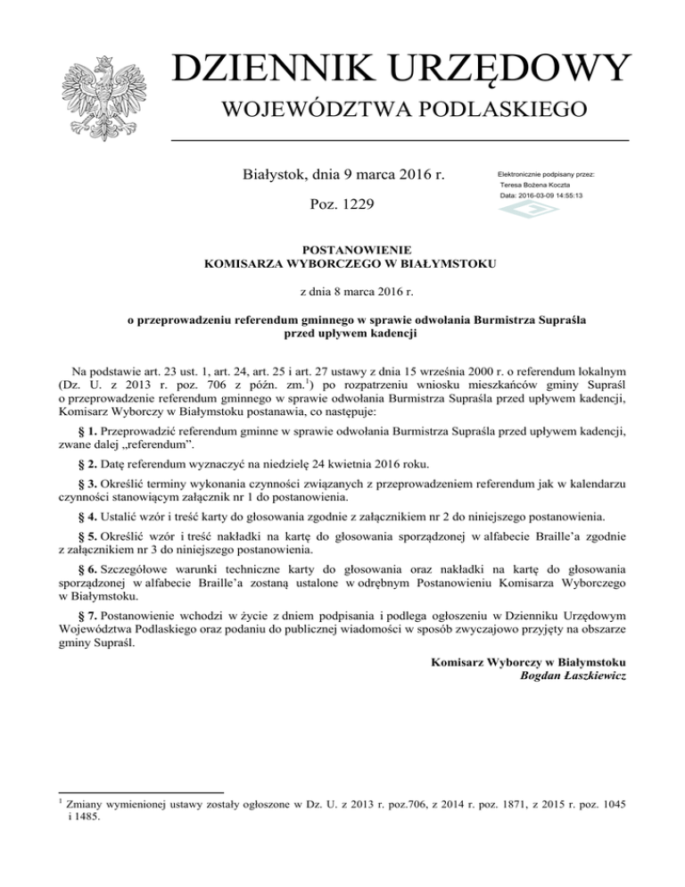 DZIENNIK URZĘDOWY WOJEWÓDZTWA PODLASKIEGO Białystok, dnia 9 marca 2016 r. Elektronicznie podpisany przez: Teresa Bożena Koczta Data: 2016-03-09 14:55:13 Poz. 1229 POSTANOWIENIE KOMISARZA WYBORCZEGO W BIAŁYMSTOKU z dnia 8 marca 2016 r. o przeprowadzeniu referendum gminnego w sprawie odwołania Burmistrza Supraśla przed upływem kadencji Na podstawie art. 23 ust. 1, art. 24, art. 25 i art. 27 ustawy z dnia 15 września 2000 r. o referendum lokalnym (Dz. U. z 2013 r. poz. 706 z późn. zm.1) po rozpatrzeniu wniosku mieszkańców gminy Supraśl o przeprowadzenie referendum gminnego w sprawie odwołania Burmistrza Supraśla przed upływem kadencji, Komisarz Wyborczy w Białymstoku postanawia, co następuje: § 1. Przeprowadzić referendum gminne w sprawie odwołania Burmistrza Supraśla przed upływem kadencji, zwane dalej „referendum”. § 2. Datę referendum wyznaczyć na niedzielę 24 kwietnia 2016 roku. § 3. Określić terminy wykonania czynności związanych z przeprowadzeniem referendum jak w kalendarzu czynności stanowiącym załącznik nr 1 do postanowienia. § 4. Ustalić wzór i treść karty do głosowania zgodnie z załącznikiem nr 2 do niniejszego postanowienia. § 5. Określić wzór i treść nakładki na kartę do głosowania sporządzonej w alfabecie Braille’a zgodnie z załącznikiem nr 3 do niniejszego postanowienia. § 6. Szczegółowe warunki techniczne karty do głosowania oraz nakładki na kartę do głosowania sporządzonej w alfabecie Braille’a zostaną ustalone w odrębnym Postanowieniu Komisarza Wyborczego w Białymstoku. § 7. Postanowienie wchodzi w życie z dniem podpisania i podlega ogłoszeniu w Dzienniku Urzędowym Województwa Podlaskiego oraz podaniu do publicznej wiadomości w sposób zwyczajowo przyjęty na obszarze gminy Supraśl. Komisarz Wyborczy w Białymstoku Bogdan Łaszkiewicz 1 Zmiany wymienionej ustawy zostały ogłoszone w Dz. U. z 2013 r. poz.706, z 2014 r. poz. 1871, z 2015 r. poz. 1045 i 1485. Dziennik Urzędowy Województwa Podlaskiego –2– Poz. 1229 Załącznik nr 1 do postanowienia Komisarza Wyborczego w Białymstoku z dnia 8 marca 2016 r. KALENDARZ CZYNNOŚCI związanych z przeprowadzeniem referendum w sprawie odwołania Burmistrza Supraśla Termin wykonywania czynności referendalnej*) do dnia 15 marca 2016 r. do dnia 25 marca 2016 r. do dnia 30 marca 2016 r. do dnia 31 marca 2016 r. do dnia 3 kwietnia 2016 r. do dnia 15 kwietnia 2016 r do dnia 19 kwietnia 2016 r Treść czynności referendalnej - ogłoszenie Postanowienia Komisarza Wyborczego w Białymstoku o przeprowadzeniu referendum gminnego w sprawie odwołania Burmistrza Supraśla przed upływem kadencji w Dzienniku Urzędowym Województwa Podlaskiego, - podanie do wiadomości mieszkańców gminy Supraśl Postanowienia Komisarza Wyborczego w Białymstoku o przeprowadzeniu referendum gminnego w sprawie odwołania Burmistrza Supraśla przed upływem kadencji, - podanie do publicznej wiadomości, w formie obwieszczenia, informacji o numerach i granicach obwodów głosowania oraz o wyznaczonych siedzibach obwodowych komisji do spraw referendum, w tym o siedzibie komisji właściwej dla głosowania korespondencyjnego i o lokalach dostosowanych do potrzeb osób niepełnosprawnych, - zgłoszenie Komisarzowi Wyborczemu w Białymstoku kandydatów na członków Miejskiej Komisji do Spraw Referendum, - powołanie przez Komisarza Wyborczego w Białymstoku Miejskiej Komisji do Spraw Referendum w Supraślu, - zgłoszenie Komisarzowi Wyborczemu w Białymstoku kandydatów na członków obwodowych komisji do spraw referendum, - sporządzenie w Urzędzie Miejskim w Supraślu spisu osób uprawnionych do udziału w referendum, - powołanie przez Komisarza Wyborczego w Białymstoku obwodowych komisji do spraw referendum, - zgłoszenie Burmistrzowi Supraśla przez wyborców niepełnosprawnych uprawnionych do udziału w referendum zamiaru głosowania korespondencyjnego, w tym przy pomocy nakładki na kartę do głosowania sporządzonej w alfabecie Braille, a, - składanie wniosków o sporządzenie aktu pełnomocnictwa do głosowania - składanie wniosków o dopisanie do spisu w wybranym przez siebie obwodzie głosowania, dnia 22 kwietnia 2016 r. o godz. 2400 zakończenie kampanii referendalnej, dnia 23 kwietnia 2016 r. przekazanie przewodniczącym obwodowych komisji do spraw referendum spisów osób uprawnionych do udziału w referendum, dnia 24 kwietnia 2016 r. godz. 700 - 2100 głosowanie *) Zgodnie z art. 9 § 2 ustawy z dnia 5 stycznia 2011 r. – Kodeks wyborczy (Dz. U. Nr 21, poz. 112 ze zm.) w związku z art. 1 ust.2 ustawy z dnia 15 września 2000 r. o referendum lokalnym (Dz. U. z 2013 r. poz. 706 z późn. zm.), – jeżeli koniec terminu wykonania czynności określonej w ustawie przypada na sobotę albo na dzień ustawowo wolny od pracy, termin upływa pierwszego roboczego dnia po tym dniu. Dziennik Urzędowy Województwa Podlaskiego –3– Poz. 1229 Załącznik nr 2 do postanowienia Komisarza Wyborczego w Białymstoku z dnia 8 marca 2016 r. Dziennik Urzędowy Województwa Podlaskiego –4– Poz. 1229 Załącznik nr 3 do postanowienia Komisarza Wyborczego w Białymstoku z dnia 8 marca 2016 r.