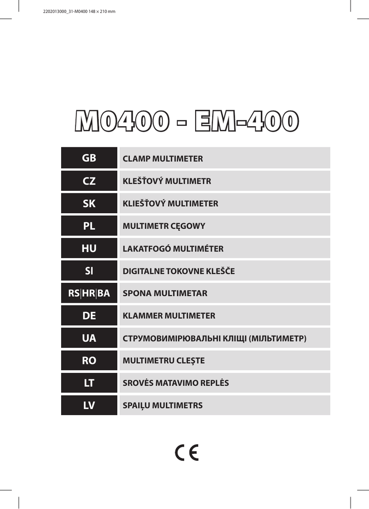 2202013000_31-M0400 148 × 210 mm M0400 - EM-400 GB CLAMP MULTIMETER CZ KLEŠŤOVÝ MULTIMETR SK KLIEŠŤOVÝ MULTIMETER PL MULTIMETR CĘGOWY HU LAKATFOGÓ MULTIMÉTER SI RS|HR|BA DIGITALNE TOKOVNE KLEŠČE SPONA MULTIMETAR DE KLAMMER MULTIMETER UA СТРУМОВИМІРЮВАЛЬНІ КЛІЩІ (МІЛЬТИМЕТР) RO MULTIMETRU CLEŞTE LT SROVĖS MATAVIMO REPLĖS LV SPAIĻU MULTIMETRS 1 EM-400 0-0-0-K GB EM400 – CLAMP MULTIMETER Before you start using the EM400, first read this user manual thoroughly. The manual highlights the most important areas concerning the safety of work. Follow the instructions to avoid any electric shock or damage to the appliance. The clamp multimeter was designed in compliance with the norm IEC-61010 about electric measurement appliances of category (CAT II 600V), safety class II and for pollution level 2. switch of measurement programme) during the very measurement! The appliance may get damaged. • When measuring the current, turn off the circuit’s power supply before connection the multimeter to it. Appliance description The clamp multimeter EM400 is from a series of compact appliances with 3 ¾ numeric display, designed to measure direct current and alternating voltage, direct current, resistance, diodes testing, acoustic tests of conductivity and circuits. The multimeter has an automatic range for value measurement. It indicated the trespass of the measured range. It has an automatic switch off function. The multimeter provides protection against overload and informs about low battery. Ideal use of the EM400 multimeter is in workshops, laboratories and households. Electric symbols alternating current (AC) direct current (DC) warning – study the manual before use electric shock hazard grounding European Conformity (CE) the appliance is protected with double isolation and reinforced isolation Technical parameters WARNING Display: LCD, 3999 (3 ¾ number) with automated polarity indication Measurement method: double descending integration with A/D converter Reading speed: 3× per second Clamp opening: 33 mm Max. measurable conduit: Ø 28 mm Operating temperature: 0 °C to 40 °C < 75 % Storage temperature: -10 °C to 50 °C, relative humidity < 85 % Power supply: 2× 1,5V AAA Weak battery: indication by a battery symbol on the display Range trespass indication:showing the number “OL“ on the LCD Measurement category: CAT II (600 V) Size and weight: 194 × 71 × 38 mm; 205 g (including the batteries) Follow especially these instructions: •Before starting to use the multimeter, check if the appliance is not damaged. If you discover any significant damage, do not perform any measurements! Check, if the multimeter surface is scratched and if the side joints are loose. •Check the insulation on the measurement probes and clamps. If the insulation is damaged, there is a risk of an electric shock. Do not use damaged measurement probes and clamps! • Do not measure voltage above 600 V, or current higher than 600 A! • Do not measure the current, if the idle voltage is higher than 250 V in an open circuit. • The terminal “COM“ must always be connected to the related measurement ground. • If you get anomalous readings, do not use the multimeter. If you are not sure, what is the cause of the malfunction, contact the service centre. • Do not measure higher voltage and currents, than those marked on the front panel of the multimeter and the clamps. There is a risk of an electric shock and damage to the multimeter! •Before using, check if the multimeter operates correctly. Test a circuit, where you already know the proper electric values. • Before connecting the multimeter to a circuit, where you want to measure the electric current, turn off the power supply of the given circuit. • Do not use or store the multimeter in an environment with high temperatures, dust and moisture. We do not recommend using the appliance in environments, where a strong magnetic field may occur or where there is a risk of a fire or an explosion. •When replacing the battery or another part of the multimeter, use the spare parts of the same type and specification. Before replacement, turn the multimeter off and disconnect from power source! • Do not alter or modify the internal circuitry of the multimeter! • Proceed with caution, when measuring voltage above 30 V AC rms, 42 V peak or 60 V DC. There is a risk of an electric shock! • When manipulating with the measurement points, make sure you hold them only behind the finger protection. • To avoid electric shock, do not touch any naked wire with your bare hands or skin. • Before opening the multimeter cover, disconnect the measurement point from the tested circuit. •Do not perform any measurement, if the cover of the multimeter is removed or loose. •As soon as the displays shows the depleted battery icon “ “, the battery needs to be replaced. Otherwise the measurement may be imprecise. This may lead to skewed measurement results and subsequent electric shock! CATII – measurement category II is for measurement on circuits connected directly to low voltage appliances. That is home appliances, mobile tools and suchlike. Do not use the multimeter to measure ranges in category III and IV! Frontal view of the multimeter 1. Lever - used to open and close the clamps. 2. Rotary switch - used to select the required function and to turn the measurement appliance on and off. When not using the measurement appliance, set this rotary switch to the OFF position. 3. Display 3 ¾ numeric LCD display with maximum measurable value 3999. 4. Clamp “COM“ - the connecting clamp for the black (negative) test conductor. - connecting clamp 5.Clamp for the red (positive) test conductor. 6.Button 1. During the function of measuring the resistance, current or voltage the button is used to toggle the automated range mode and manual range mode and to select the desired manual range. 2. During the function of diode test 