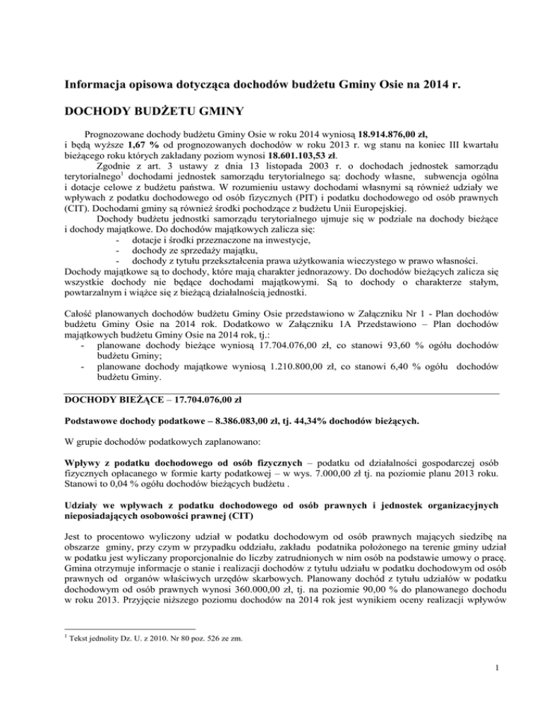 Informacja opisowa dotycząca dochodów budżetu Gminy Osie na 2014 r. DOCHODY BUDŻETU GMINY Prognozowane dochody budżetu Gminy Osie w roku 2014 wyniosą 18.914.876,00 zł, i będą wyższe 1,67 % od prognozowanych dochodów w roku 2013 r. wg stanu na koniec III kwartału bieżącego roku których zakładany poziom wynosi 18.601.103,53 zł. Zgodnie z art. 3 ustawy z dnia 13 listopada 2003 r. o dochodach jednostek samorządu terytorialnego1 dochodami jednostek samorządu terytorialnego są: dochody własne, subwencja ogólna i dotacje celowe z budżetu państwa. W rozumieniu ustawy dochodami własnymi są również udziały we wpływach z podatku dochodowego od osób fizycznych (PIT) i podatku dochodowego od osób prawnych (CIT). Dochodami gminy są również środki pochodzące z budżetu Unii Europejskiej. Dochody budżetu jednostki samorządu terytorialnego ujmuje się w podziale na dochody bieżące i dochody majątkowe. Do dochodów majątkowych zalicza się: - dotacje i środki przeznaczone na inwestycje, - dochody ze sprzedaży majątku, - dochody z tytułu przekształcenia prawa użytkowania wieczystego w prawo własności. Dochody majątkowe są to dochody, które mają charakter jednorazowy. Do dochodów bieżących zalicza się wszystkie dochody nie będące dochodami majątkowymi. Są to dochody o charakterze stałym, powtarzalnym i wiążce się z bieżącą działalnością jednostki. Całość planowanych dochodów budżetu Gminy Osie przedstawiono w Załączniku Nr 1 - Plan budżetu Gminy Osie na 2014 rok. Dodatkowo w Załączniku 1A Przedstawiono – Plan majątkowych budżetu Gminy Osie na 2014 rok, tj.: - planowane dochody bieżące wyniosą 17.704.076,00 zł, co stanowi 93,60 % ogółu budżetu Gminy; - planowane dochody majątkowe wyniosą 1.210.800,00 zł, co stanowi 6,40 % ogółu budżetu Gminy. dochodów dochodów dochodów dochodów DOCHODY BIEŻĄCE – 17.704.076,00 zł Podstawowe dochody podatkowe – 8.386.083,00 zł, tj. 44,34% dochodów bieżących. W grupie dochodów podatkowych zaplanowano: Wpływy z podatku dochodowego od osób fizycznych – podatku od działalności gospodarczej osób fizycznych opłacanego w formie karty podatkowej – w wys. 7.000,00 zł tj. na poziomie planu 2013 roku. Stanowi to 0,04 % ogółu dochodów bieżących budżetu . Udziały we wpływach z podatku dochodowego od osób prawnych i jednostek organizacyjnych nieposiadających osobowości prawnej (CIT) Jest to procentowo wyliczony udział w podatku dochodowym od osób prawnych mających siedzibę na obszarze gminy, przy czym w przypadku oddziału, zakładu podatnika położonego na terenie gminy udział w podatku jest wyliczany proporcjonalnie do liczby zatrudnionych w nim osób na podstawie umowy o pracę. Gmina otrzymuje informacje o stanie i realizacji dochodów z tytułu udziału w podatku dochodowym od osób prawnych od organów właściwych urzędów skarbowych. Planowany dochód z tytułu udziałów w podatku dochodowym od osób prawnych wynosi 360.000,00 zł, tj. na poziomie 90,00 % do planowanego dochodu w roku 2013. Przyjęcie niższego poziomu dochodów na 2014 rok jest wynikiem oceny realizacji wpływów 1 Tekst jednolity Dz. U. z 2010. Nr 80 poz. 526 ze zm. 1 w ostatnich miesiącach. Miesięczne wpływy z tego tytułu wynoszą ok. 32 tys. zł. Stanowi to 2,03 % ogółu dochodów bieżących budżetu . Udziały we wpływach z podatku dochodowego od osób fizycznych (PIT) Planowana kwota udziałów dla gminy Osie w roku 2014 wynosi 3.438.083,00 zł, stanowi to 19,42 % planowanych dochodów bieżących budżetu. W 2014 r. nastąpi spadek o 1,43 % w stosunku do planowanych dochodów z tego tytułu w roku 2013 r. Planowany poziom dochodu w roku 2013 wynosi 3.488.406,00 zł. Raty udziałów są przekazywane raz w miesiącu. Dochody za grudzień są przekazane w dwóch transzach – na początku miesiąca za miesiąc listopad oraz do 20 grudnia roku budżetowego 80 % kwoty przekazanej za listopad roku budżetowego, która zostanie rozliczona do dnia 20 stycznia roku następnego. Planowaną wysokość wpływów przyjęto w wysokości planowanej przez Ministra Finansów podanej w piśmie ST 3/4820/10/2013 z dnia 10 października 2013 r. Podatek rolny Zasady opodatkowania podatkiem rolnym reguluje ustawa z dnia 15 listopada 1984 r. o podatku rolnym2. Opodatkowaniu podatkiem rolnym podlegają grunty sklasyfikowane w ewidencji gruntów i budynków jako użytki rolne albo jako grunty zadrzewione i zakrzewione na użytkach rolnych. Podstawę opodatkowania podatkiem rolnym stanowi: a) dla gruntów tworzących gospodarstwo rolne – liczba hektarów przeliczeniowych, b) dla pozostałych gruntów – liczba hektarów fizycznych wynikająca z ewidencji gruntów i budynków. W ewidencji podatkowej figuruje 1520 osób fizycznych jako podatników podatku rolnego oraz 18 osób prawnych. W tej grupie ok. 600 osób prowadzi gospodarstwa rolne. Podatek rolny za rok podatkowy wynosi: a) od 1 ha przeliczeniowego gruntu w gospodarstwie rolnym równowartość pieniężną 2,5 q żyta, b) za 1 ha fizyczny w nieruchomościach nie stanowiących gospodarstwa rolnego – równowartość pieniężną 5 q żyta. W dniu 18 października 2013 r. Prezes Głównego Urzędu Statystycznego ogłosił, że średnia cena skupu żyta za okres 11 kwartałów wynosi 68,28 zł za 1 dt. Rada gminy skorzystała z uprawnień i obniżyła wskaźnik do kwoty 35 zł za 1 dt. Planowane dochody na 2013 r. zaplanowano na poziomie 133.000,00 zł, (100 tys. zł od osób fizycznych i 33 tys. zł od osób prawnych), tj. o 1,53 % więcej od planowanego dochodu w roku 2013. Stanowi to 0,75 % dochodów bieżących budżetu. Podatek od nieruchomości Pobierany jest na podstawie ustawy z dnia 12 stycznia 1991 r. o podatkach i opłatach lokalnych 3. Opodatkowaniu podlegają: - grunty niesklasyfikowane w ewidencji gruntów jako użytki rolne, - budynki - budowle zajęte na prowadzenie działalności gospodarczej. Stawki podatku s