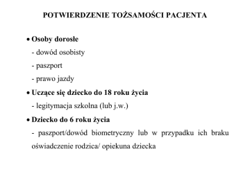 POTWIERDZENIE TOŻSAMOŚCI PACJENTA Osoby dorosłe - dowód osobisty - paszport - prawo jazdy Uczące się dziecko do 18 roku życia - legitymacja szkolna (lub j.w.) Dziecko do 6 roku życia - paszport/dowód biometryczny lub w przypadku ich braku oświadczenie rodzica/ opiekuna dziecka