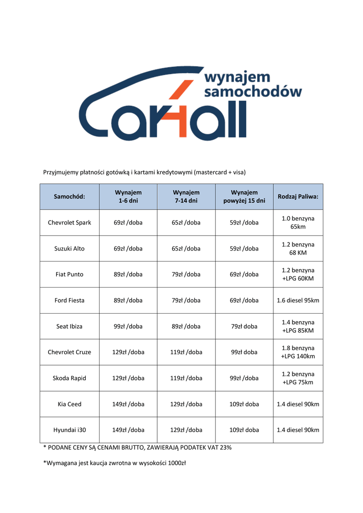 Przyjmujemy płatności gotówką i kartami kredytowymi (mastercard + visa) Samochód: Wynajem 1-6 dni Wynajem 7-14 dni Wynajem powyżej 15 dni Rodzaj Paliwa: Chevrolet Spark 69zł /doba 65zł /doba 59zł /doba 1.0 benzyna 65km Suzuki Alto 69zł /doba 65zł /doba 59zł /doba 1.2 benzyna 68 KM Fiat Punto 89zł /doba 79zł /doba 69zł /doba 1.2 benzyna +LPG 60KM Ford Fiesta 89zł /doba 79zł /doba 69zł /doba 1.6 diesel 95km Seat Ibiza 99zł /doba 89zł /doba 79zł doba 1.4 benzyna +LPG 85KM Chevrolet Cruze 129zł /doba 119zł /doba 99zł doba 1.8 benzyna +LPG 140km Skoda Rapid 129zł /doba 119zł /doba 99zł /doba 1.2 benzyna +LPG 75km Kia Ceed 149zł /doba 129zł /doba 109zł doba 1.4 diesel 90km Hyundai i30 149zł /doba 129zł /doba 109zł doba 1.4 diesel 90km * PODANE CENY SĄ CENAMI BRUTTO, ZAWIERAJĄ PODATEK VAT 23% *Wymagana jest kaucja zwrotna w wysokości 1000zł Obsługa poza godzinami pracy biura w godzinach 20-8 – dodatkowa opłata 39zł Wynajem samochodu w weekend (sobota-niedziela) – dodatkowa opłata 39 PLN Podstawienie samochodu: Dworzec Centralny Dworzzec Zachodni Doworzec Wschodni Dworzec Wileoski Dworzec Gdaoski Lotnisko Modlin Przy wynajmie 1-6 dni 49zł 49zł 49zł 49zł 49zł 59zł Zniesienie udziału w 1-6 dni 7-14 dni szkodzie Cena 19zł za dobę 15zł za dobę * zniesienia udziału w szkodzie zwalnia z opłaty kaucji 1000 PLN Fotelik dla dziecka Naiwgacja Dodatkowy kierowca Wyjazd po za granice kraju Podkładka /siedzisko dla dziecka Zwrot brudnego pojazdu CB radio Warunki najmu: - ukooczony 23 rok życia; - prawo jazdy kat B nie krócej niż 3 lata; - brak możliwości wyjazd za granice; 10zł doba 10zł doba 0zł 0zł 10zł doba 50zł 10zł doba Powyżej 7 dni: bezpłatnie bezpłatnie bezpłatnie bezpłatnie bezpłatnie bezpłatnie Powyżej 15 dni 10zł za dobę