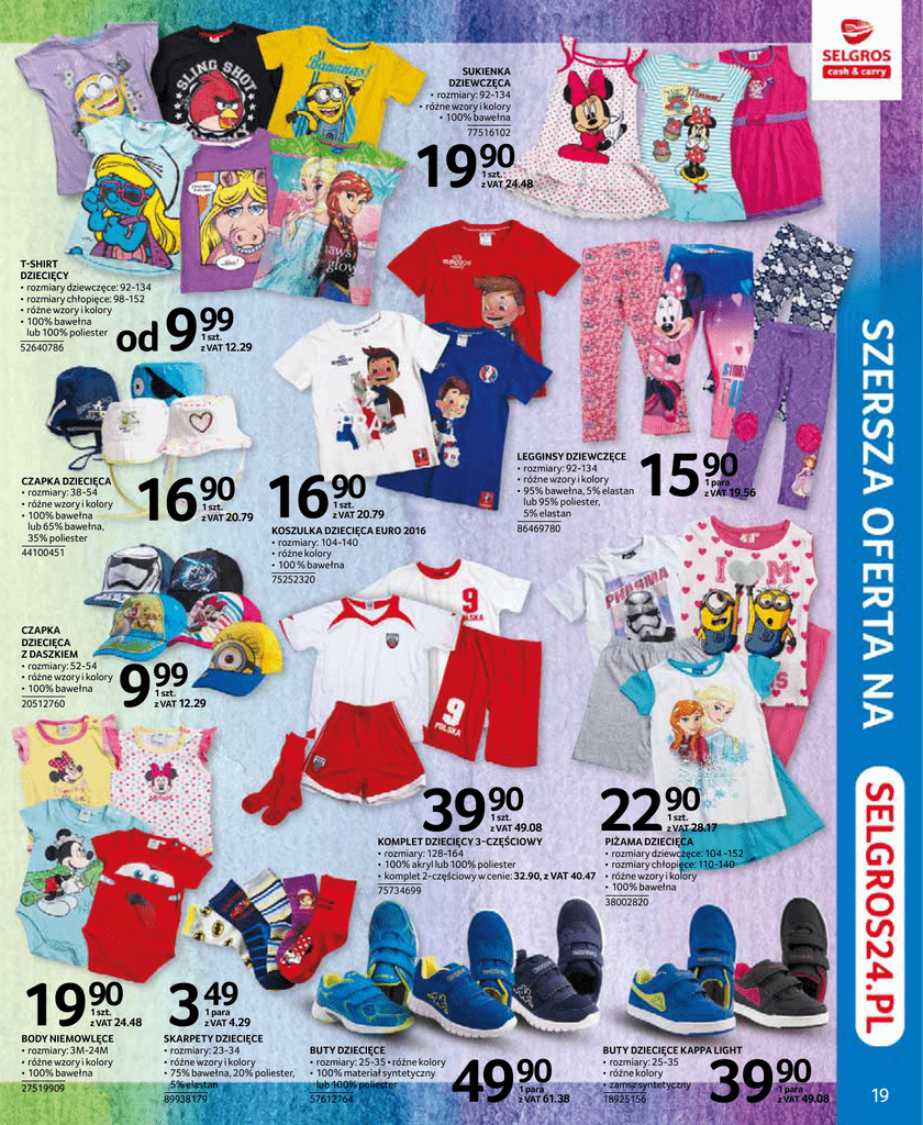 SUKIENKA DZIEWCZĘCA • rozmiary: 92-134 • różne wzory i kolory • 100% bawełna 77516102 1990 1 szt. z VAT 24.48 T-SHIRT DZIECIĘCY • rozmiary dziewczęce: 92-134 • rozmiary chłopięce: 98-152 • różne wzory i kolory • 100% bawełna lub 100% poliester 52640786 99 9 od CZAPKA DZIECIĘCA • rozmiary: 38-54 • różne wzory i kolory • 100% bawełna lub 65% bawełna, 35% poliester 44100451 CZAPKA DZIECIĘCA Z DASZKIEM • rozmiary: 52-54 • różne wzory i kolory • 100% bawełna 20512760 1 szt. z VAT 12.29 16 90 1 szt. z VAT 20.79 16 LEGGINSY DZIEWCZĘCE • rozmiary: 92-134 • różne wzory i kolory • 95% bawełna, 5% elastan lub 95% poliester, 5% elastan 86469780 90 1 szt. z VAT 20.79 KOSZULKA DZIECIĘCA EURO 2016 • rozmiary: 104-140 • różne kolory • 100 % bawełna 75252320 1590 1 para z VAT 19.56 999 1 szt. z VAT 12.29 39 90 1 szt. z VAT 49.08 KOMPLET DZIECIĘCY 3-CZĘŚCIOWY • rozmiary: 128-164 • 100% akryl lub 100% poliester • komplet 2-częściowy w cenie: 32.90, z VAT 40.47 75734699 22 90 1 szt. z VAT 28.17 PIŻAMA DZIECIĘCA • rozmiary dziewczęce: 104 -152 • rozmiary chłopięce: 110-140 • różne wzory i kolory • 100% bawełna 38002820 1990 349 1 szt. z VAT 24.48 BODY NIEMOWLĘCE • rozmiary: 3M-24M • różne wzory i kolory • 100% bawełna 27519909 1 para z VAT 4.29 SKARPETY DZIECIĘCE • rozmiary: 23-34 • różne wzory i kolory • 75% bawełna, 20% poliester, 5% elastan 89938179 BUTY DZIECIĘCE • rozmiary: 25-35 • różne kolory • 100% materiał syntetyczny lub 100% poliester 57612764 49 90 1 para z VAT 61.38 39 BUTY DZIECIĘCE KAPPA LIGHT • rozmiary: 25-35 • różne kolory • zamsz syntetyczny 18925156 90 1 para z VAT 49.08 19
