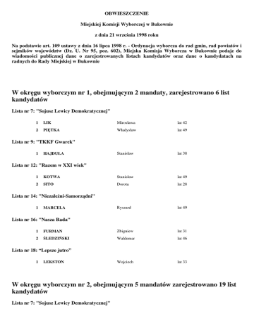 OBWIESZCZENIE Miejskiej Komisji Wyborczej w Bukownie z dnia 21 wrze nia 1998 roku Na podstawie art. 109 ustawy z dnia 16 lipca 1998 r. - Ordynacja wyborcza do rad gmin, rad powiatów i sejmików województw (Dz. U. Nr 95, poz. 602), Miejska Komisja Wyborcza w Bukownie podaje do wiadomo ci publicznej dane o zarejestrowanych listach kandydatów oraz dane o kandydatach na radnych do Rady Miejskiej w Bukownie W okr gu wyborczym nr 1, obejmuj cym 2 mandaty, zarejestrowano 6 list kandydatów Lista nr 7: "Sojusz Lewicy Demokratycznej" 1 LIK Mirosława lat 42 2 PI TKA Władysław lat 49 Stanisław lat 38 Lista nr 9: "TKKF Gwarek" 1 HAJDUŁA Lista nr 12: "Razem w XXI wiek" 1 KOTWA Stanisław lat 49 2 SITO Dorota lat 28 Ryszard lat 49 Zbigniew lat 31 Waldemar lat 46 Wojciech lat 33 Lista nr 14: "Niezale ni-Samorz dni" 1 MARCELA Lista nr 16: "Nasza Rada" 1 2 FURMAN LEDZI SKI Lista nr 18: “Lepsze jutro” 1 LEKSTON W okr gu wyborczym nr 2, obejmuj cym 5 mandatów zarejestrowano 19 list kandydatów Lista nr 7: "Sojusz Lewicy Demokratycznej" 1 KADŁUCZKA Zygmunt lat 56 2 KUBA SKA Zofia lat 59 3 LE Dyonizy lat 63 4 SKUBIS Eugeniusz lat 50 5 STRYCZEK Andrzej lat 45 Lista nr 8: "Przymierze Społeczne PSL-UP-KPEiR" 1 LOREK Małgorzata lat 50 2 JANOTA Marek lat 39 Lista nr 12: "Razem w XXI wiek" 1 BŁACHUT Halina lat 36 2 B CHÓR Bo ena lat 39 3 KONDEK Renata lat 49 Lista nr 13: Zarz d Zwi zku Zawodowego “KADRA” 1 KONDEK Wiesław lat 49 Maciej lat 51 Włodzimierz lat 63 Lista nr 14: "Niezale ni-Samorz dni" 1 SKUPIE Lista nr 15: "OSP" 1 PRUSAK Lista nr 16: "Nasza Rada" 1 KAPKOWSKA Halina lat 39 2 KRZTO Józefa lat 51 3 KUBA SKI Waldemar lat 44 4 RZO CA Krystyna lat 62 5 SARATOWICZ Janusz lat 44 Lista nr 17: "Stowarzyszenie Obro ców Bukowna" 1 PI TKA Stefan lat 46 Andrzej Marek lat 43 Zenon lat 47 Lista nr 18: "A.M.K." 1 KUBA SKI Lista nr 19: "ZS" 1 SIKORA Lista nr 20: "Nasza Przyszło " 1 MAKOWSKI Henryk lat 65 2 KLUCZEWSKI Adam lat 49 Lista nr 21: Komitet Wyborczy Krystyny Zacłony 1 ZACŁONA Krystyna lat 37 Barbara lat 61 Lista nr 22: "B.Ch-K" 1 CHECHELSKA-KOBOS Lista nr 23: Komitet Wyborczy pod nazw “Niezale ny” 1 WYCI LIK Stanisław lat 43 Lista nr 24: Komitet Wyborczy pod nazw “KA-MYK” 1 KRZEMIE Leszek lat 40 Marcin lat 25 Marian lat 53 Lista nr 25: "Wod ca Młodych" 1 LEDEMAN Lista nr 26: Komitet Wyborczy “Przyszło ” 1 ODIAS Lista nr 27: Komitet Wyborczy “Bukowno 2001” 1 ZI BA Jan lat 45 Mirosław lat 41 Lista nr 28: Komitet Wyborczy “Post p” 1 ZASTAWNIK W okr gu wyborczym nr 3, obejmuj cym 4 mandaty, zarejestrowano 15 list kandydatów Lista nr 7: "Sojusz Lewicy Demokratycznej" 1 GŁUSZCZY SKA El bieta lat 44 2 JA WI SKI Antoni lat 59 3 KRZYWA SKA Krystyna lat 52 4 W TROBI SKI Wojciech lat 56 Lista nr 8: "Przymierze Społeczne PSL-UP-KPEiR" 1 GAJDZISZEWSKI Jerzy lat 49 2 SPECJAŁ Janusz lat 57 3 JANIK Jan lat 38 Roland lat 44 4 WIKŁA Lista nr 9: "TKKF Gwarek" 1 FULBISZEWSKI Wacław lat 41 2 SKUBIS Leszek lat 32 Lista nr 10: "Unia Wolno ci" 1 ZBIEG Janusz Bogdan lat 44 2 KUBA SKI Stanisław lat 52 Lista nr 12: "Razem w XXI wiek" 1 CHOJOWSKI Arkadiusz lat 36 2 ŁASKAWIEC Alina lat 58 3 POR BSKA Bogusława lat 51 4 POR BSKI Józef lat 53 Lista nr 13: Zarz d Zwi zku Zawodowego “KADRA” 1 KASPERKIEWICZ Wacław lat 60 Lista nr 16: "Nasza Rada" 1 DERDA Leopold lat 52 2 LABISKO Jan lat 52 3 SZASTAK Małgorzata lat 47 4 URBA SKI Zbigniew lat 24 Lista nr 17: "Stowarzyszenie Obro ców Bukowna" 1 CEBO Izydor lat 68 2 MISKA Kazimierz lat 61 3 LOREK Janusz lat 63 4 JANTAS Krzysztof lat 31 Lista nr 18: Komitet Wyborczy “Z nami przyszło ” 1 HALISTA Czesław lat 46 Zbigniew lat 49 Lista nr 19: "MZ" 1 MUSZY SKI Lista nr 20: "Złote Miasto Dobra Rada" 1 MADERSKA Gra yna lat 46 Sławomir Marek lat 45 Krzysztof lat 31 Bronisław lat 64 Lista nr 21: "S.M.S." 1 SKAWI SKI Lista nr 22: "Reymonta - J.Krasickiego" 1 GLIBOWSKI Lista nr 23: Komitet Wyborczy “Dudek” 1 DUDEK Lista nr 24: Komitet Wyborczy “Marek Skawi ski” 1 SKAWI SKI Marek lat 25 W okr gu wyborczym nr 4, obejmuj cym 4 mandaty zarejestrowano 14 list kandydatów Lista nr 7: "Sojusz Lewicy Demokratycznej" 1 CUDNY Antoni lat 64 2 PACŁAWSKI Henryk lat 40 3 SPYRA Krzysztof lat 52 4 SZOTEK Zdzisław lat 46 Lista nr 8: "Przymierze Społeczne PSL-UP-KPEiR" 1 NABIAŁEK Tomasz lat 39 2 PAWUL Józef lat 52 Marek lat 37 Lidia lat 41 Lista nr 9: "TKKF Gwarek" 1 KANIA Lista nr 11: "Osiedlowy Komitet Wyborczy" 1 GRZANKA Lista nr 12: "Razem w XXI wiek" 1 PI TKA-BOGAJEWSKA Bo ena lat 36 2 ZAWADZKA Teresa lat 56 3 SKAŁKA Zofia lat 43 Lista nr 13: Zarz d Zwi zku Zawodowego “KADRA” 1 TOMCZYK Władysław lat 48 Lista nr 16: "Nasza Rada" 1 BANY Andrzej lat 40 2 POCZ SNY Zdzisław lat 49 3 SIKORA Marian lat 62 4 UREK Andrzej lat 56 Lista nr 18: Komitet Wyborczy Stanisława Chmury 1 CHMURA Lista nr 19: "Przyszło 1 Stanisław lat 42 Małgorzata lat 42 Janusz lat 28 Paweł lat 23 Złotej Miejscowo ci" KRZEMIE Lista nr 20: Komitet Wyborczy “Alfa” 1 D BEK Lista nr 21: Komitet Wyborczy “Młodzi” 1 WILK Lista nr 22: Komitet Wyborczy Bo eny Kucharek 1 KUCHAREK Bo ena lat 44 Dionizy lat 63 Lista nr 23: Komitet Wyborczy Starczynów 1 KASPERKIEWICZ Lista nr 24: Komitet Wyborczy pod nazw “Le na” 1 KIWIOR Władysław lat 62 W okr gu wyborczym nr 5, obejmuj cym 3 mandaty, zarejestrowano 13 list kandydatów Lista nr 7: "Sojusz Lewicy Demokratycznej" 1 HRABIA Zygmunt lat 60 2 IMIELSKI Jerzy lat 53 3 WIERCZ Marian lat 65 Lista nr 8: "Przymierze Społeczne PSL-UP-KPEiR" 1 HAGNO Włodzimierz lat 34 2 PYRZYK Marian lat 48 Barbara lat 33 Lista nr 9: "TKKF Gwarek" 1 KOWALCZYK Lista nr 12: "Razem w XXI wiek" 1 SZEWCZYK Marian lat 52 2 STRÓJ Krzysztof lat 49 Edward lat 47 Lista nr 14: "Niezale ni-Samorz dni" 1 SADOWSKI Lista nr 15: "OSP" 1 KAJDA Zdzisław lat 44 2 BARAN Jerzy lat 53 Lista nr 16: "Nasza Rada" 1 JAGLARZ Halina lat 59 2 SKOWRONEK Eugeniusz lat 60 3 W S Jan lat 51 Lista nr 17: "Stowarzyszenie Obro ców Bukowna" 1 TARNÓWKA Jan lat 52 2