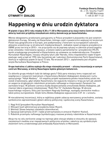 Fundacja Otwarty Dialog Al. J. Ch. Szucha 11a/21 00-580 Warszawa T: +48 22 307 11 22 Happening w dniu urodzin dyktatora W piątek 6 lipca 2012 roku między 8.30 a 11.00 w Warszawie przy stacji metra Centrum młodzi aktorzy teatralni przybliżą mieszkańcom stolicy demokrację po kazachstańsku. Wbrew obiegowemu przekonaniu panującemu w Polsce prezydent Łukaszenko nie jest ostatnim dyktatorem Europy. Od wielu lat Kazachstan, którego część o powierzchni większej niż terytorium Polski leży geograficznie w Europie, jest podejmowany z honorami na europejskich salonach, aktywnie uczestnicząc w strukturach międzynardowych. Jednakże nawet przejęcie prezydencji w OBWE przez ten kraj w 2010 r. nie przyczyniło się do poprawy sytuacji w zakresie przestrzegania praw człowieka i tolerowania opozycji, a kolejne wybory parlamentarne i prezydenckie (95,5% wynik urzędującego prezydenta) w Kazachstanie są uznawane za niedemokratyczne. Prezydent Nursułatan Nazarbajew, noszący oficjalny tytuł Lider Narodu, który niepodzielnie rządzi krajem piastując swój urząd od 1990 roku (wcześniej jak I sekretarz Komunistycznej Partii Kazachstanu), skończy w najbliższy piątek (6 lipca) 72 lata. Na wrzesień 2012 r. zaplanowana jest oficjalna wizyta Nursułtana Nazarbajewa w Polsce. Grupa teatralna z Lublina szykuje dla niego niezwykły prezent - uliczną inscenizację w samym centrum Warszawy, w której Nazarbajew będzie głównym bohaterem. Co skłoniło grupę młodych ludzi do takiego gestu? Otóż parę miesięcy temu rozpoczęli oni współpracę z reżyserem teatralnym z Kazachstanu Bołatem Atabajewem działaczem ruchu opozycyjnego "Halyk Maidany". Ich wspólny projekt wystawienia polsko-kazachskiej sztuki nie został zrealizowany, gdyż władze Kazachstanu nie wypuściły reżysera z kraju po tym jak udzielił on wsparcia strajkującym robotnikom przemysłu naftowego w miejscowości Żanaozen (na zachodzie kraju). W połowie czerwca służby bezpieczeństwa aresztowały Bołata Atabajewa, jak również lidera organizacji młodzieżowej "Rukh Pen Til" Żanbołata Mamaja. W obronie kazachskiego reżysera, który jest laureatem Nagrody Goethego, wystąpiły niemieckie media a także polscy europosłowie. Dzięki temu Bołata Atabajewa wypuszczono 3.07. br. z aresztu. W niecodziennej inscenizacji, którą w najbliższy piątek zobaczą warszawscy przechodnie, zostaną symbolicznie zaprezentowani główni aktorzy politycznej i społecznej sceny Kazachstanu: 1. Nagi Król (prezydent Nursułtan Nazarbajew), 2. Milicjant (szef administracji prezydenta Asłan Musin), 3. Wolność Słowa (więzieni niezależni dziennikarze), 4. Opozycja (zatrzymany 23.01 i nadal przetrzymywany w areszcie Vladimir Kozlov), 5. Robotnik przemysłu naftowego (symbolizujący masowe protesty robotników w Kazachstanie). Akcja ma na celu zwrócenie uwagi na represje jakie stosuje władza w stosunku do opozycji, niezależnych mediów oraz niepoprawnych politycznie artystów i zakończy się symbolicznym złożeniem tortu urodzinowego pod ambasadą Kazachstanu w Warszawie. Przedstawicieli mediów i wszystkich zainteresowanych serdecznie zapraszamy do wzięcia udziału w inscenizacji. KRÓL JEST NAGI – happening grupy teatralnej z Lublina Miejsce i data – metro Centrum (Warszawa) 6 lipca 2012. 8.30-11.45 Obsada: Król - prezydent Kazachstanu Nursułtan Nazarbajew, dożywotni Lider Narodu. Policjant - szef administracji prezydenta Asłan Musin (prawdopodobnie wydał rozkaz strzelania do strajkujących robotników w Żanaozenie w grudniu 2011 roku, w rezultacie czego zginęło co najmniej 16 osób). Ofiary: Wolność Słowa (symbolizuje więzionych niezależnych dziennikarzy) Vladimir Kozlov (przetrzymywany w areszcie od stycznia b.r. lider partii "Alga" , symbolizuje opozycję w Kazachstanie) Robotnik przemysłu naftowego (symbolizuje ludzi protestujących w Kazachstanie, w szczególności robotników przemysłu naftowego na zachodzie kraju; w dn. 16-18 grudnia 2011 roku w wyniku brutalnej pacyfikacjji przez milicję i siły bezpieczeństwa zginęło 16 osób, a wg. nieoficjalnych danych - ponad 80). AKT I Miejsce akcji: Przed wejściem do stacji metra Centrum o godz. 8:30 Król razem z Policjantem pojawiają się z zaklejonymi ustami i zaczynają przywiązywać dziesięciometrowym grubym sznurem trzy Ofiary do latarni. Ofiary symbolizujące Wolność Słowa, Opozycję i Protestujących Obywateli również mają zaklejone usta. Król siedzi przed wielką tacą, na której rozłożono mapę Kazachstanu a na niej postawiono tort urodzinowy . W bitej śmietanie zanurzono znicze z fotografiami autentycznych ofiar reżimu. Dwóch fotografów, również z zaklejonymi ustami, robi zdjęcia królowi z tortem. Składają mu pokłon (symbol próżności prezydenta). Igor Vinyavsky (redaktor naczelny opozycyjnej gazety "Vzglyad" aresztowany w styczniu w związku z aktywną postawą obywatelską, szczególnie dotyczącą wyjaśniania pacyfikacji przez policję protestów w Żanaozen i zwolniony w kwietniu na mocy amnestii w rezultacie działań Parlamentu Europejskiego) i Lyudmyla Kozlovska (Fundacja Otwarty Dialog) będą zachęcać przechodniów do uwolnienia Ofiar przy użyciu nożyczek. W końcu udaje się przeciąć sznury opasające . Przesłanie: Dzięki ludzkiej solidarności europejskiej społeczności, w tym Polaków, możliwa jest pomoc społeczeństwu obywatelskiemu w Kazachstanie. AKT II - około godziny 11:00 Król, Policjant oraz uwolnione Ofiary zabierają tort i udają się do metra. Z przesiadkami w transporcie miejskim docierają do wrót ambasady Kazachstanu w Polsce. AKT III - około godziny 11:45 Próba wręczenia tortu urodzinowego dla prezydenta Nazarbajewa na ręce pracowników ambasady Kazachstanu, przy ulicy Królowej Marysieńki 14. W celu otrzymania bardziej szczegółowych informacji prosimy o kontakt: Lyudmyla Kozlovska, Fundacja "Otwarty Dialog" [email protected] +48 507 739 025 facebook.com/Ope