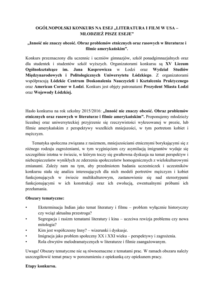 OGÓLNOPOLSKI KONKURS NA ESEJ „LITERATURA I FILM W USA – MŁODZIEŻ PISZE ESEJE” „Inność nie znaczy obcość. Obraz problemów etnicznych oraz rasowych w literaturze i filmie amerykańskim”. Konkurs przeznaczony dla uczennic i uczniów gimnazjów, szkół ponadgimnazjalnych oraz dla studentek i studentów szkół wyższych. Organizatorami konkursu są XV Liceum Ogólnokształcące im. Jana Kasprowicza w Łodzi oraz Wydział Studiów Międzynarodowych i Politologicznych Uniwersytetu Łódzkiego. Z organizatorami współpracują Łódzkie Centrum Doskonalenia Nauczycieli i Kształcenia Praktycznego oraz American Corner w Łodzi. Konkurs jest objęty patronatami Prezydent Miasta Łodzi oraz Wojewody Łódzkiej. Hasło konkursu na rok szkolny 2015/2016: „Inność nie znaczy obcość. Obraz problemów etnicznych oraz rasowych w literaturze i filmie amerykańskim”. Proponujemy młodzieży licealnej oraz uniwersyteckiej przyjrzenie się rzeczywistości wykreowanej w prozie, lub filmie amerykańskim z perspektywy wszelkich mniejszości, w tym portretom kobiet i mężczyzn. Tematyka społeczna związana z rasizmem, mniejszościami etnicznymi borykającymi się z różnego rodzaju zagrożeniami, w tym wyginięciem czy asymilacją imigrantów wydaje się szczególnie istotna w świecie, w którym toczy się gwałtowna dyskusja na temat perspektyw i niebezpieczeństw wynikłych ze zderzenia społeczeństw homogenicznych z wielokulturowymi zmianami. Zależy nam na tym, aby przedmiotem badania uczestniczek i uczestników konkursu stała się analiza interesujących dla nich modeli portretów mężczyzn i kobiet funkcjonujących w świecie multikulturowym, zastanowienie się nad stereotypami funkcjonującymi w ich konstrukcji oraz ich ewolucją, ewentualnymi próbami ich przełamania. Obszary tematyczne: • • • • • Eksterminacja Indian jako temat literatury i filmu – problem wyłącznie historyczny czy wciąż aktualna przestroga? Segregacja i rasizm tematami literatury i kina – uczciwa rewizja problemu czy nowa mitologia? Kim jest współczesny Inny? – wizerunki i dyskusje. Imigracja jako problem społeczny XX i XXI wieku – perspektywy i zagrożenia. Rola chwytów melodramatycznych w literaturze i filmie zaangażowanym. Uwaga! Obszary tematyczne nie są równoznaczne z tematami prac. W ramach obszaru należy uszczegółowić temat pracy w porozumieniu z opiekunką czy opiekunem pracy. Etapy konkursu. Konkurs przebiega w dwóch etapach: • I stopień - etap uczelniany (praca pisemna) • II stopień - etap ogólnopolski (egzamin ustny i obrona pracy pisemnej) Etap I – szkolny/uczelniany. Uczestniczki i uczestnicy przygotowują samodzielnie pracę pisemną (ok. 8 stron maszynopisu dla uniwersytetów i liceów, czcionka 12, Times New Roman, interlinia 1,5), związaną z wybranymi tekstami literackimi bądź filmem. Prace należy złożyć w wersji papierowej i elektronicznej do przedstawicieli uczelnianej komisji. Prace niespełniające kryteriów samodzielności (np. skopiowane z internetu lub przepisane z książek) będą dyskwalifikowane. Cytaty muszą być opatrzone stosownym przypisem mówiącym, z jakiego źródła pochodzi. Pracę należy również wyposażyć w bibliografię. Dopuszcza się napisanie pracy w języku angielskim. O wyborze tematu pracy, jej formie i zakresie materiałów decydują uczestnicy i uczestniczki w porozumieniu z opiekunką/opiekunem, przygotowującą/ym ją/ ich do konkursu. Termin składania prac: 8 stycznia 2015 roku. Komisja uczelniana dokonuje oceny prac za pomocą sześciostopniowej skali ocen szkolnych, według ogólnie przyjętych kryteriów oceny pracy pisemnej z literatury, zwracając szczególną uwagę na twórczy wkład studentki/studenta w opracowanie zagadnienia. Studentki/studenci, których prace zostaną ocenione na stopień „celująca” lub „bardzo dobra”, zostają zgłoszeni przez uczelnię do udziału w etapie centralnym. Do zgłoszenia należy dołączyć pracę pisemną, jej krótką, kilkuzdaniową recenzję oraz wykaz dowolnie wybranych lektur z zakresu literatury uzupełniającej (3 pozycje) na egzamin ustny. Studentki/studenci mogą również zaproponować lektury spoza listy. Etap II – ogólnopolski Powołana przez Komitet Organizacyjny Konkursu, komisja centralna złożona z pracowniczek/ów naukowych Wydziału Stosunków Międzynarodowych i Politologicznych Uniwersytetu Łódzkiego, doradczyń/ów metodycznych, przedstawicielki/a American Corner oraz nauczycielek/i XV Liceum Ogólnokształcącego w Łodzi dokona oceny nadesłanych prac. O wynikach oceny oraz zakwalifikowaniu do finału ustnego – uczestniczki i uczestnicy oraz ich placówki edukacyjne zostaną powiadomieni oddzielnym pismem wysłanym emailem (adres e-mailowy musi być podany w zgłoszeniu). Finał ustny obejmuje: • • Rozmowę na temat samodzielnie przygotowanej pracy pisemnej. Odpowiedź na pytanie z zakresu wiedzy ogólnej, związanej z tematyką konkursu - na podstawie literatury podstawowej. Wypowiedź na temat wybranych lektur (3 pozycje); O ostatecznym wyniku uczestnika w konkursie decyduje łączna ocena z pracy pisemnej oraz odpowiedzi ustnej w finale centralnym. Szczegółowe informacje na temat konkursu wraz z listą lektur i filmów znajdują się na stronie KFA (bieżące wydarzenia i ogłoszenia). Terminarz konkursu: - 10 grudnia 2015r.: zgłoszenie udziału w konkursie (na adres [email protected]) - 8 stycznia 2016r.: złożenie prac konkursowych do uczelnianej komisji konkursowej - 29 stycznia 2016r.: przesłanie wyników I etapu konkursu do centralnego Komitetu Organizacyjnego - 18 marca 2016r.: finał ustny i zakończenie konkursu. Komisja uczelniana: przewodnicząca: dr hab. Katarzyna Więckowska członkowie komisji: dr hab. Edyta Lorek-Jezińska dr Jarosław Hetman mgr Sława Krasińska mgr Nelly Strehlau